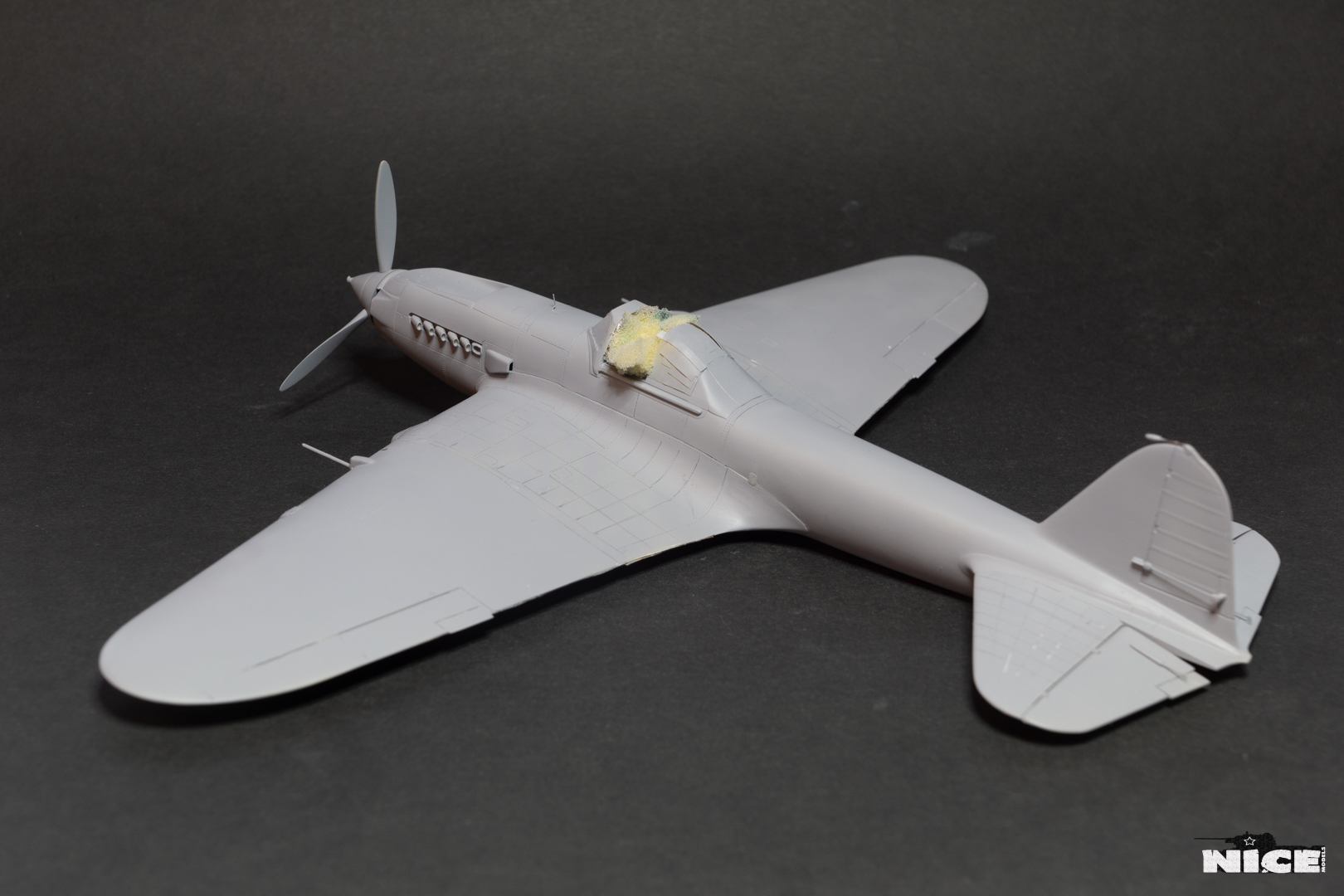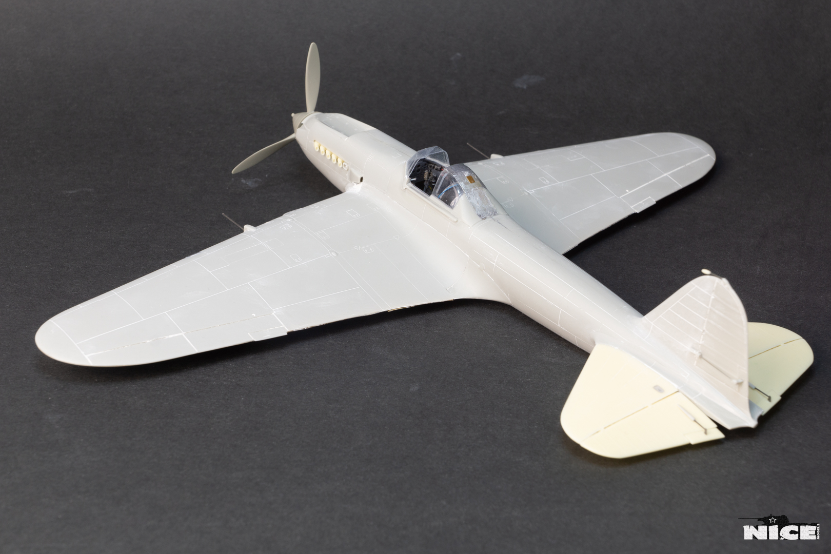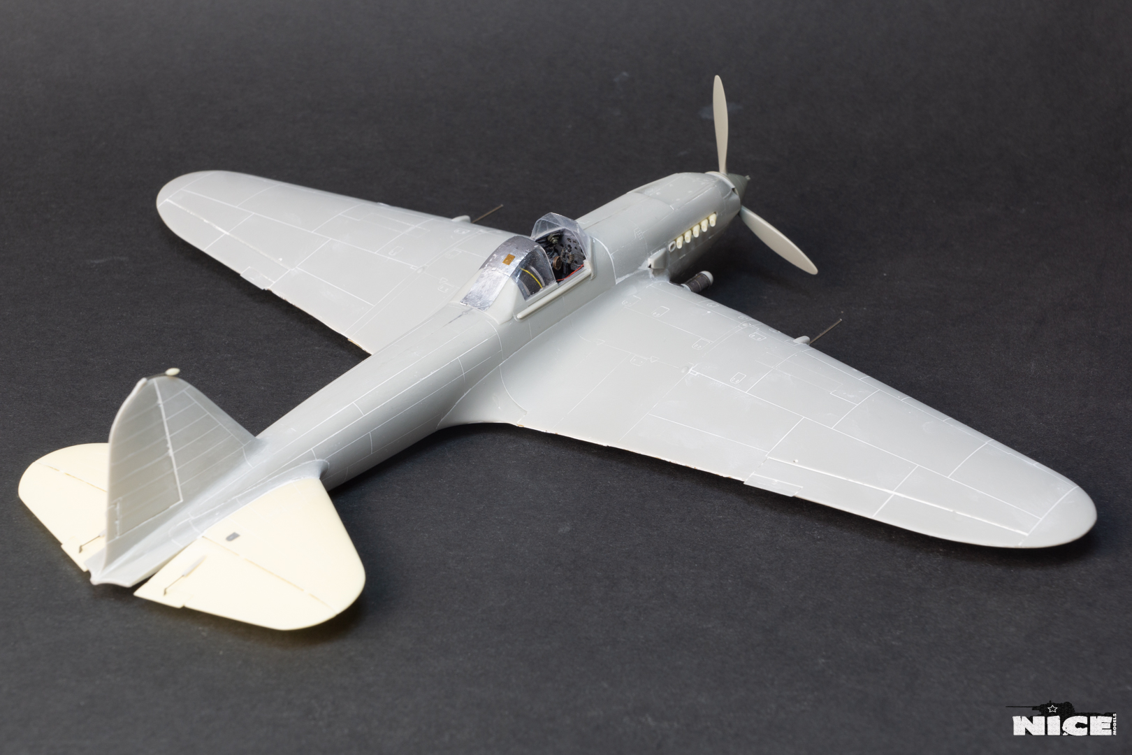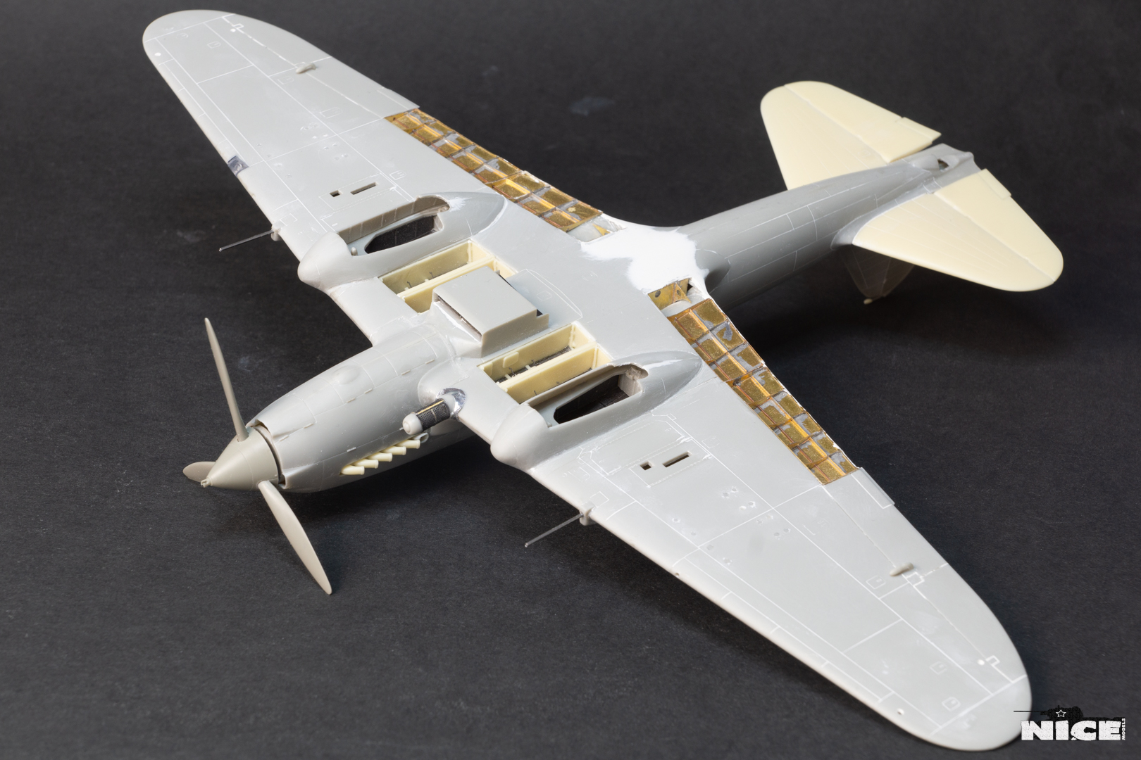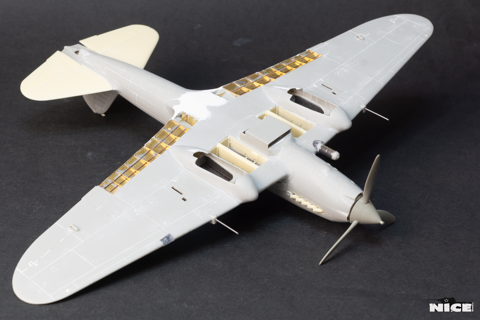 Вакуумный фонарь , а точнее задняя его часть не подошла к пластику, пришлось стачивать ребра на родном и потом его полировать. Заодно добавил броненакладку из фольги и травленый лючек. Установил смоляные стабилизаторы. В наборе даны два левых/или правых, пришлось все это дело исправлять. Добавил тяги к тримерам. Сделал фару с лампочкой. Установил балансир на РН. Ну и , естественно , заменил стволы пушек на иглы. И самое главное- замазал все стыки на крыльях и фюзеляже т.к. у меня вариант с деревянным хвостом и крыльями. Травленые закрылки предназначенные для Тамии встали неплохо) На фото можете видеть шпатлевку на стыке между закрылками. Добавил петли на лючках капота.