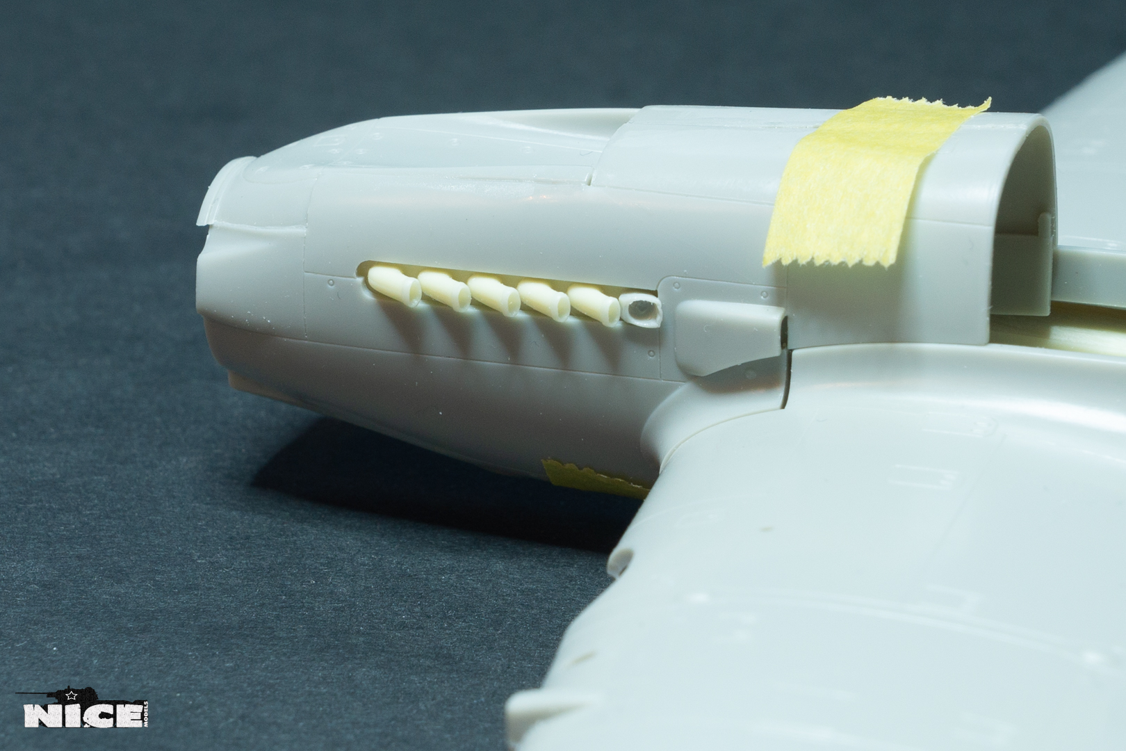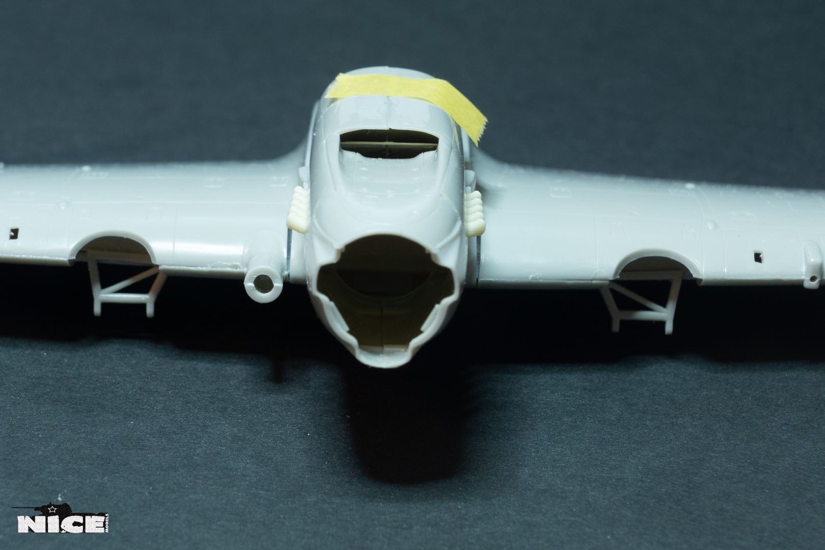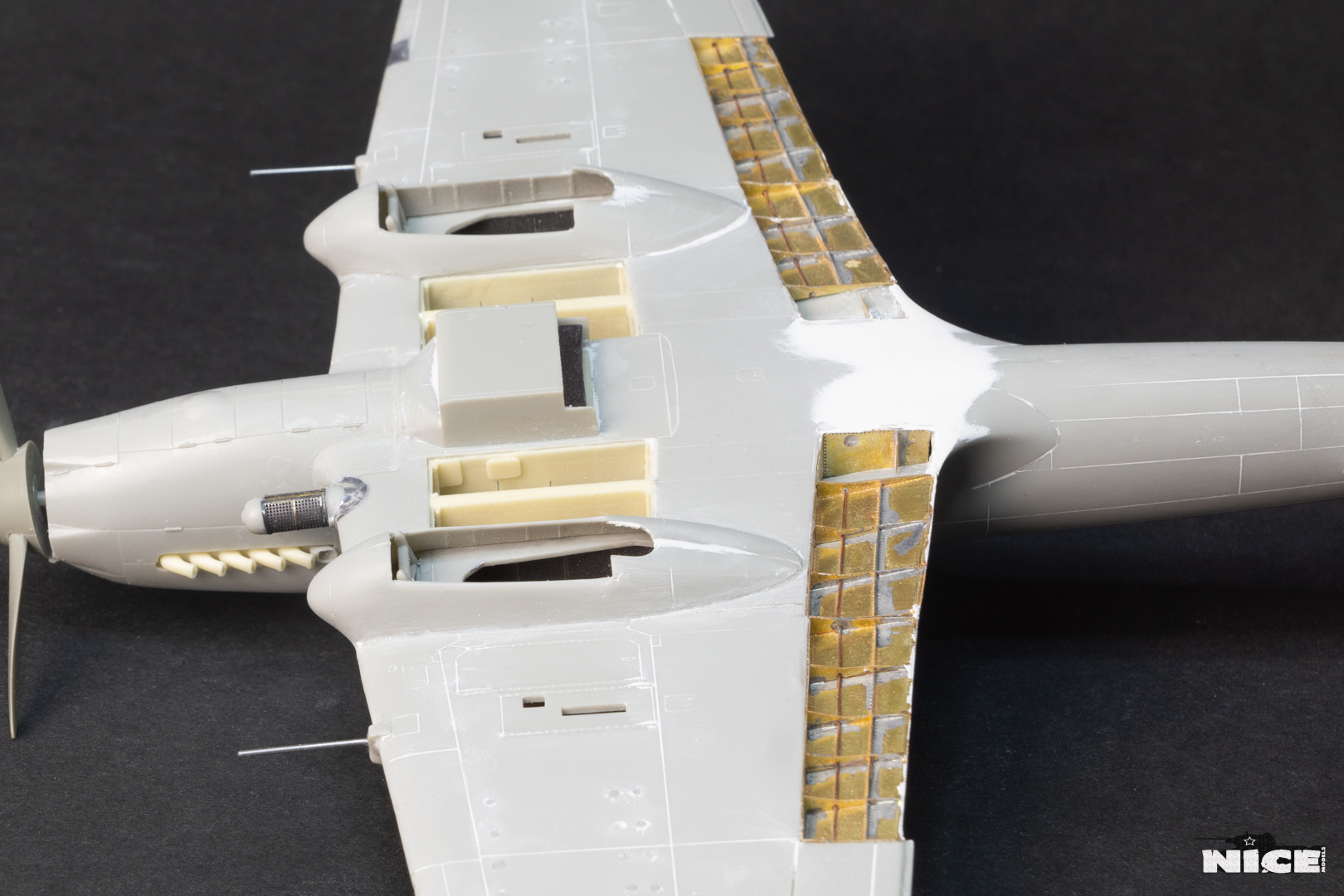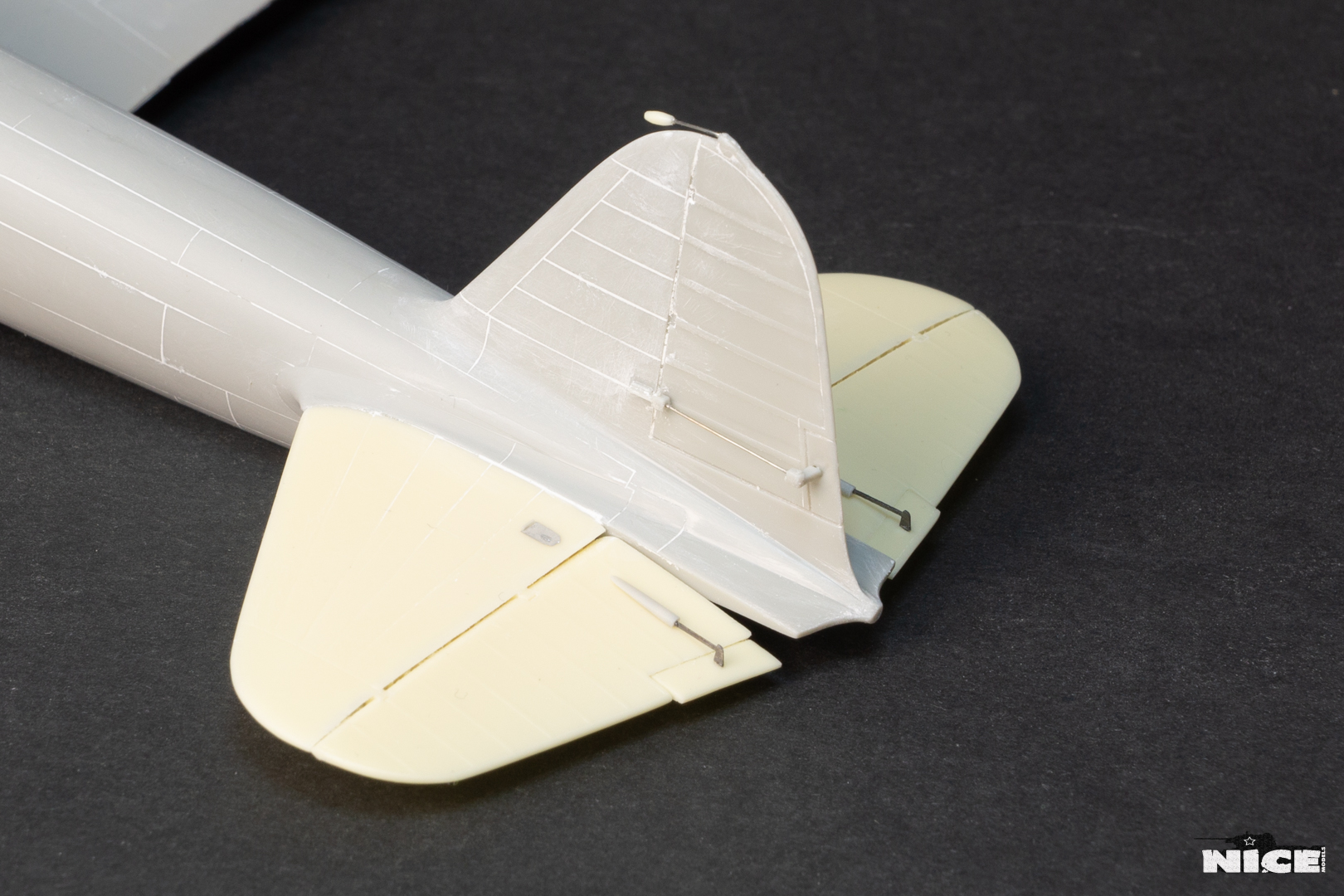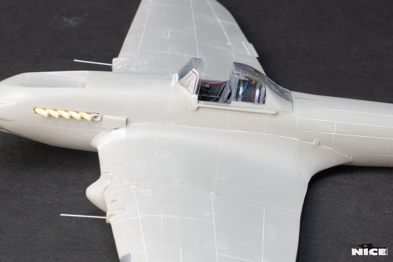 Вакуумный фонарь , а точнее задняя его часть не подошла к пластику, пришлось стачивать ребра на родном и потом его полировать. Заодно добавил броненакладку из фольги и травленый лючек. Установил смоляные стабилизаторы. В наборе даны два левых/или правых, пришлось все это дело исправлять. Добавил тяги к тримерам. Сделал фару с лампочкой. Установил балансир на РН. Ну и , естественно , заменил стволы пушек на иглы. И самое главное- замазал все стыки на крыльях и фюзеляже т.к. у меня вариант с деревянным хвостом и крыльями. Травленые закрылки предназначенные для Тамии встали неплохо) На фото можете видеть шпатлевку на стыке между закрылками. Добавил петли на лючках капота.
