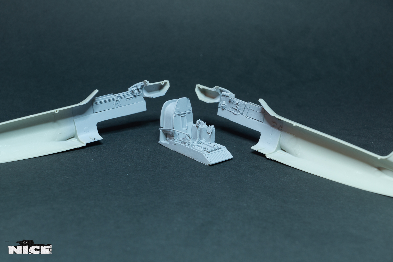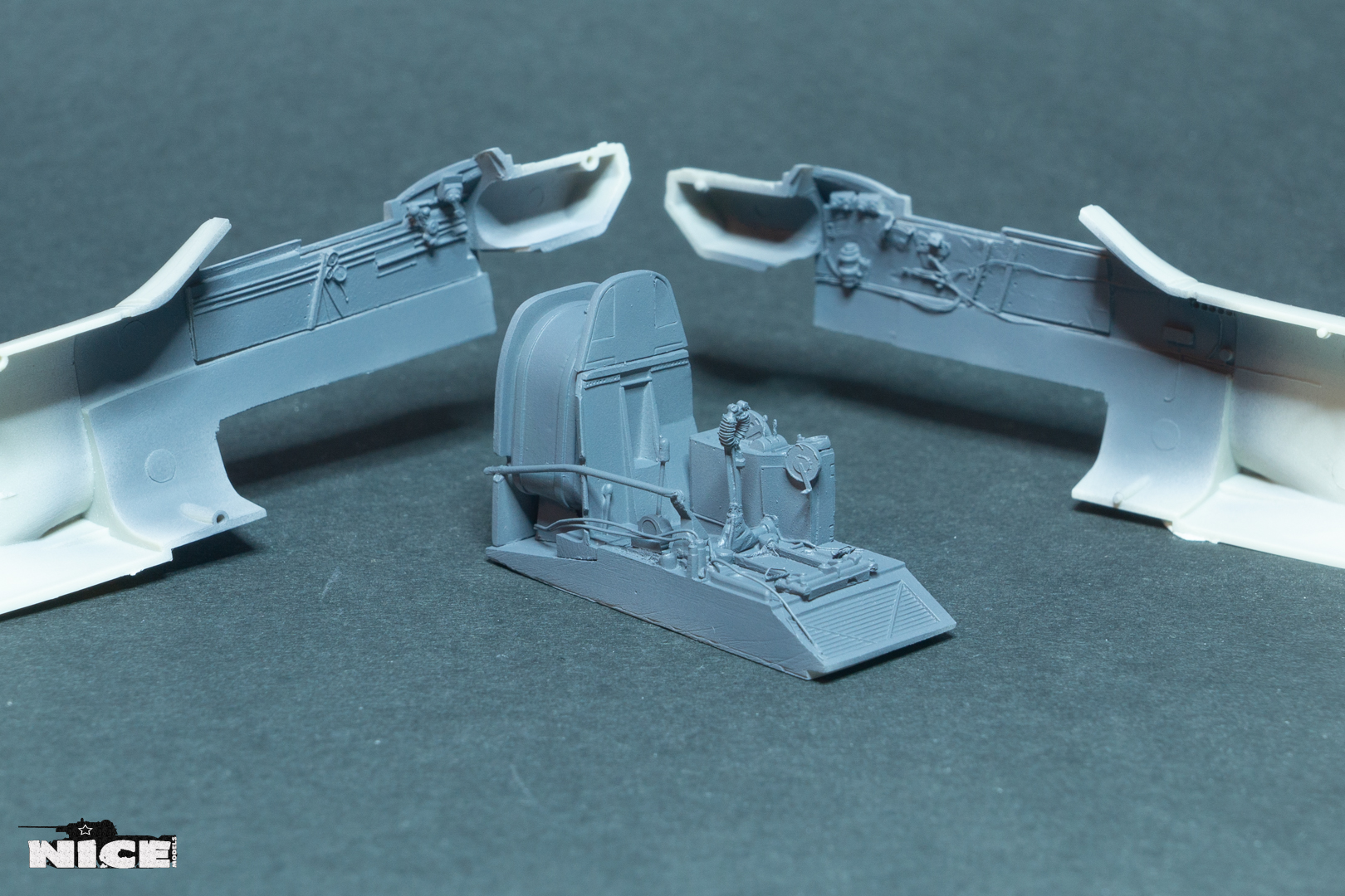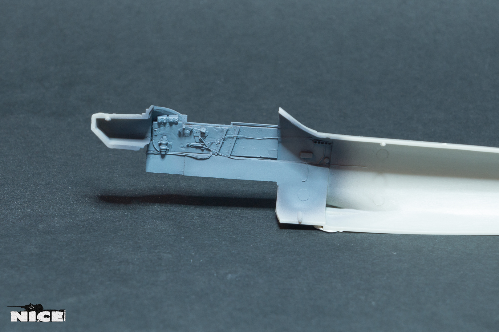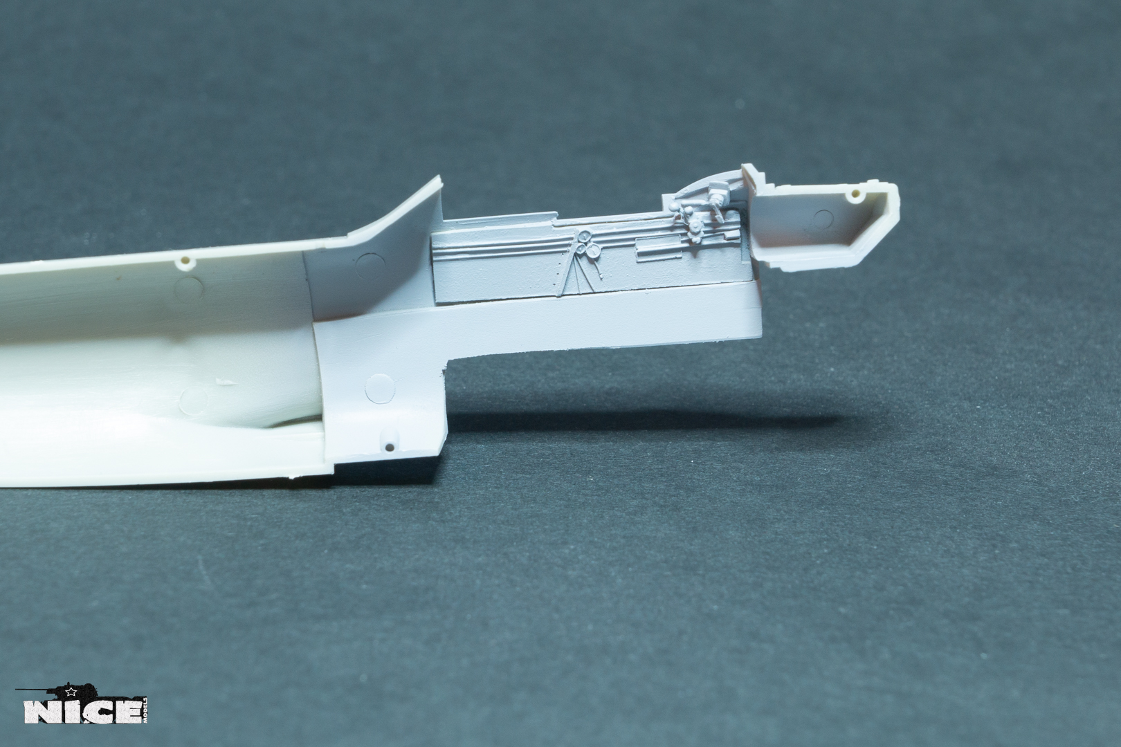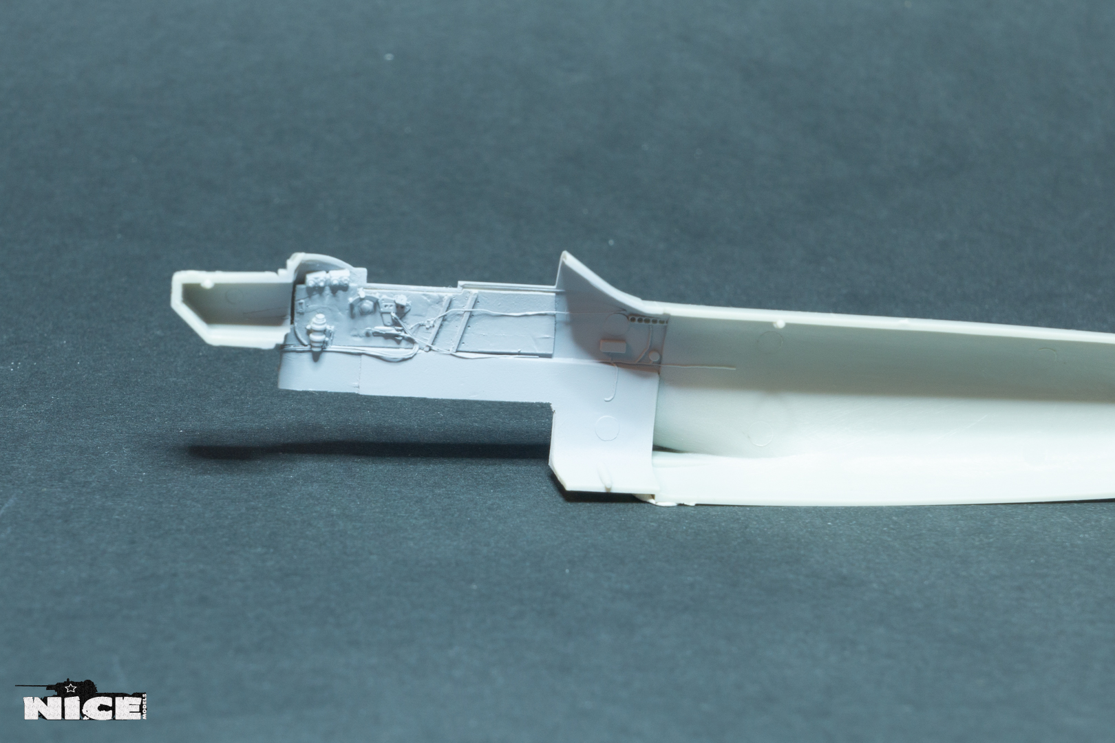переделал расположение приборов по правому борту. Установил смоляные патрубки, в наборе почему то не нашел два коротких патрубка. Пришлось рассверливать китовые. Сточил направляющую для воздуха в носовом воздухозаборнике. Вырезал пластик под посадочные щитки. Установил травленый силовой набор в нишах шасси. Срезал боковинки на фюзеляже т.к. смоляной кокпит мешает установки фюзеляжа. Установил консоли крыла. Не обошлось без щелей.