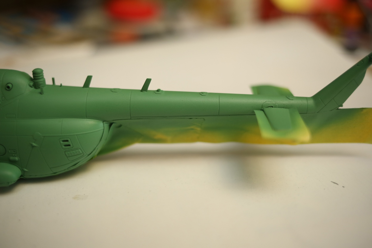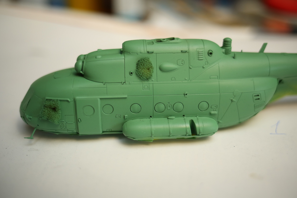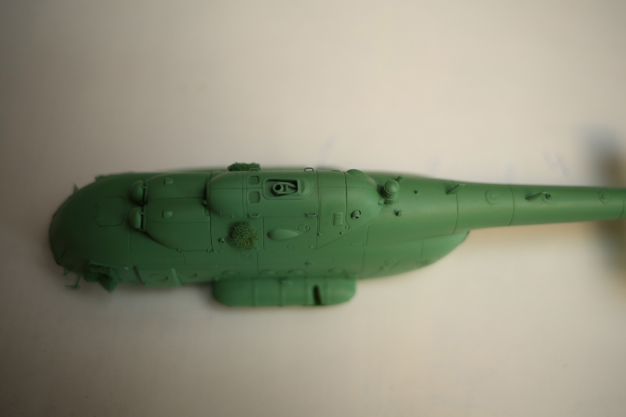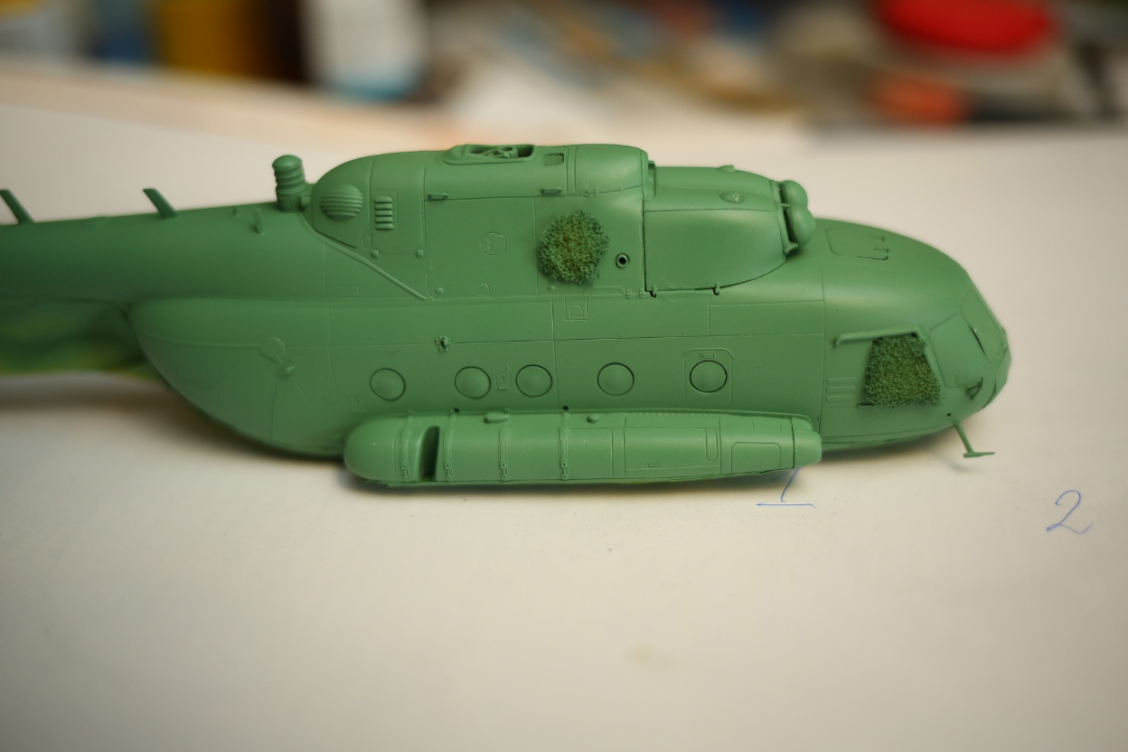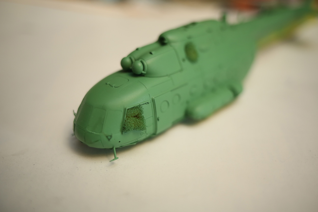 Блин, нравится мне хоббибосовская модель... По мне так прекрасная геометрия, правильная форма остекления и расшивка, очень заметная уже сейчас, глубокая, хорошая! Вертолёт очень узнаваем... Зелёный пока что лёг хорошо! Очень постараюсь и дальше не испоганить! Пока мне самому очень нравится!
