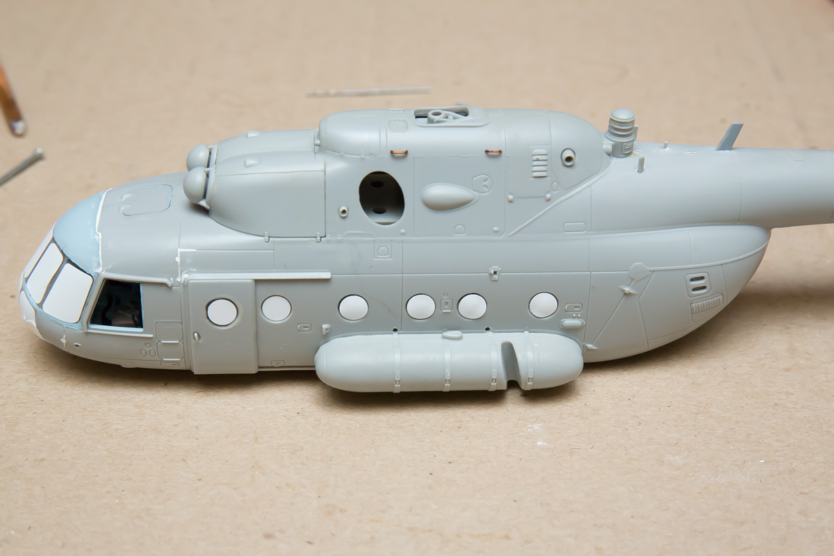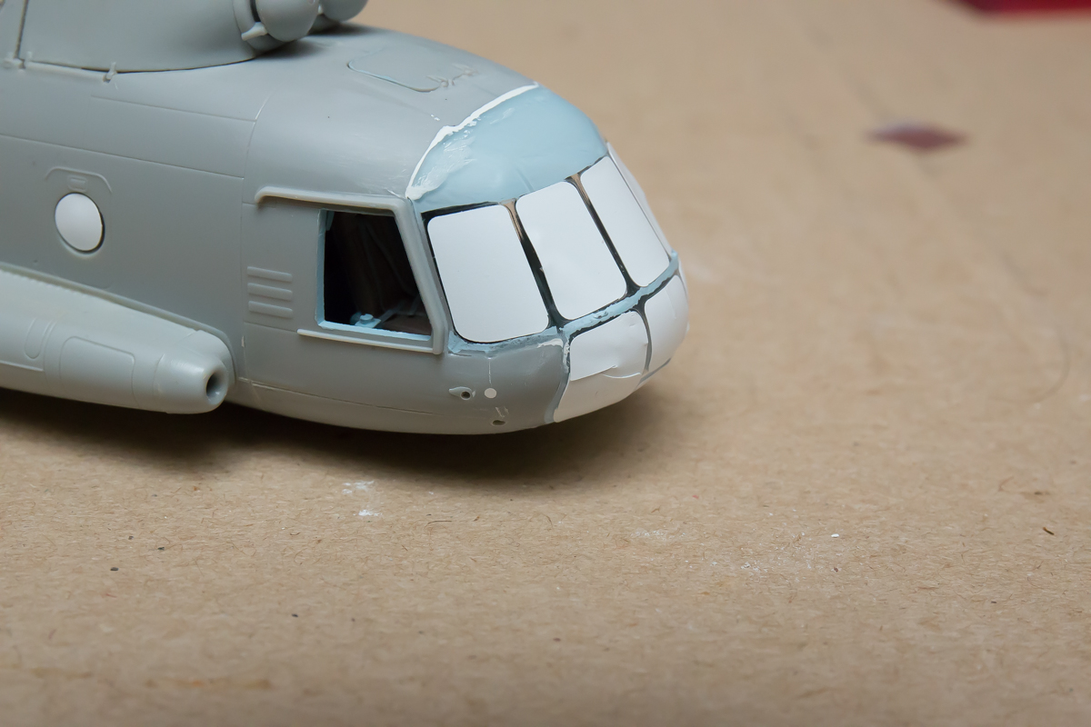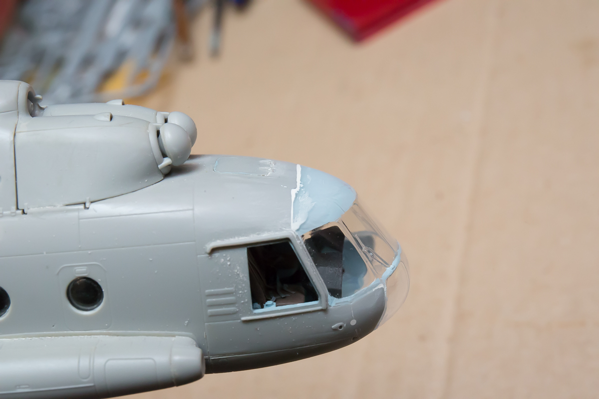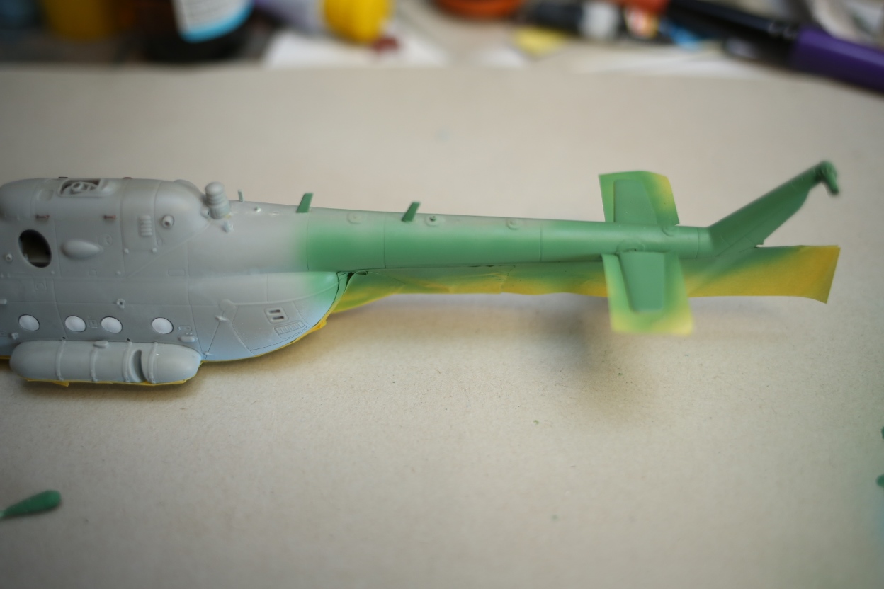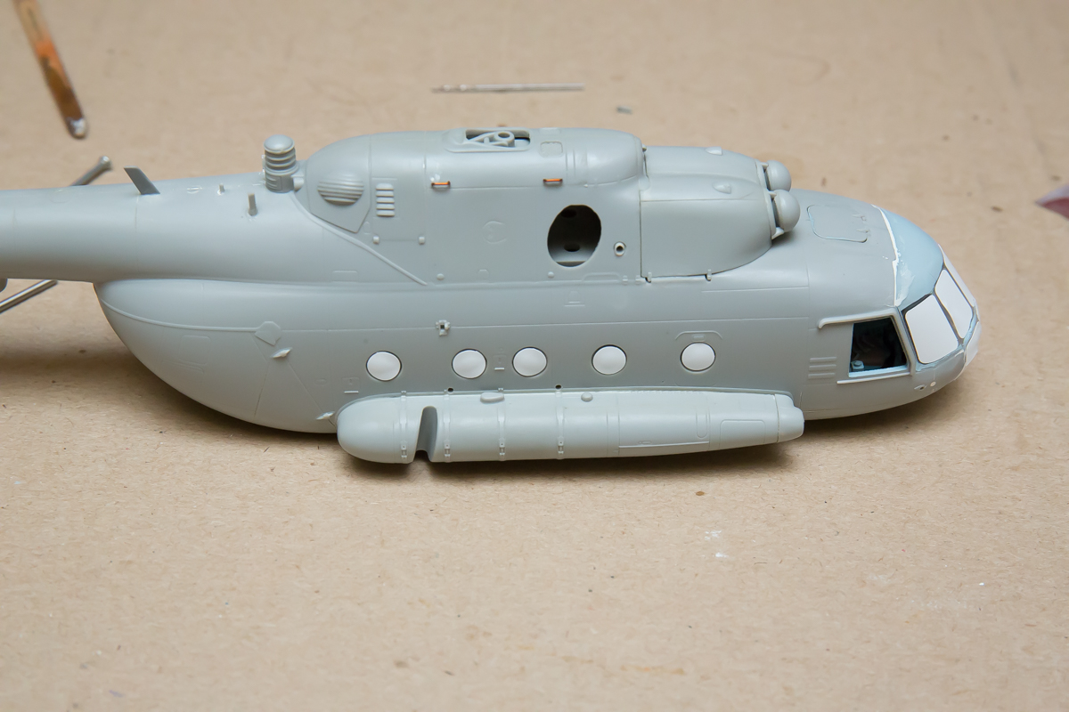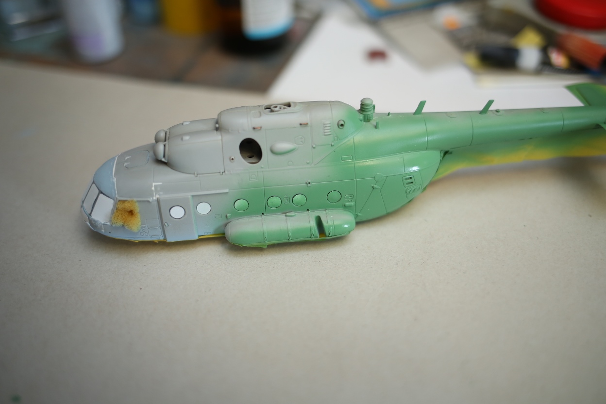 Блин, нравится мне хоббибосовская модель... По мне так прекрасная геометрия, правильная форма остекления и расшивка, очень заметная уже сейчас, глубокая, хорошая! Вертолёт очень узнаваем... Зелёный пока что лёг хорошо! Очень постараюсь и дальше не испоганить! Пока мне самому очень нравится!
