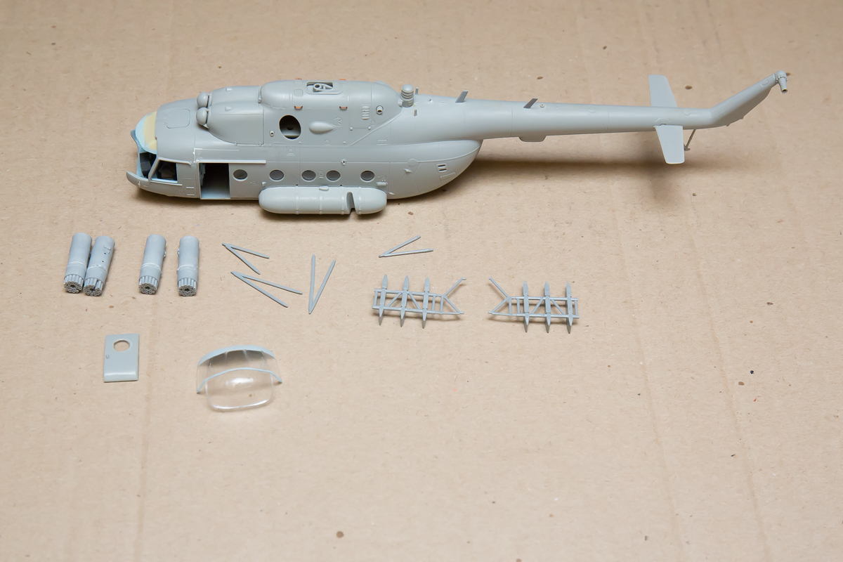 Не помню, почему, оставил родные кресла из набора, на которые добавил приаязные ремни из тамиевской ленты. Зачем на остеклении нанесён частично голубой цвет? Дело в том, что "потолок" неомеговской кабины слишком низок и "заходил" на остекление, торчал и был виден в верхние "окошки" остекления. Мне нужно было видеть, где уже заканчивается "стекло" и где начинается фюзеляж. Поэтому покрасил голубым. В остальном, не знаю, нет ничего особо интересного. Старался аккуратнее собрать, зачистить, восстановить местами утраченную расшивку. Добавил чуть хорошо виднеющихся на вертолёте поручней из проволки - на фото видно. Будут резиновые колса от Экипажа. И блоки НАР от Арматы. Есть "техничка" от Бегемота. Что ещё... не знаю, больше, пожалуй, нечего рассказать. Впереди самое, на мой взгляд, интересное.
