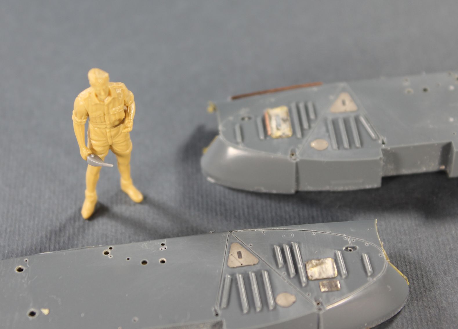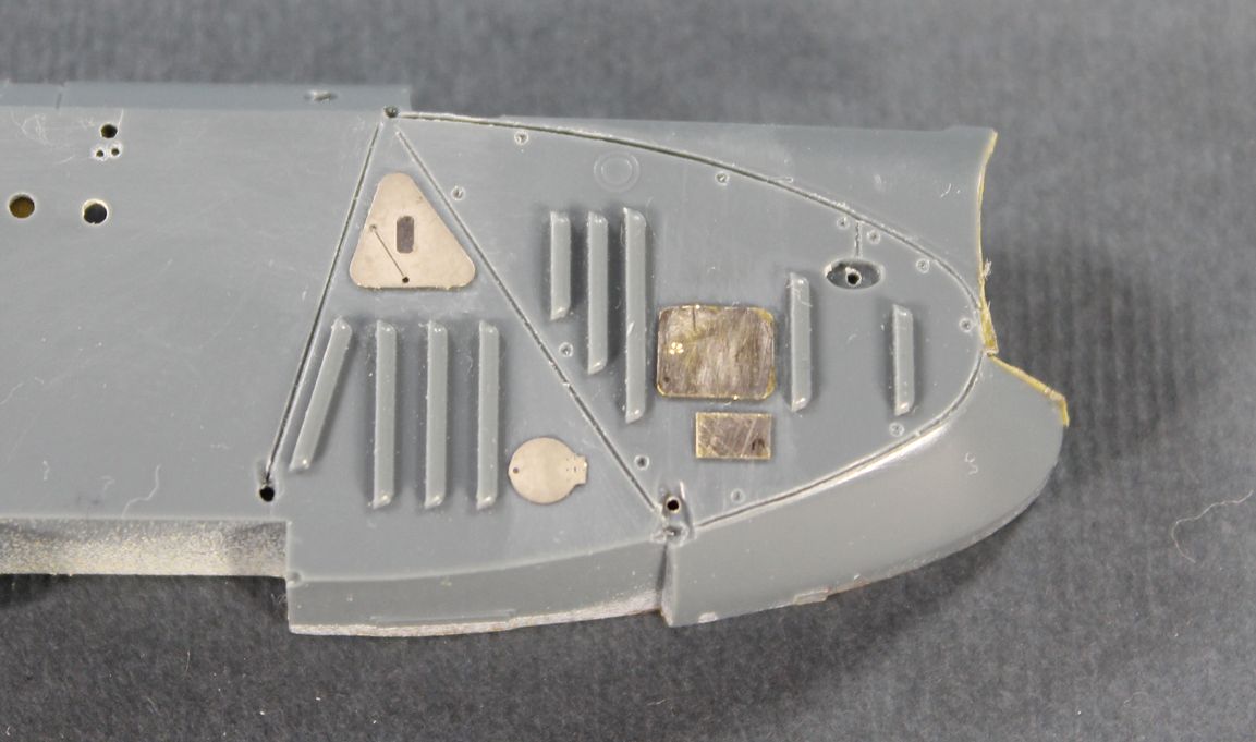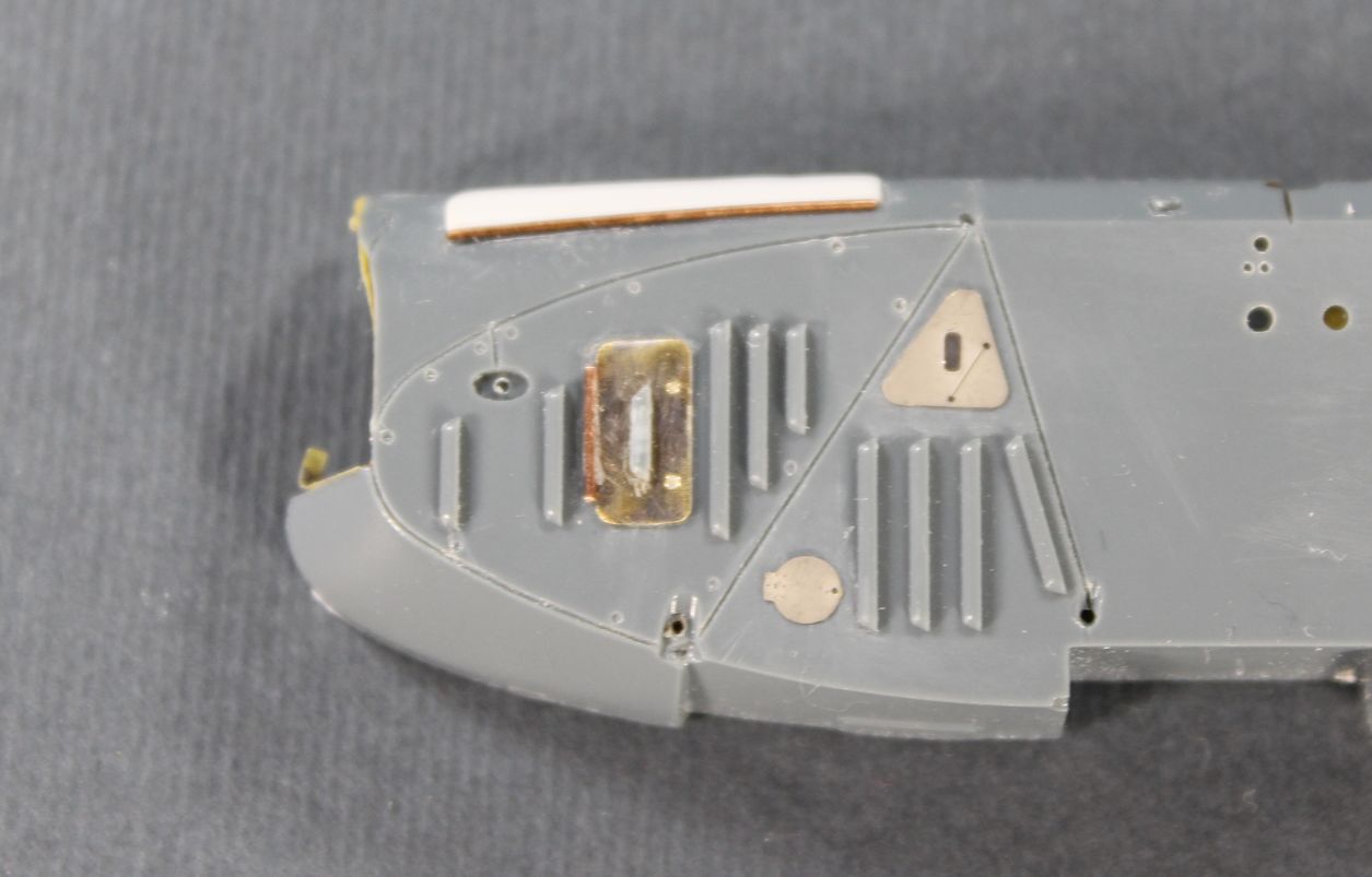 На капот приклеил лючки для доступа к двигателю. Три лючка самодельные, в фирменном травлении почему то отсутствуют.