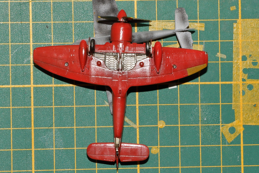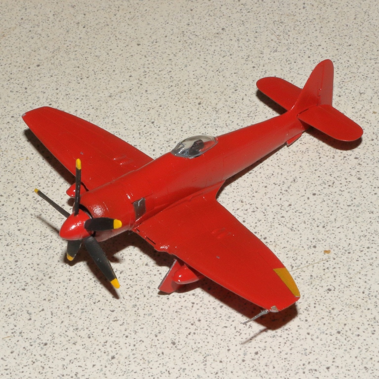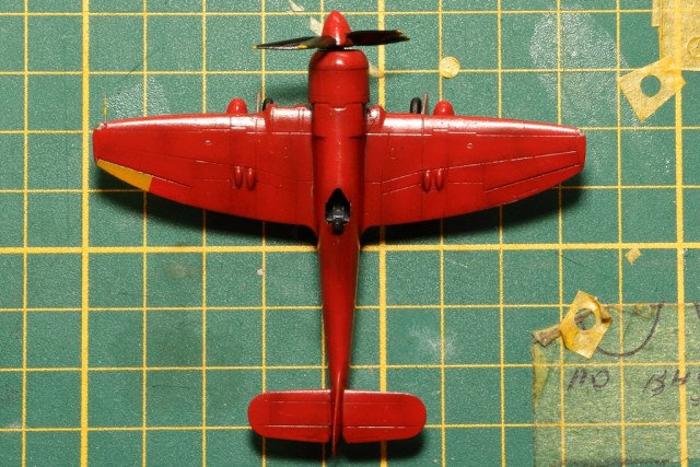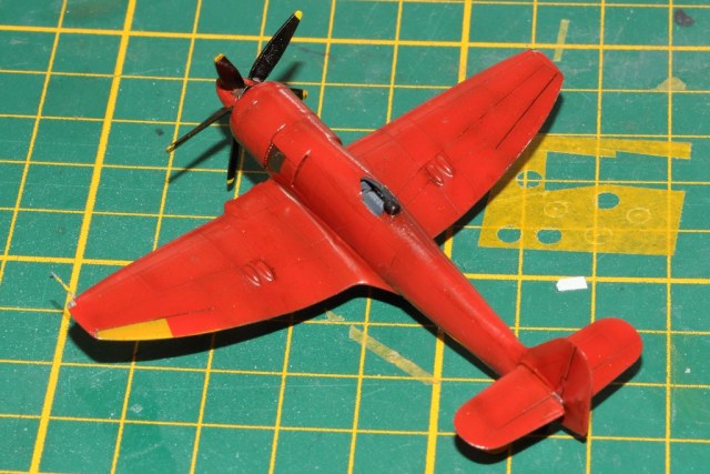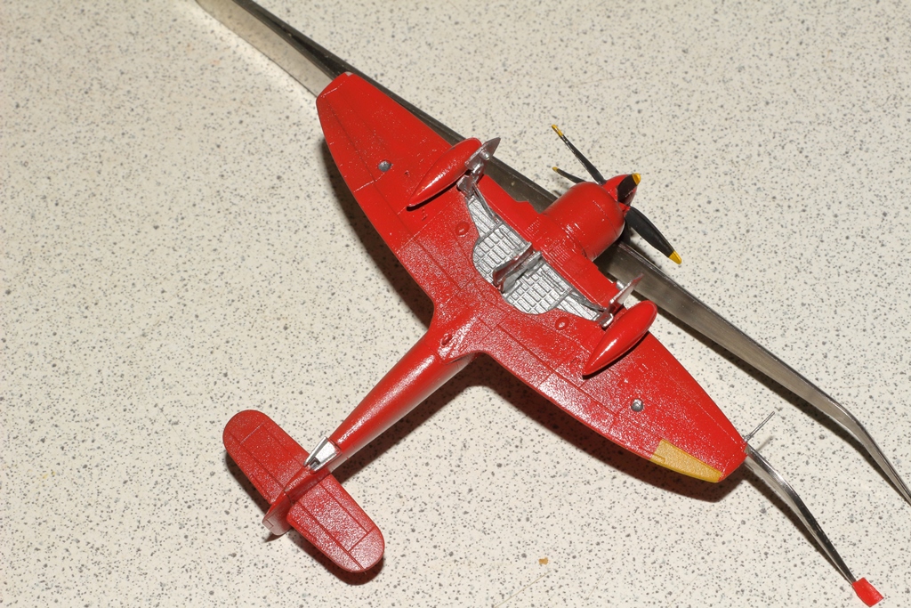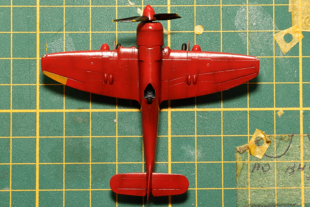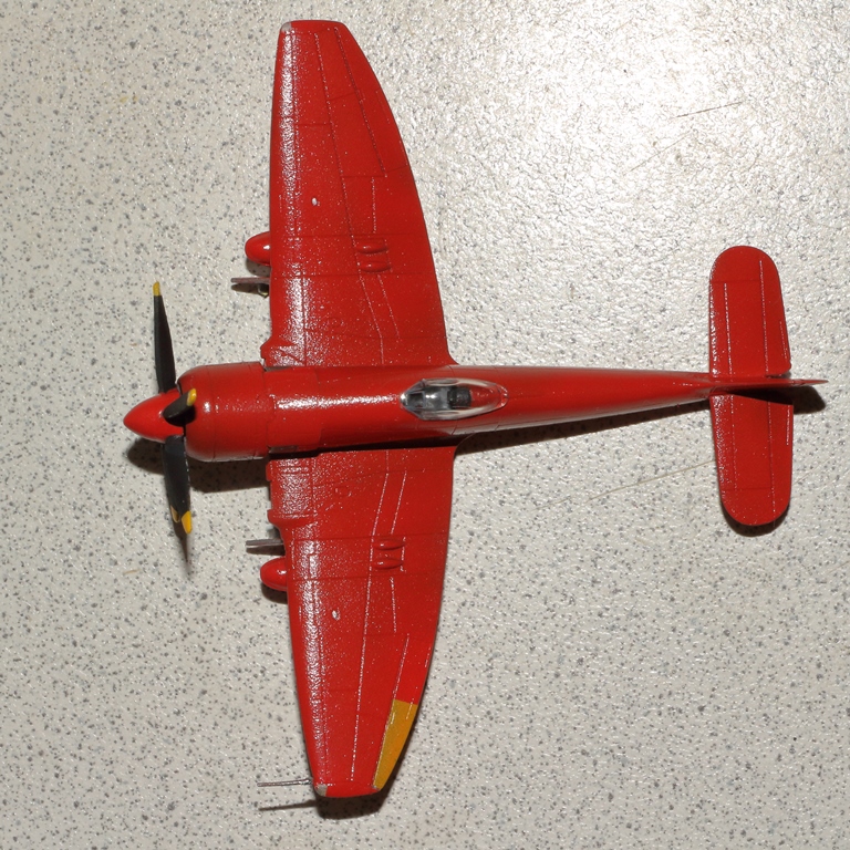 Модель покрасил акриловой Mr.Hobby "Shine red", не стал вымешивать оттенок, потому что на разных фотографиях оттенок красного разный. Левый элерон покрасил до половины в желтый цвет. На фотографиях прототипа так, но почему-то на фотографиях модели в этой окраске он покрашен целиком.
