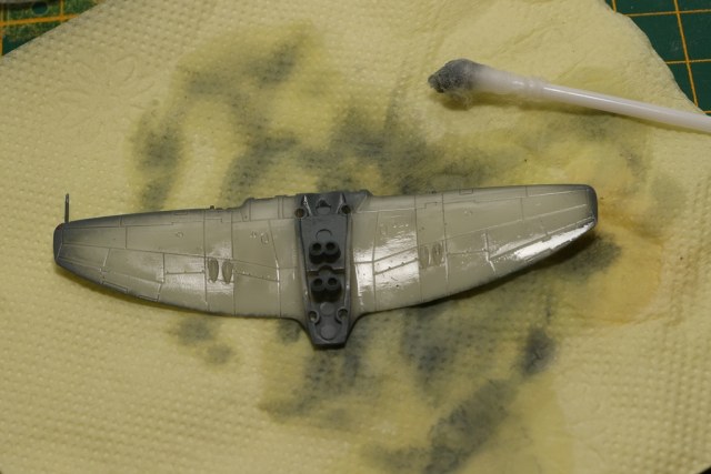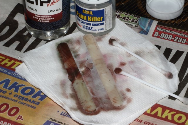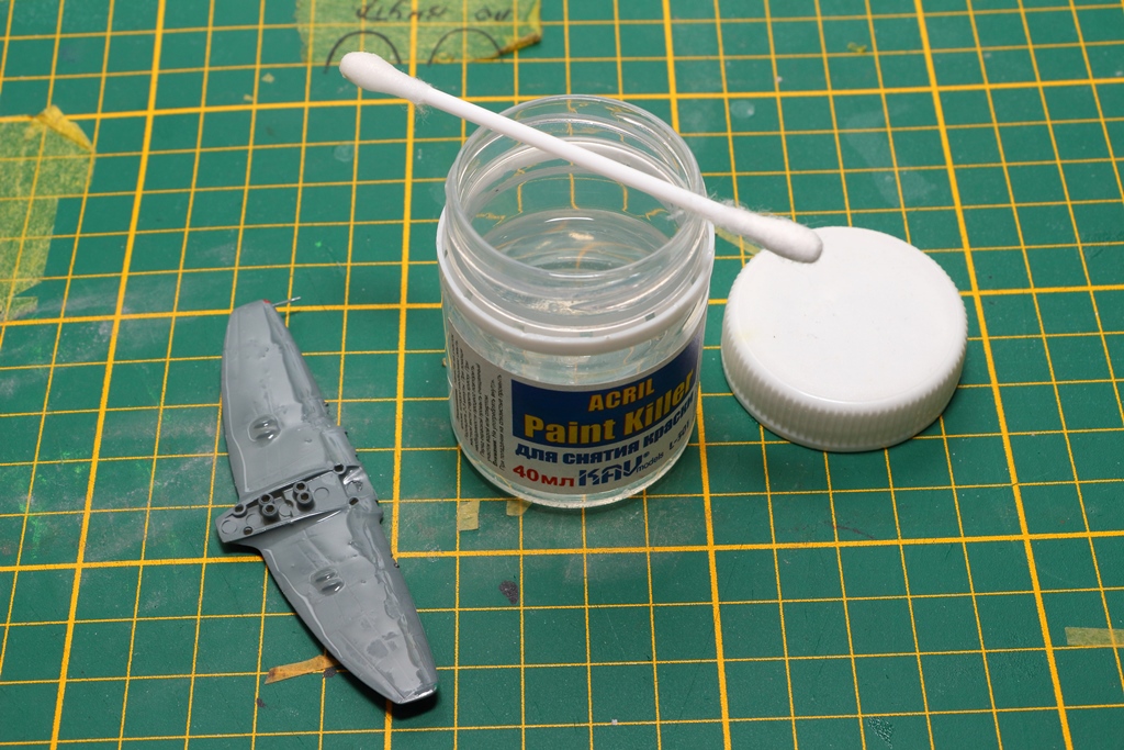 Попытки смыть краску стандартным методом замачивания в "Кроте" не увенчались успехом. Поэтому в бой была пущена тяжелая кавалерия чудо-жидкость от "KAV-models" под страшным названием "Paint killer" - жидкость для снятия краски, по нашему. Нанес жидкость на плоскости крыльев. Не сразу, но краска стала смываться благодаря трению ватными палочками.