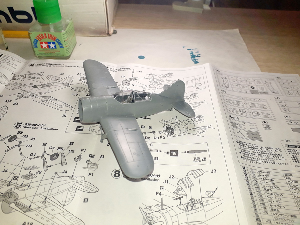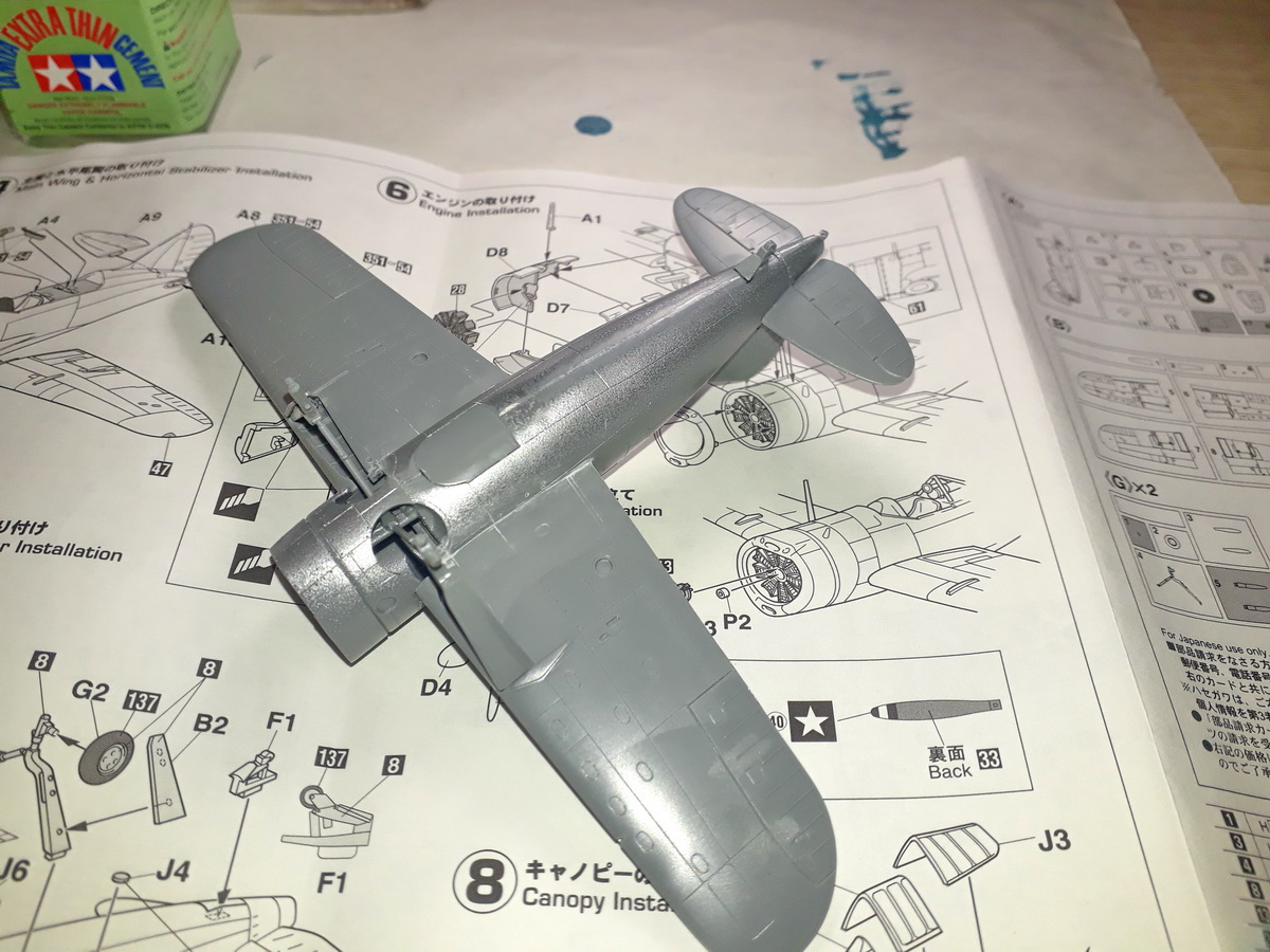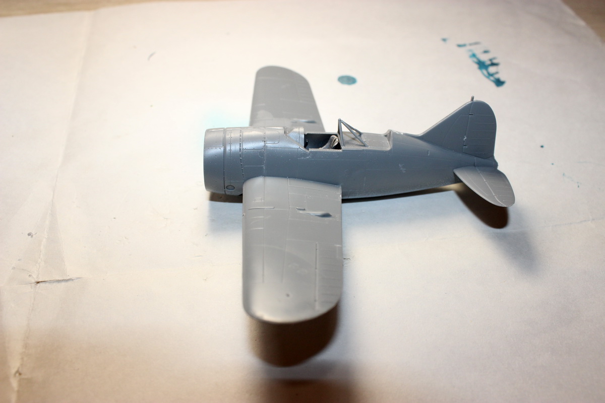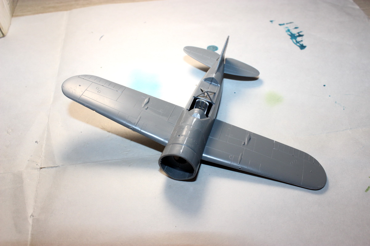 Установил стойки и хвостовое колесо, приклеил фонарь, закрыл нижний проем заглушкой. Готовлюсь к малярке:
