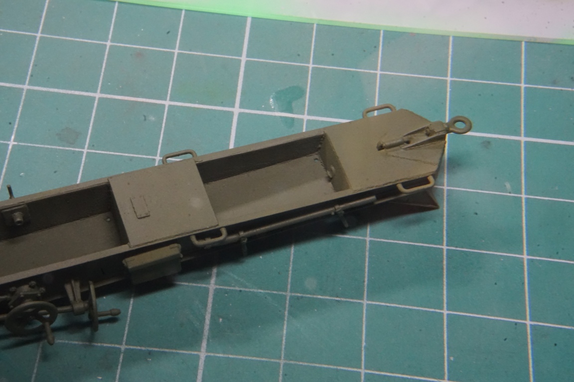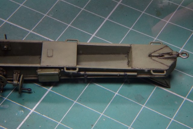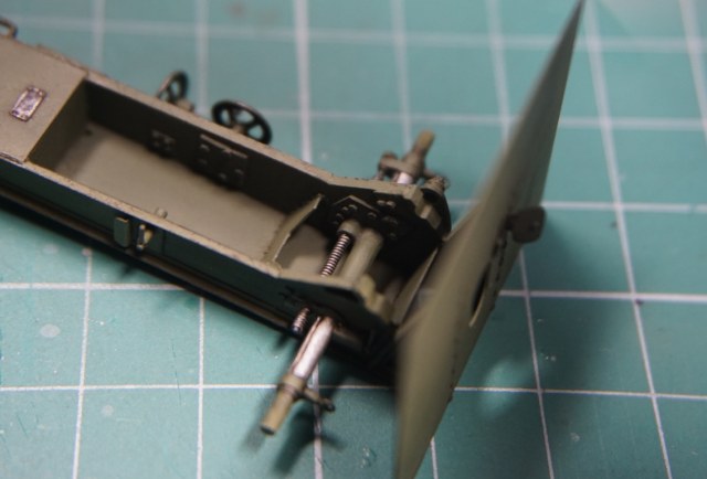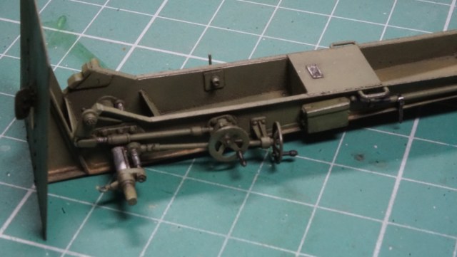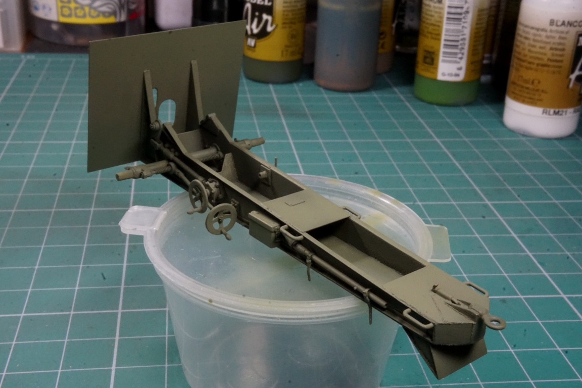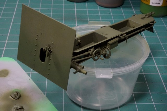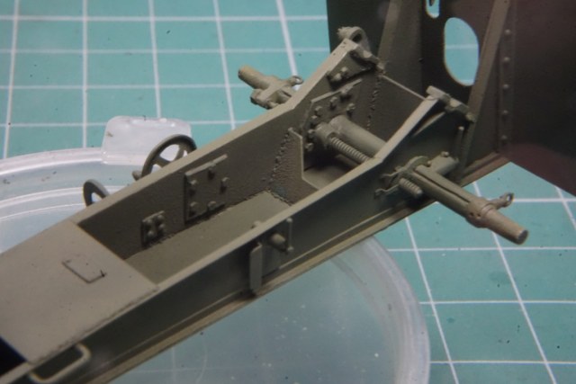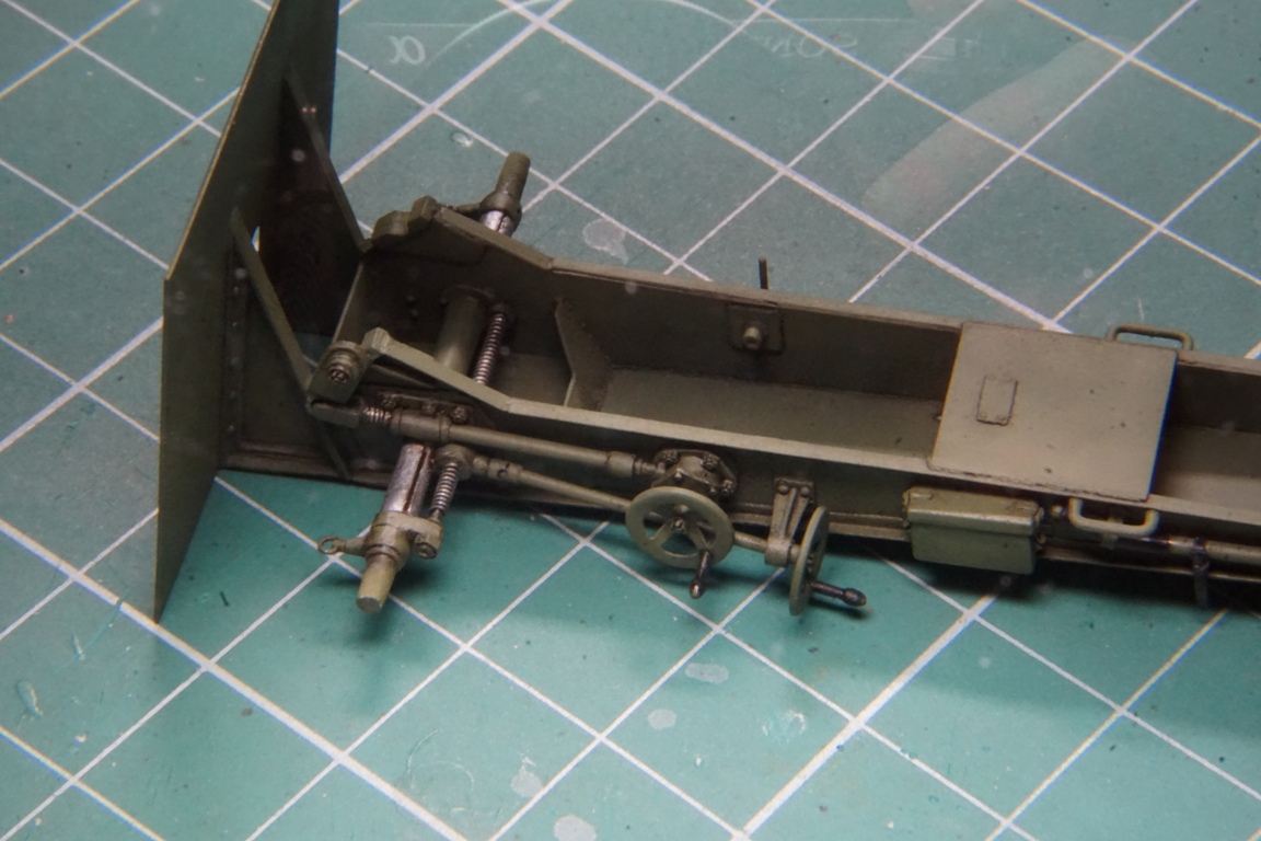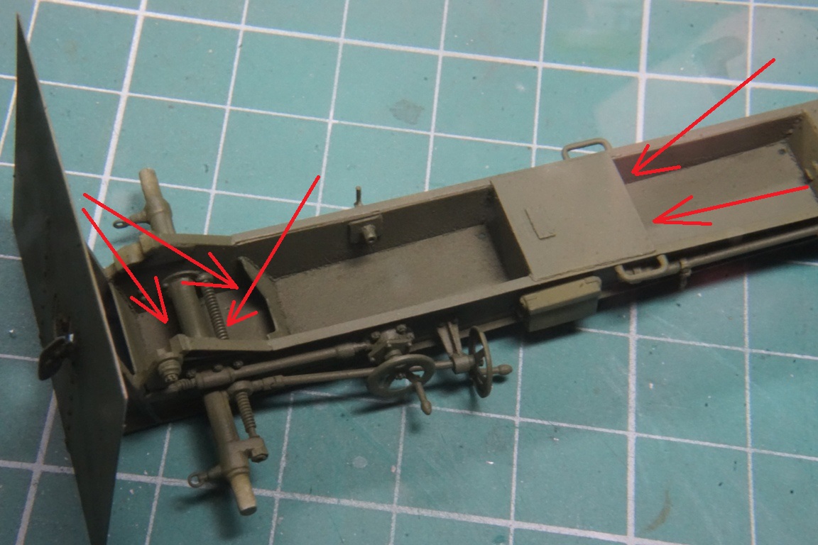 Есть здесь два основных глухих места, куда задувать краску с аэрографа не так то просто, чтобы случайно не залить лишнего. Это "карман" под снарядный ящик первой очереди и место под качающейся частью орудия с усилениями и осевой балкой. Углы силового усиления и наклона щитового прикрытия не особо способствуют задуть всю эту конструкцию без проплешин. стрелками показал проблемные места.
