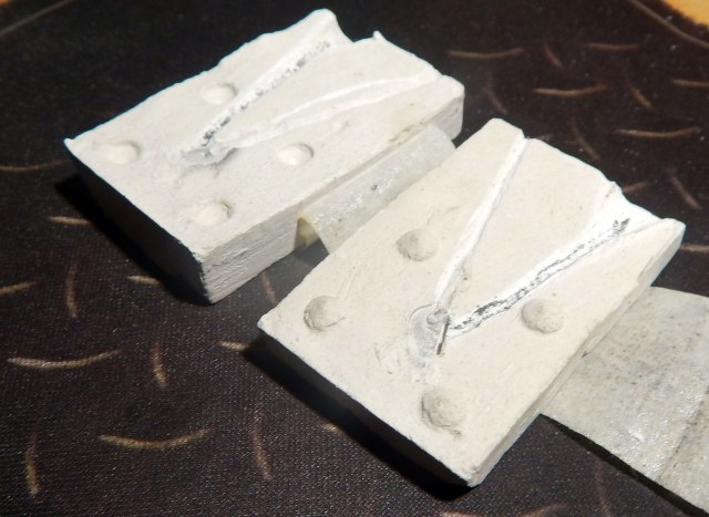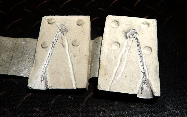 Из картонки от пачки чая сделал форму, залил в неё до половины алебастр, уложил в алебастр мастер модель до половины её толщины, дал алебастру затвердеть, засверлил ямки, чтоб форма не смещалась, промазал всё вазелином, залил всё это дело опять алебастром, полностью просушил, извлёк мастер модель, нарезал канал залива металла, нарезал выпор... отлил детали...