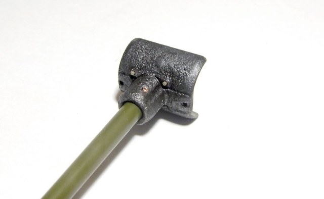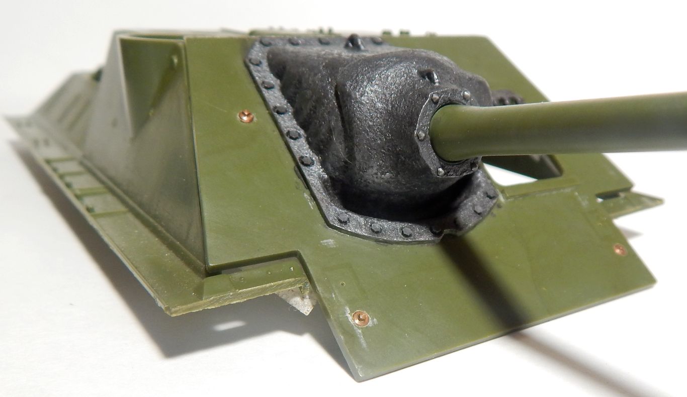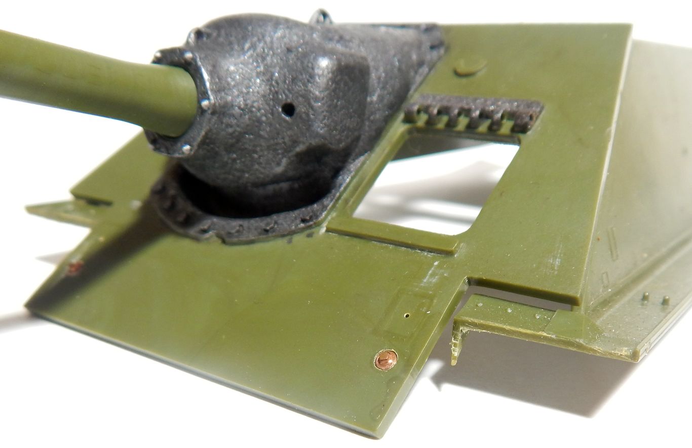 Тут вообще всё не однозначно: штатная со скандалом, но благополучно отправилась в ведро... переживал вообще ни разу, свято место пусто не бывает, новый рекрут - от той же строй Звезды, который как профессиональный снайпер слился с ландшафтом... была придана характерная форма вылета под ствол, нанесены следы газореза, литьевые швы, фактура литой железяки в земляные формы, установлен винт (его назначение для меня так и осталось тайной) из проволоки 1мм, выточены 3 каких то рожка из медной проволоки (что это, я так и не смог ни где разглядеть, но похожи на болты) 2 сверху, 1 снизу... такая вот вышла конспировочная маскировка, порой аж сам вхожу в заблуждение о производителе... но как бы там не было, а встала эта маска в башню просто замечательно.