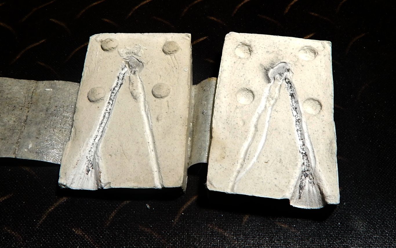 @Алексей Ромадин написал:Из картонки от пачки чая сделал форму, залил в неё до половины алебастр, уложил в алебастр мастер модель до половины её толщины, дал алебастру затвердеть, засверлил ямки, чтоб форма не смещалась, промазал всё вазелином, залил всё это дело опять алебастром, полностью просушил, извлёк мастер модель, нарезал канал залива металла, нарезал выпор... отлил детали...