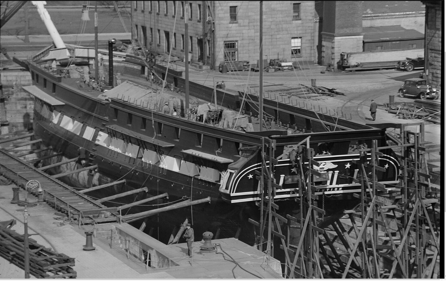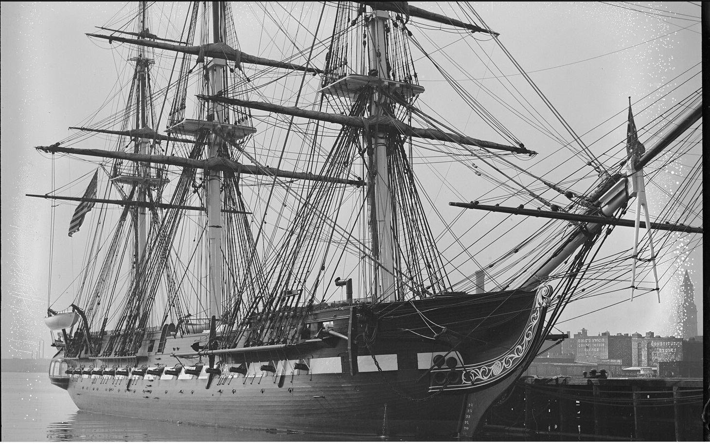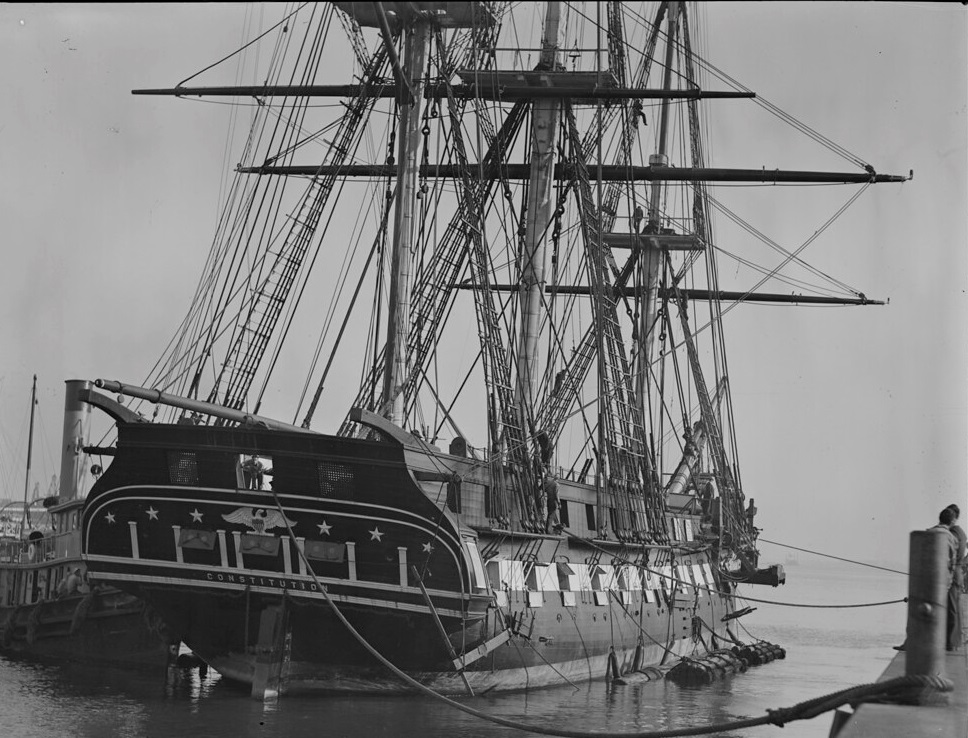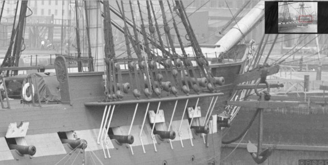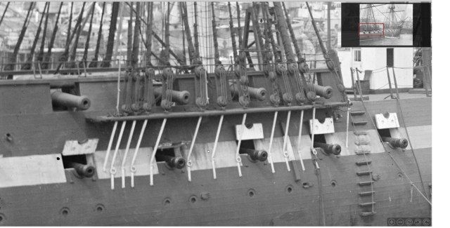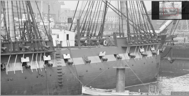 Долго не давало покоя мне наличие сквозных отверстий в бортах набора. Если смотреть на фото что есть в наличии, то сомнений , что это иллюминатор ... нет ! Даже на гражданских чисто грузовых они присутствуют, хотя и находятся намного выше и это сильно смущало. После того как набрел на инструкцию от Revell соблазн убрать их стал еще больше, но.... даже на фото Конституции они проглядываются и четко. А как нам известно это тоже фрегат. Образы обоих кораблей похожи и значит шанс что иллюминаторы появились после одной из реставраций очень мал, но сомнение не покидало.
