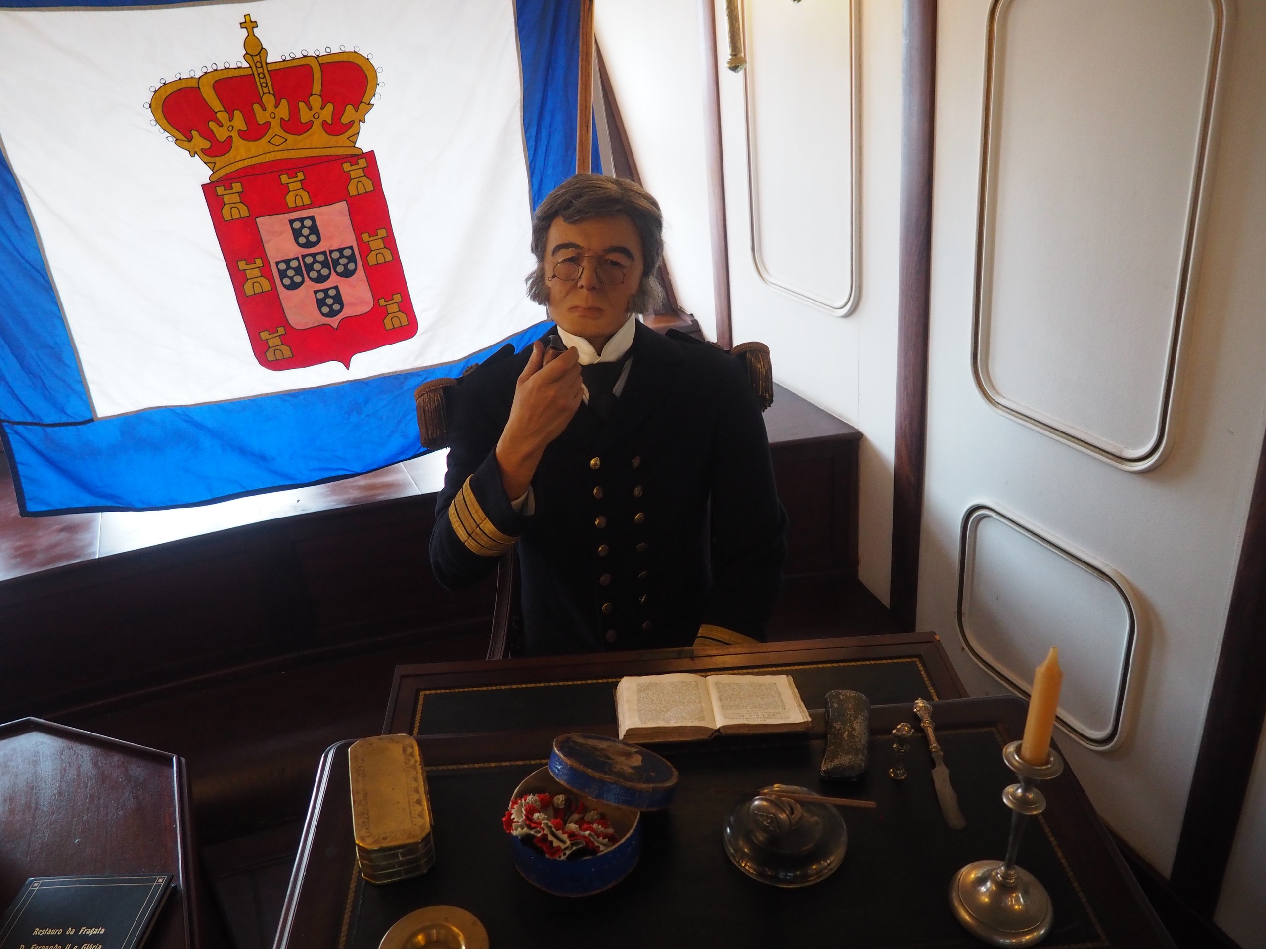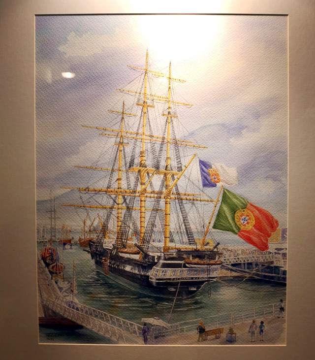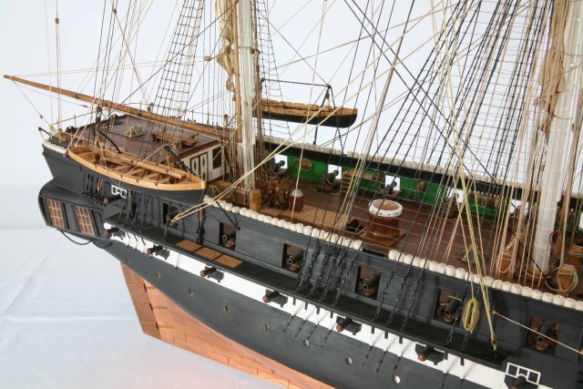 Сам парусник является музеем. Да возможно и не в лучшем виде, но все же и в одном из помещений / возможно в кают компании, была такая традиция да и сейчас жива иметь образ на картине или в модели своего корабля/ Висит вот это. На нем наш герой. Что сразу бросилось в глаза это открытые крышки орудийных портов на корме и находятся они ниже кают на корме. Таскать туда орудия согласитесь не совсем удобно и выходит там были штатные. в наборе этого / орудий и портов нету/ Но это картина а что сейчас ?