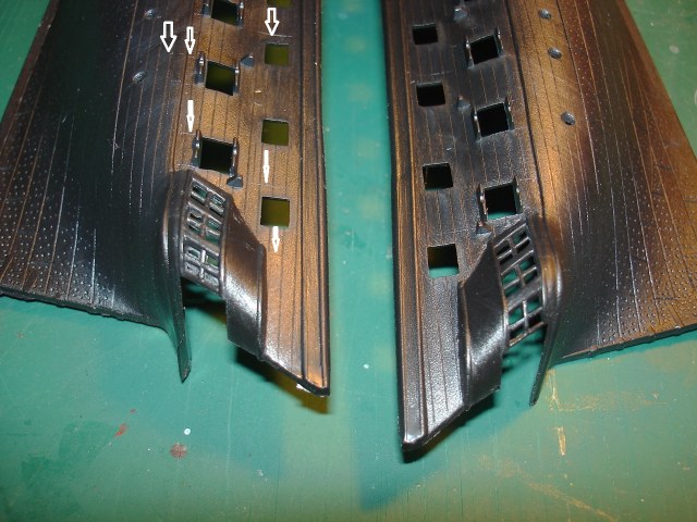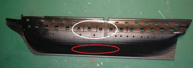Вот левый борт и облой в портах орудий полностью такой же как в обзоре Revell . отмечен белым. красный площадь правого борта где пропадает расшивка медных листов