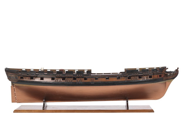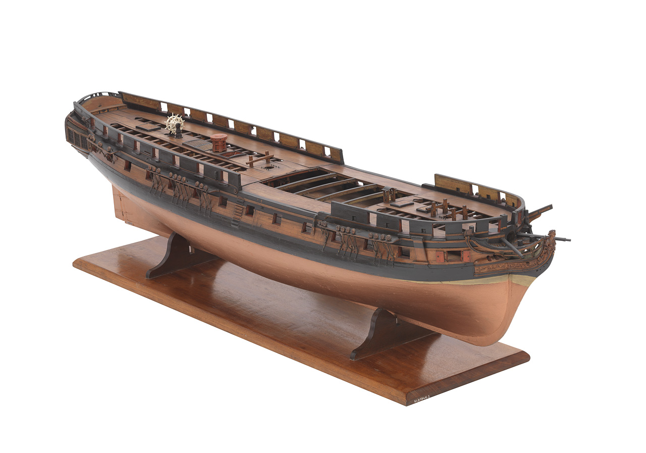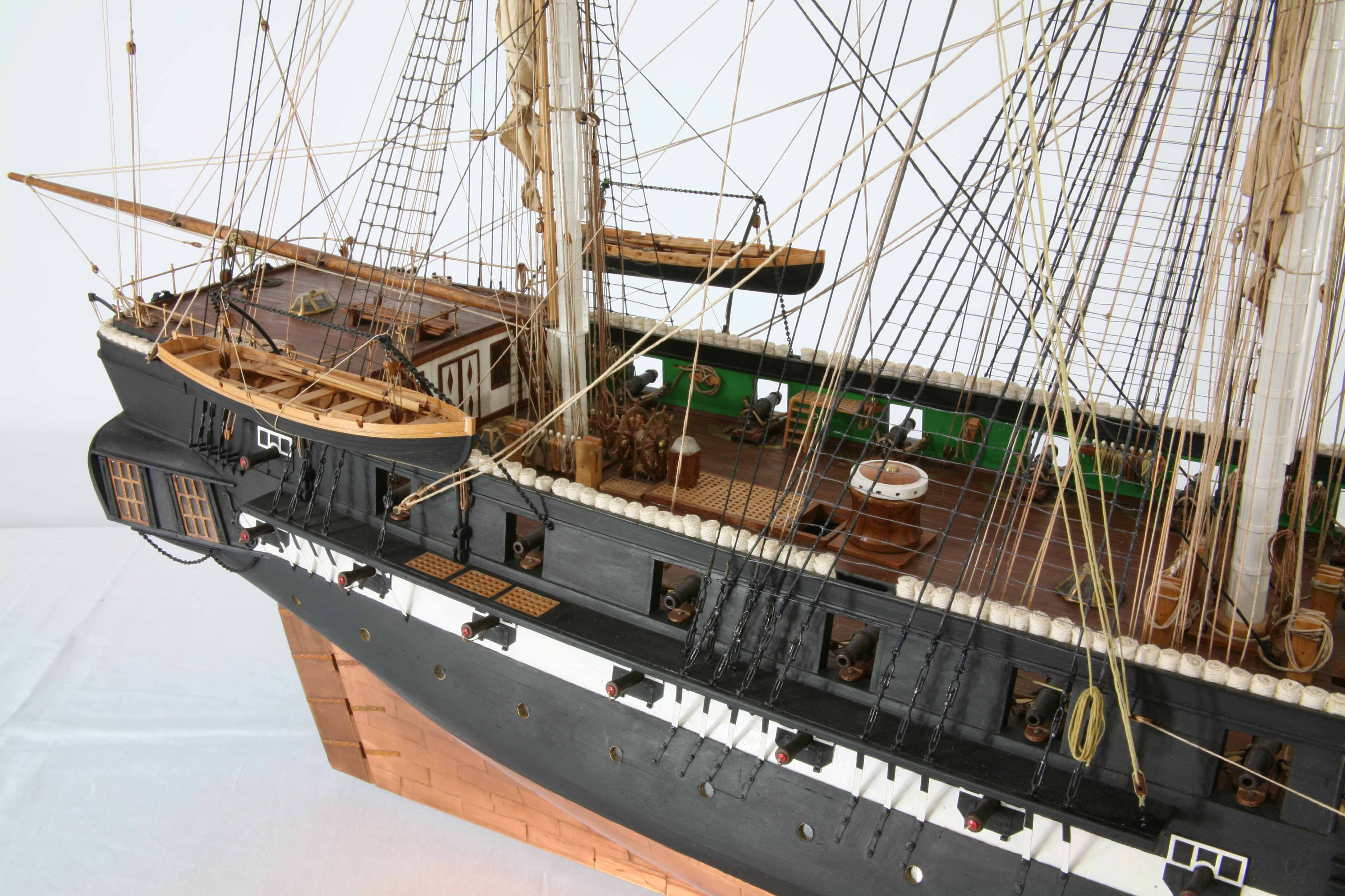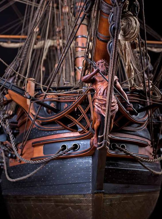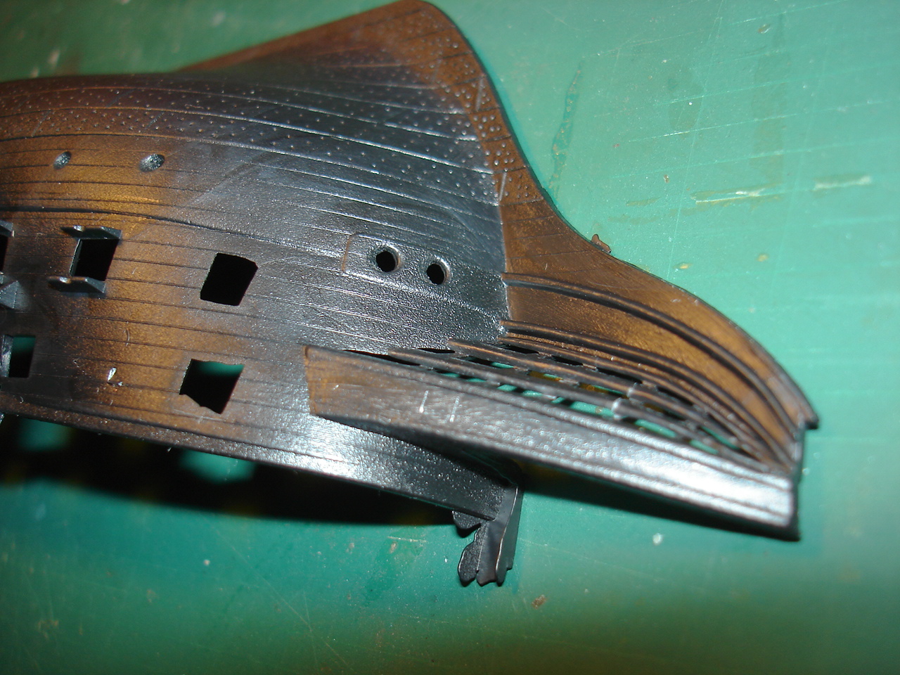 Расшивка палубы нижней отсутствует, но ее /палубу/ видно не будет, верхняя палуба имеет расшивку наружу, мелкая и тонкая... минус Корпус показана обшивка медными листами. Крой листов и гвоздей внутрь, на правой половинке корпуса в низу крой местами пропадает... только правый борт низ. Выше ватерлинии крой бортовой доски показан наружу. Минус или нет? теперь с увереностью сказать не могу.