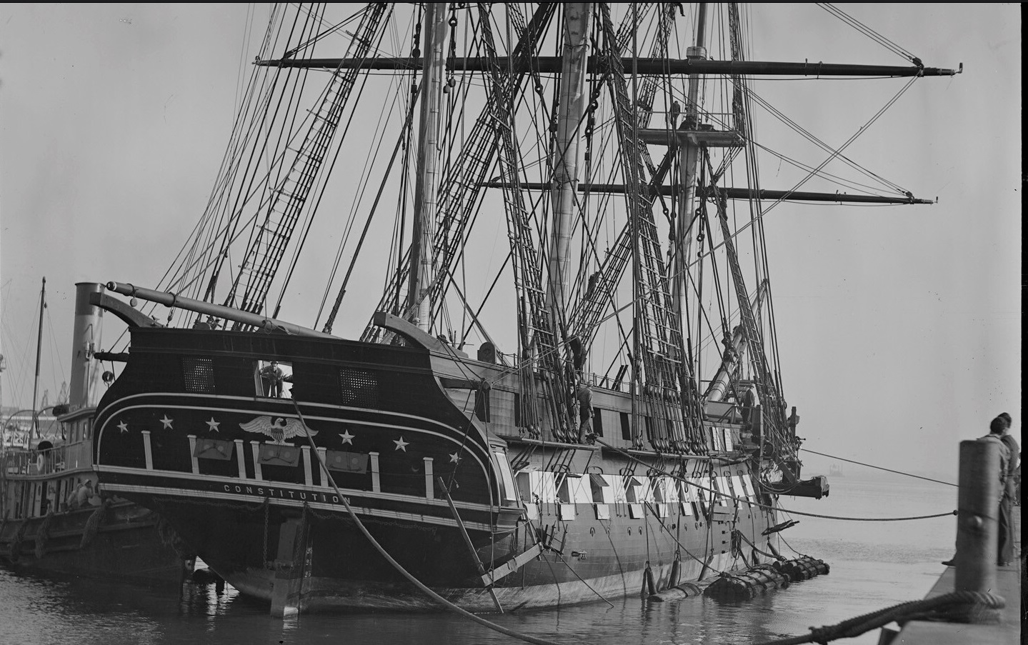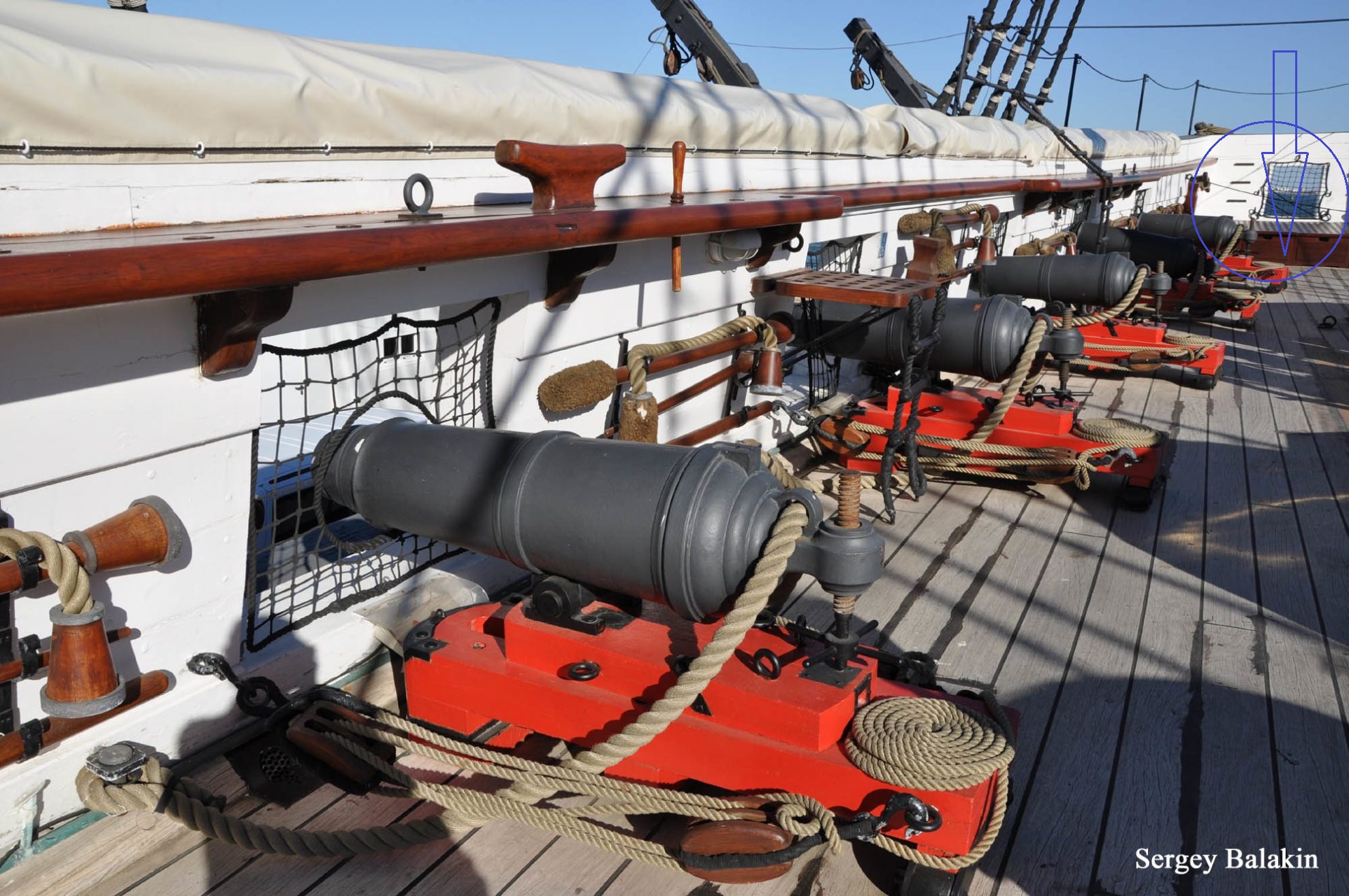За бортом кормы там шлюпка. Попасть в нее можно сверху и благо как видно / стрелка/ Нахожу одно объяснение Световой люк закрыт защитной решеткой из дерева. а порты для удобства посадки в шлюпку.... по канату, но есть шанс высадить остекление рам каюты ногами... На Конституции окна закрывались ставнями, а тут их нет...