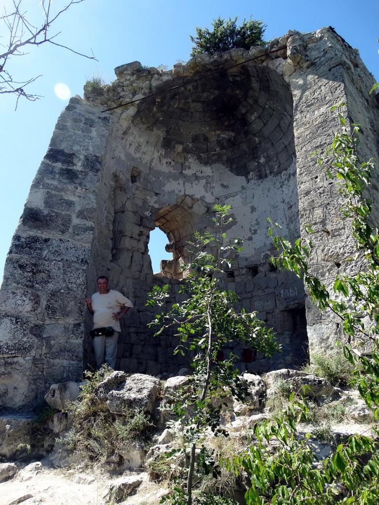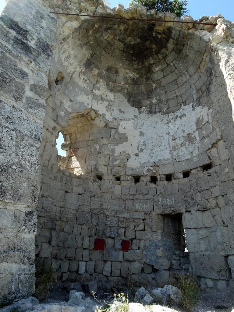Башня. Когда-то она имела зубцовое завершение. Северо-восточная часть обрушилась еще при турках. В конце 40-х годов прошлого века реставраторы соорудили подпорки, но они обрушились в конце 90-х годов, не выдержав сильных летних ливней. В нынешнем веке их восстановили. Башня двухэтажная, перекрытие между этажами было деревянное. На втором этаже располагался христианский храм, расписанный фресками. Сейчас от них не осталось ничего. Фото 15, взятое из сети, сделано в более раннее время. Там же показана реконструкция фресок.
