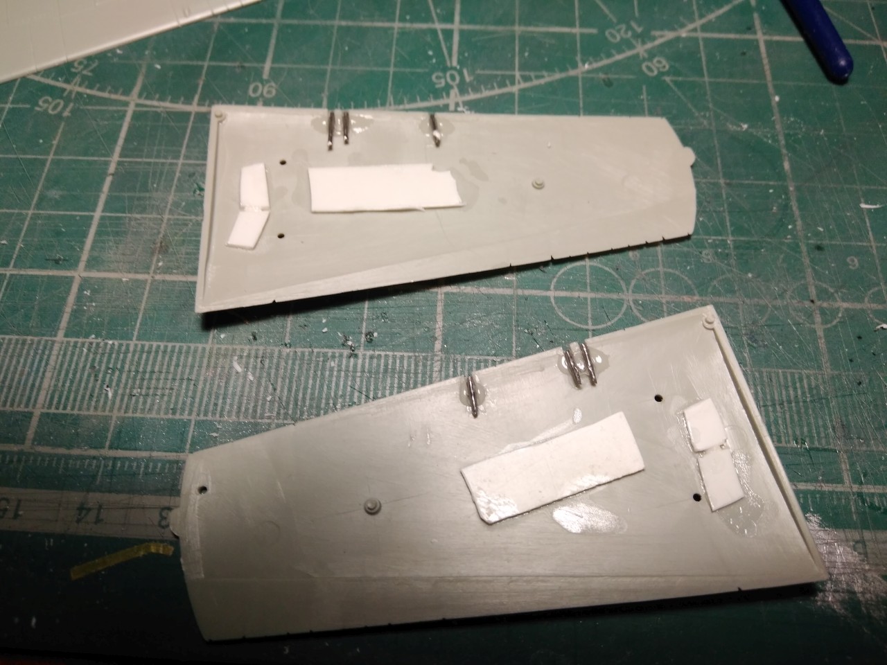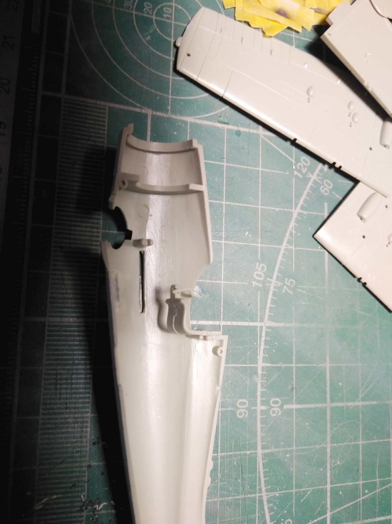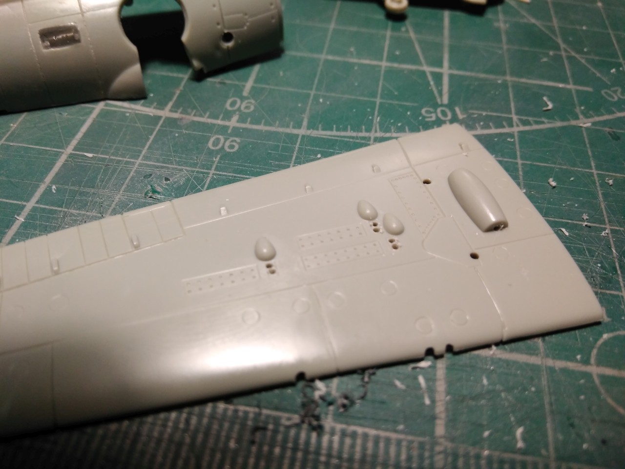 Потихоньку попил уже начался. Пригодился кусок полистирола из прошлого. Высверлены отверстия под выхлоп, гильзосбрасыватели и радиаторы под крыльями. Из игл сделаны пулеметы - хоть они и внутри крыла, но без них просто дыры скучные.