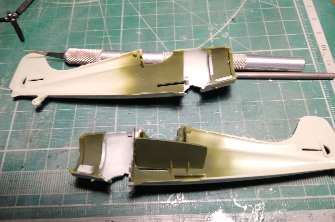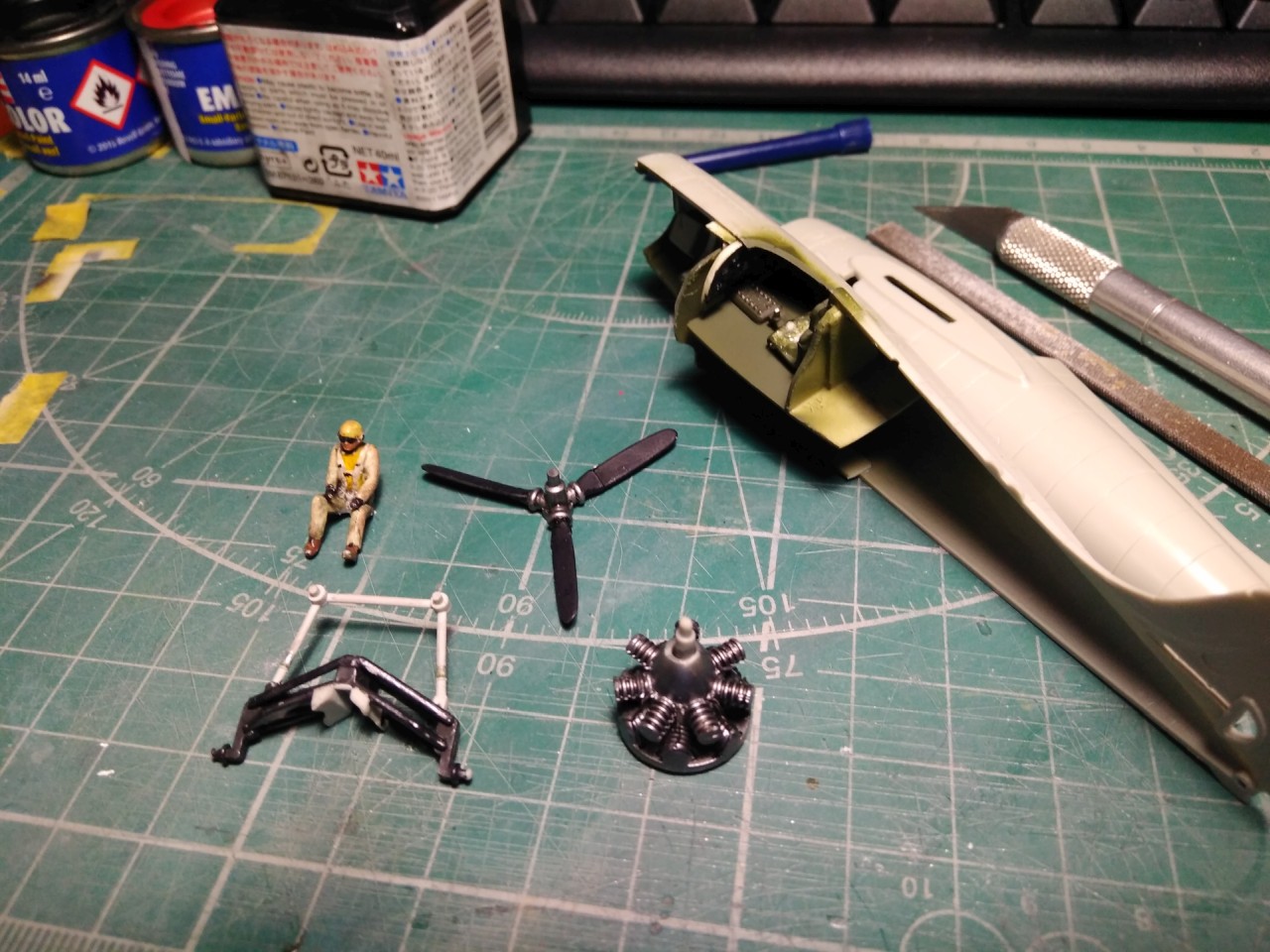 Процесс потихоньку движется. Кокпит и перегородку кое как изобрел. Потом понял, что приборку все равно видно не будет - фонарь закрытый, пилить не хочу. Пилот к тому же закроет убогий интерьер. В общем чем то напоминает возню со Свордфишем))... В двигательном отсеке изобразил воздуховоды. Из за этого двигатель не хотел влезать - пришлось подрезать цилиндры.