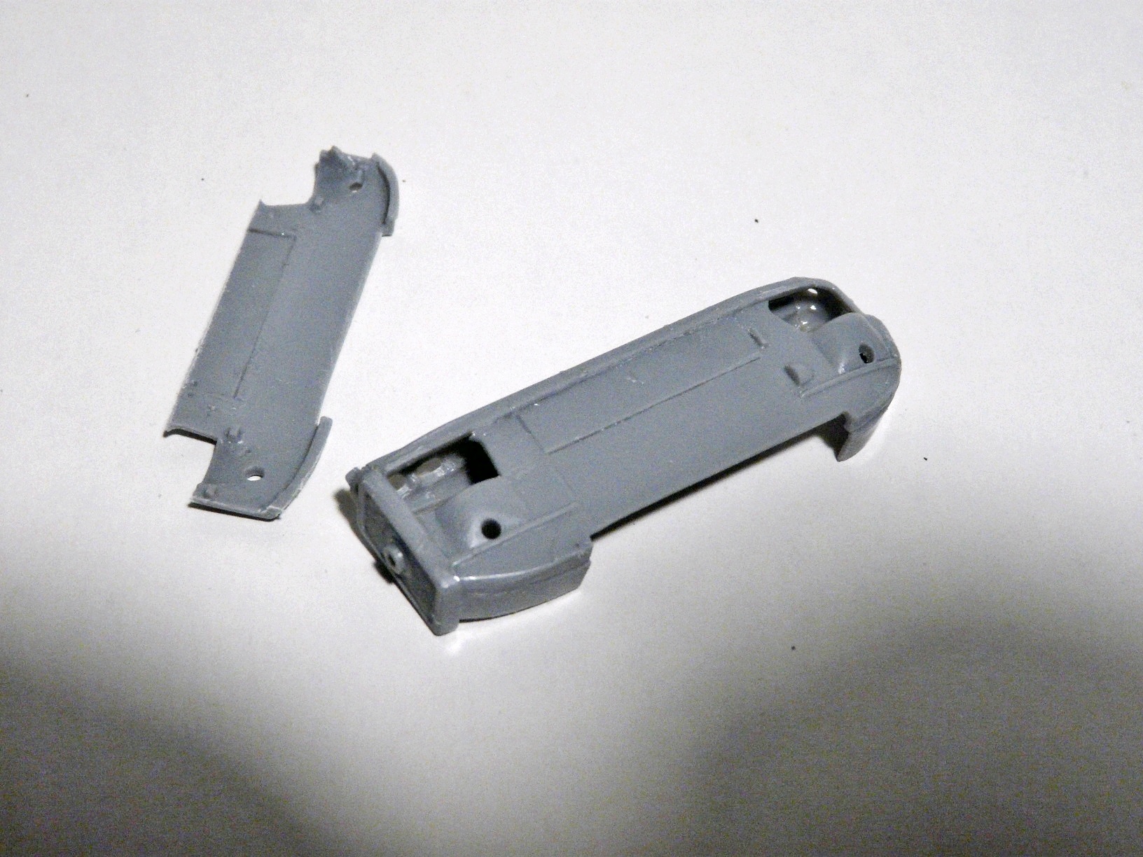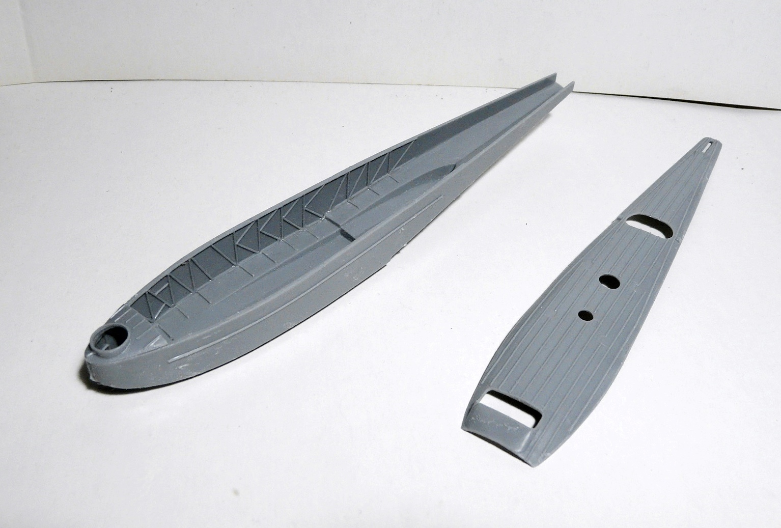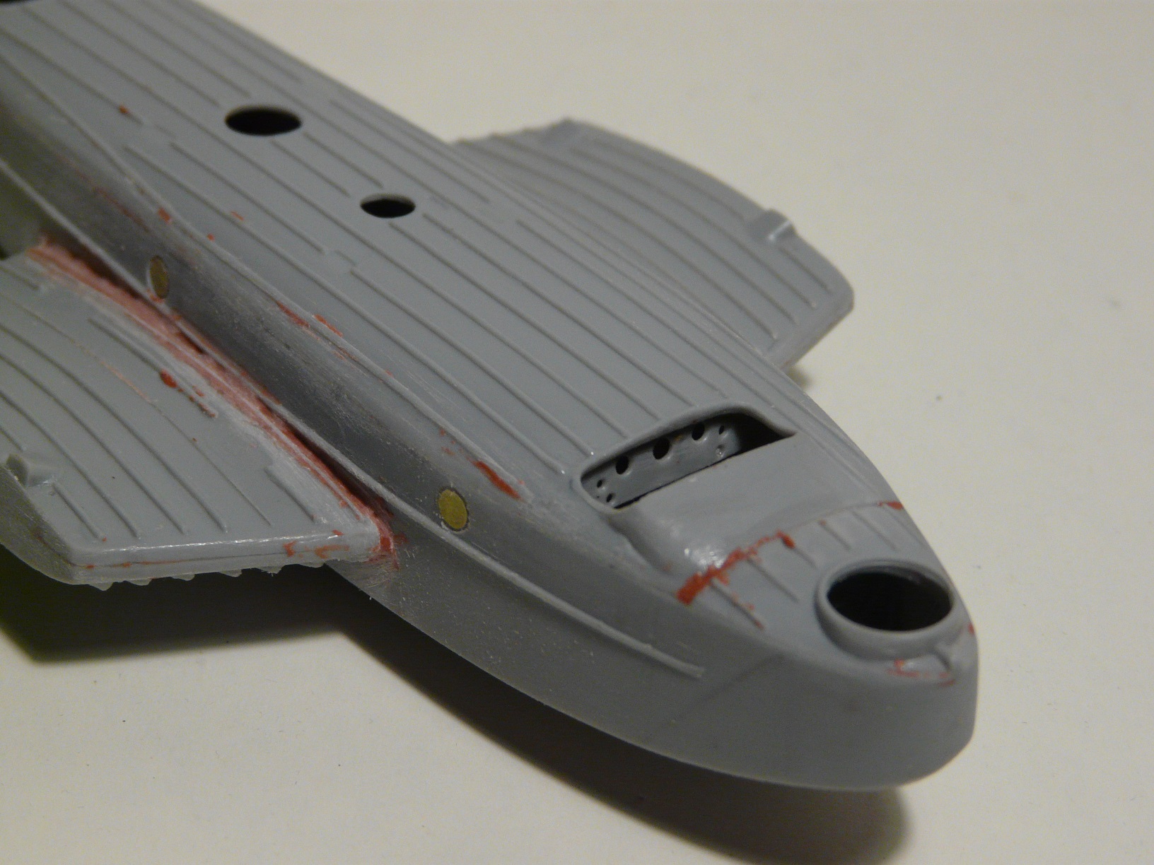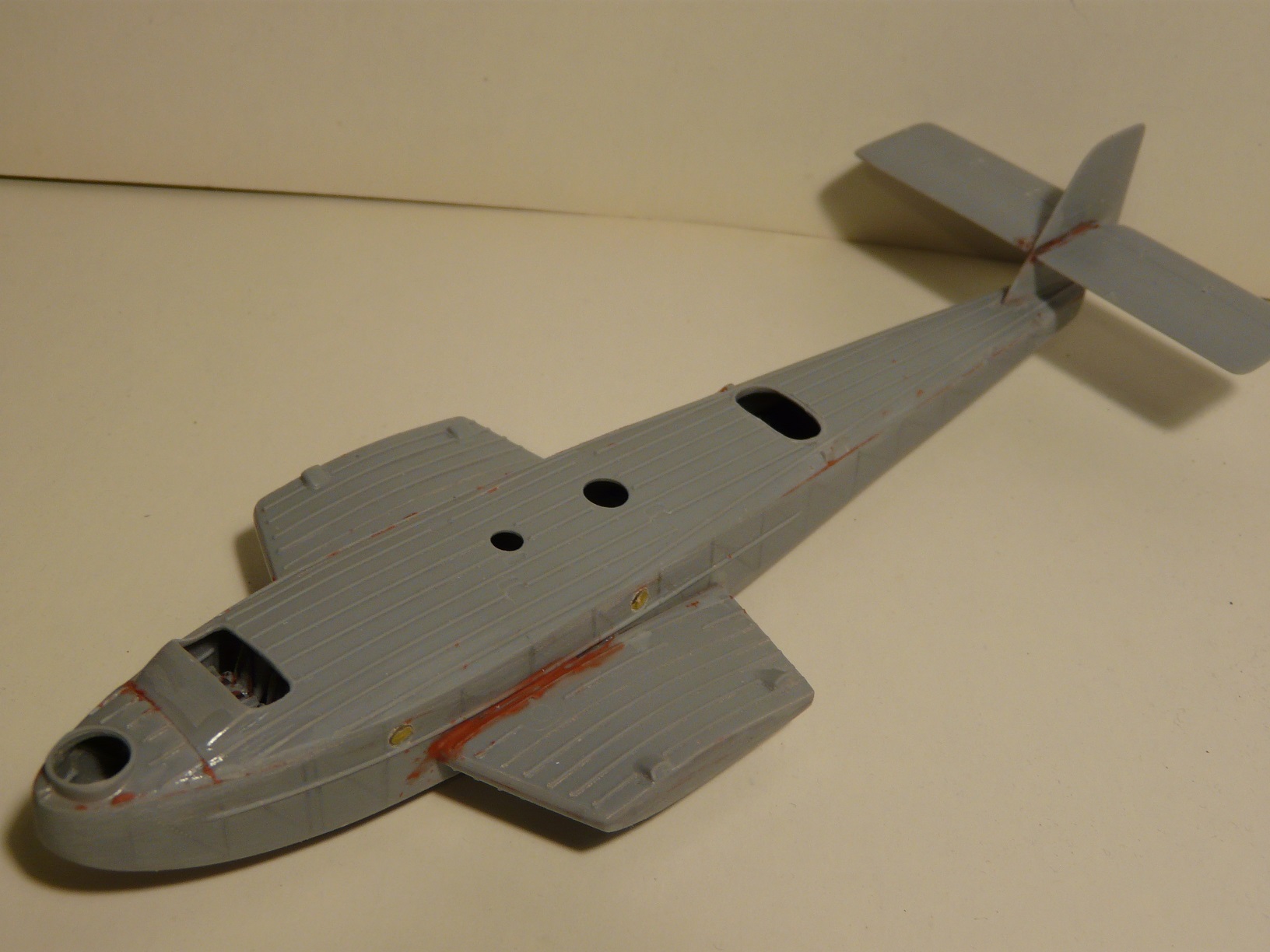 Интерьер покрашен светло-серым. Сиденья летчиков пока вставлены на сухую,нужно найти схему или фото привязных ремней. Установил киль, поставил на место спонсоны и зашпаклевал все новоловской шпаклей, (как раз привезли свежую),теперь ждать пока высохнет.