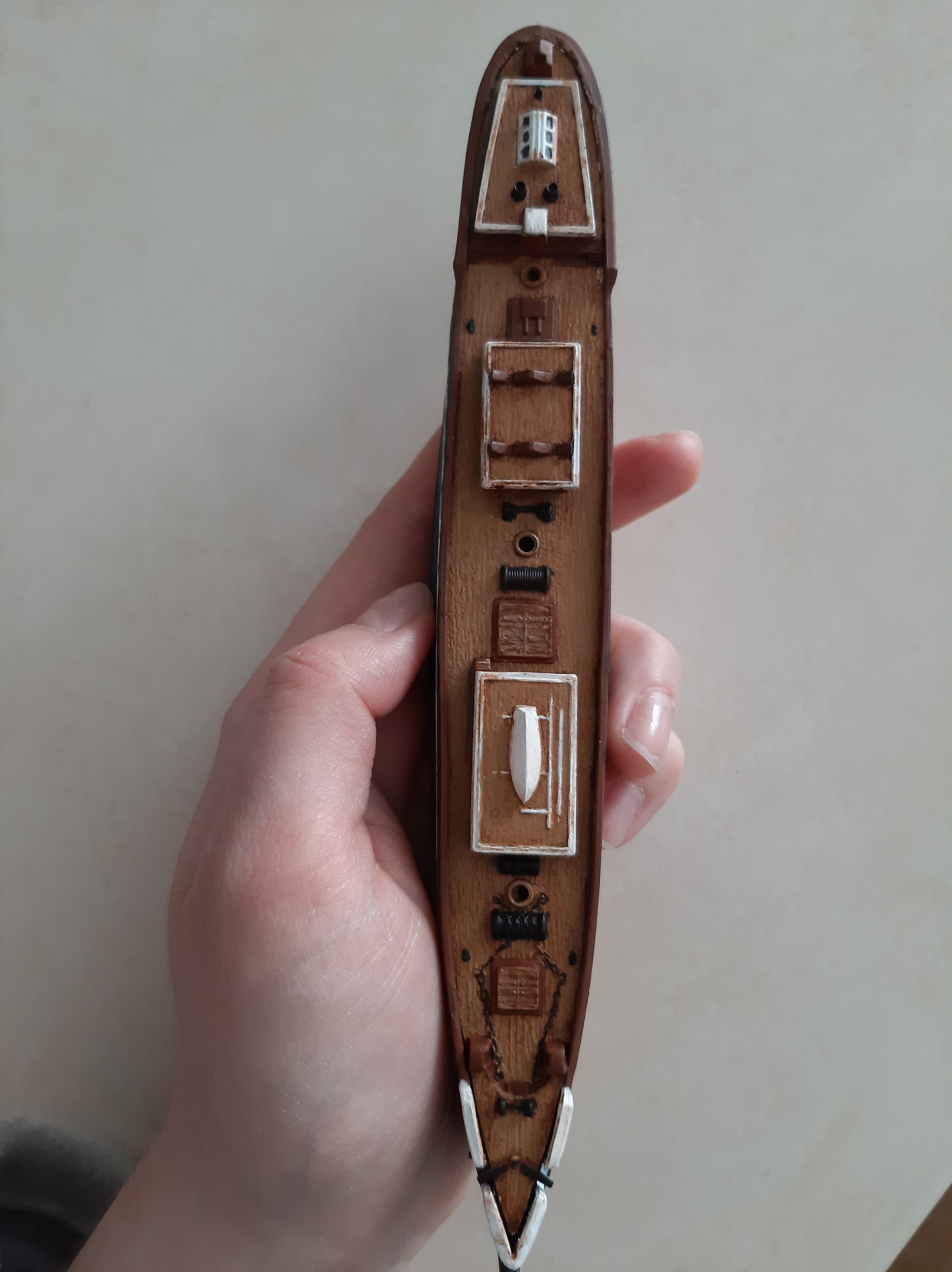 Учитывая изначально "ужаснейше-страшнющую" палубу, предлагаемую "Моделистом", которую, кроме как выкинув в пропасть, лучше вряд ли сделать, как по мне, вполне зачётная покраска у Вас получается. Цвет только, на мой личный взгляд, немного темноват для палубы...., но это уже дело вкуса и видения автора..... Так что можно и так оставить, думаю что многим наоборот такой оттенок даже больше понравится.....