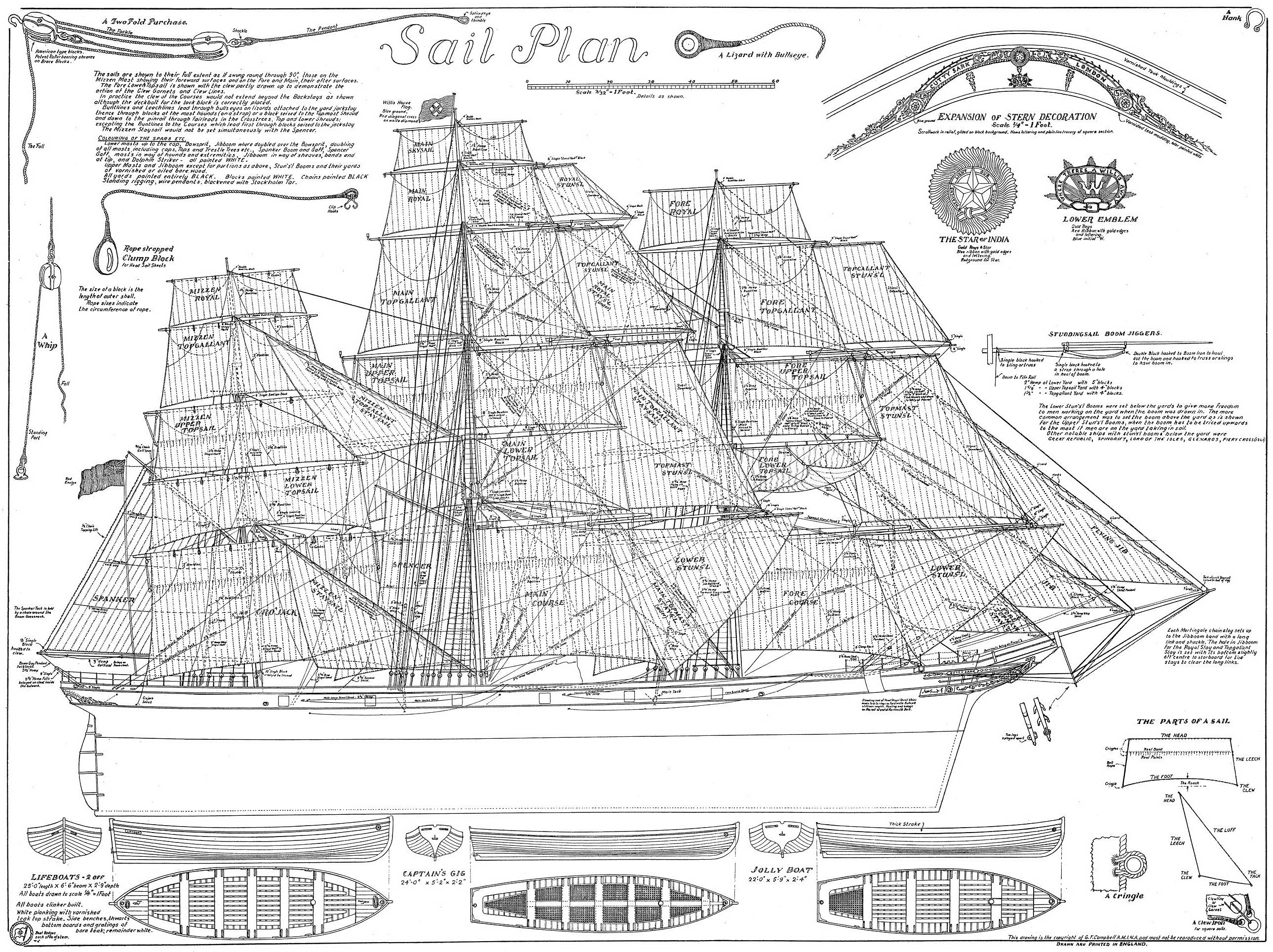 Анна, гляньте модель Антона. Такелаж на клиперах наверное самым сложным за всю историю был, что и не мудрено, с учетом того, что в отдельные моменты с целым стадионом (это примерная площадь всех парусов Катти Сарк) управлялась команда из 11 человек. Прикиньте самые заметные на ваш взгляд детали, и попробуйте их воспроизвести. Полной точности в 350 масштабе достичь не получится, да и не надо оно. Ну а что сохранить и от чего отказаться - решите по ходу.