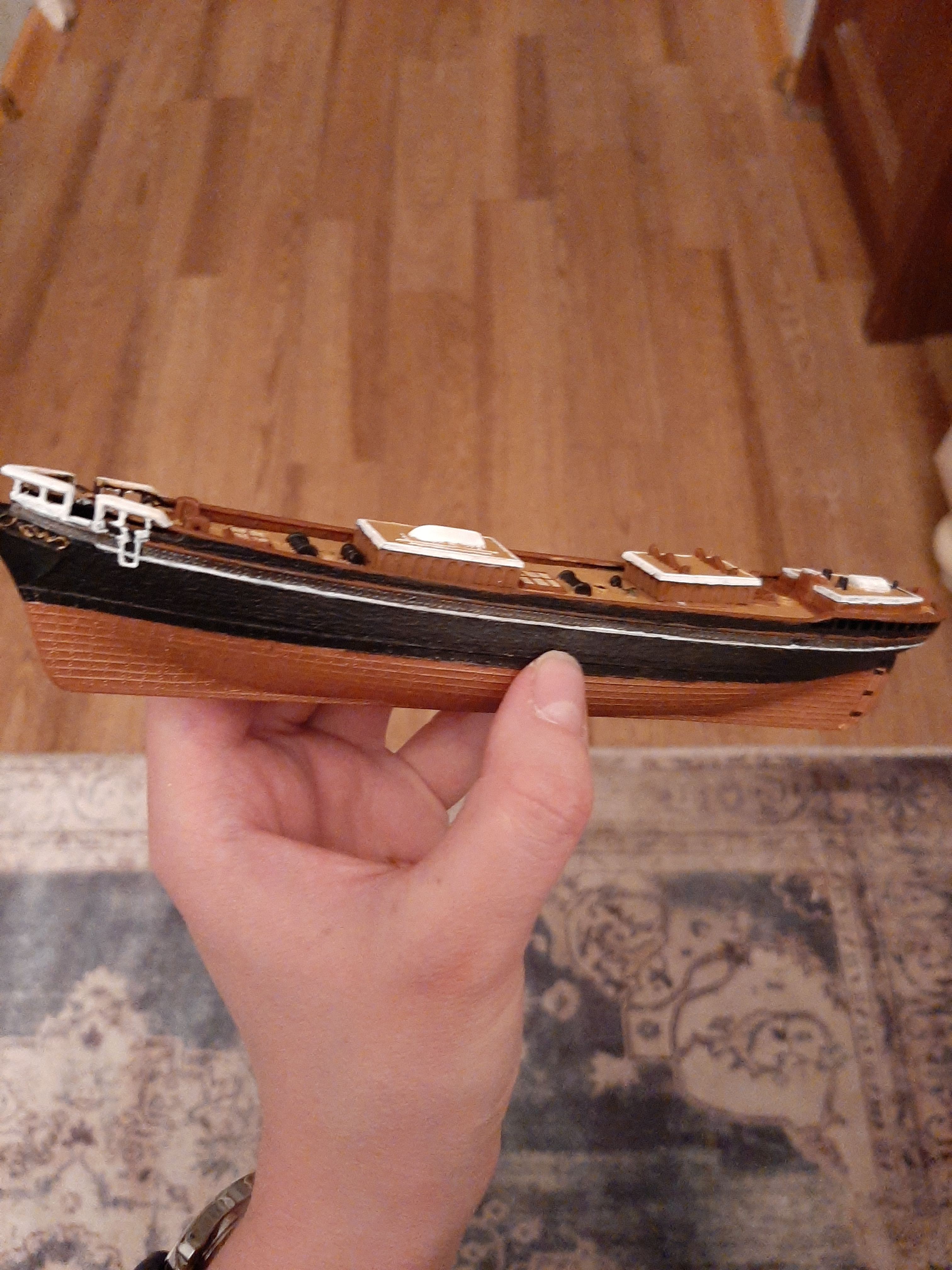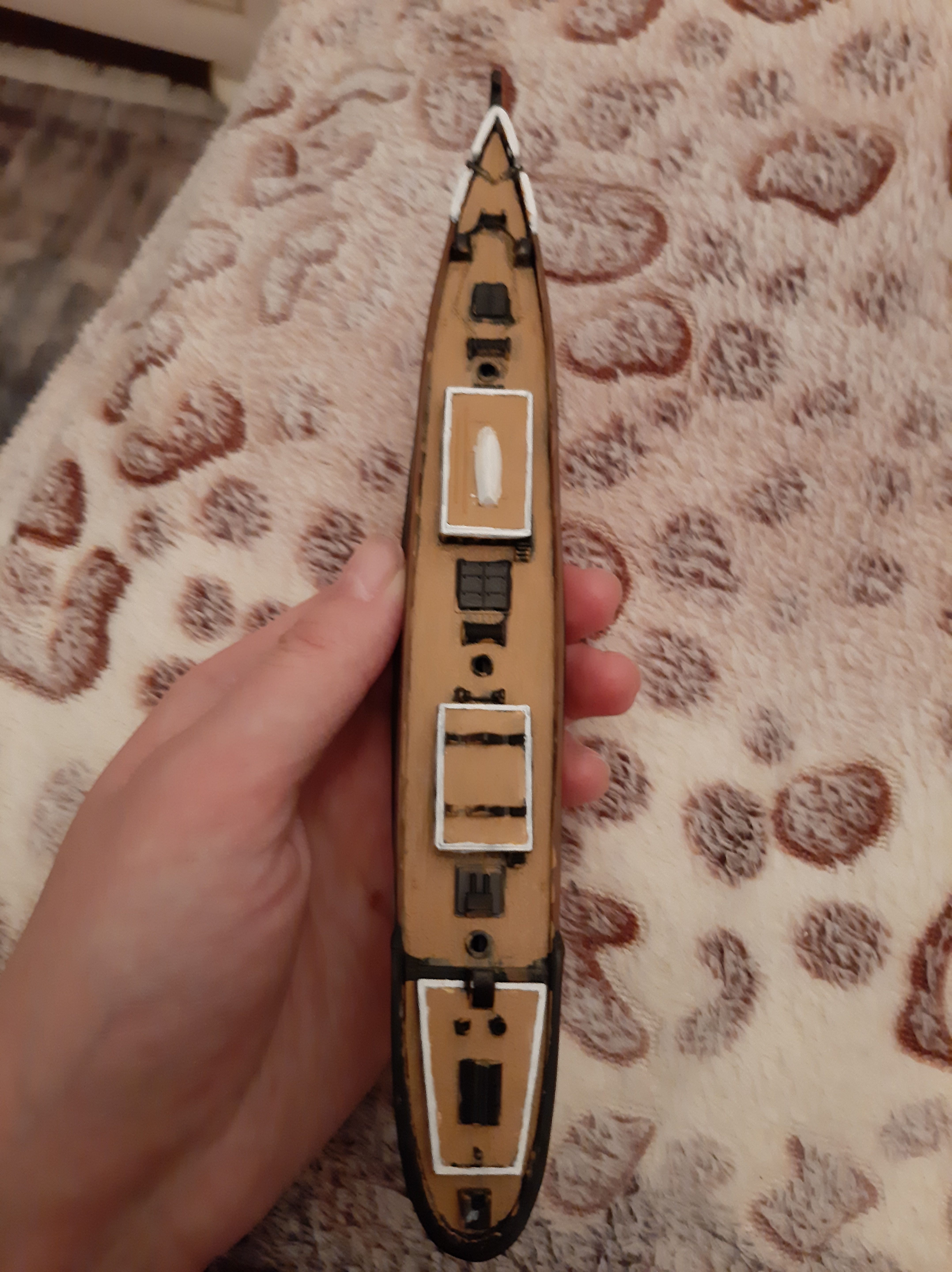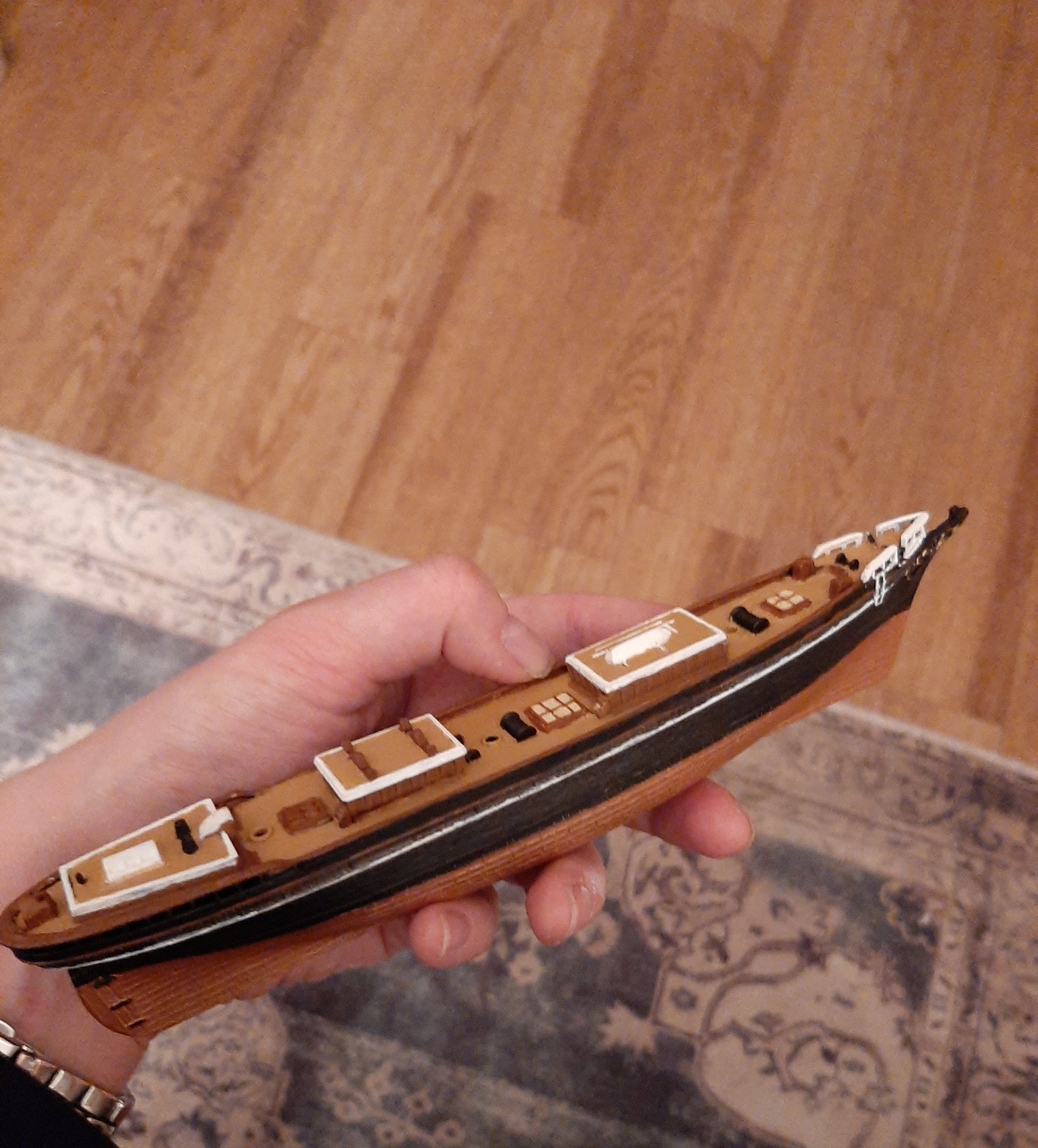 С такелажем.... конечно, я всегда считала себя более менее умным и образованным человеком, не "блондинкой", но... даже со схемой я ничего не понимаю, с чего начать, как крепить, куда завязывать! Думаю, когда уже все шлюпки приклею, начну с бушприта. С ним более менее разобралась. С носовой фигурой... дотянула я до китайской эпидемии и теперь уже фигурки не заказать. Буду тогда лепить из подручных средств. А с парусами тоже пока в раздумьях. Амбиций много, но смогу ли я это все выполнить? Вот и думаю, мб пока что сделать изкоробочные паруса? Планирую также нарисовать золотой узор. На задней стороне корпуса. Хотя бы наметить.