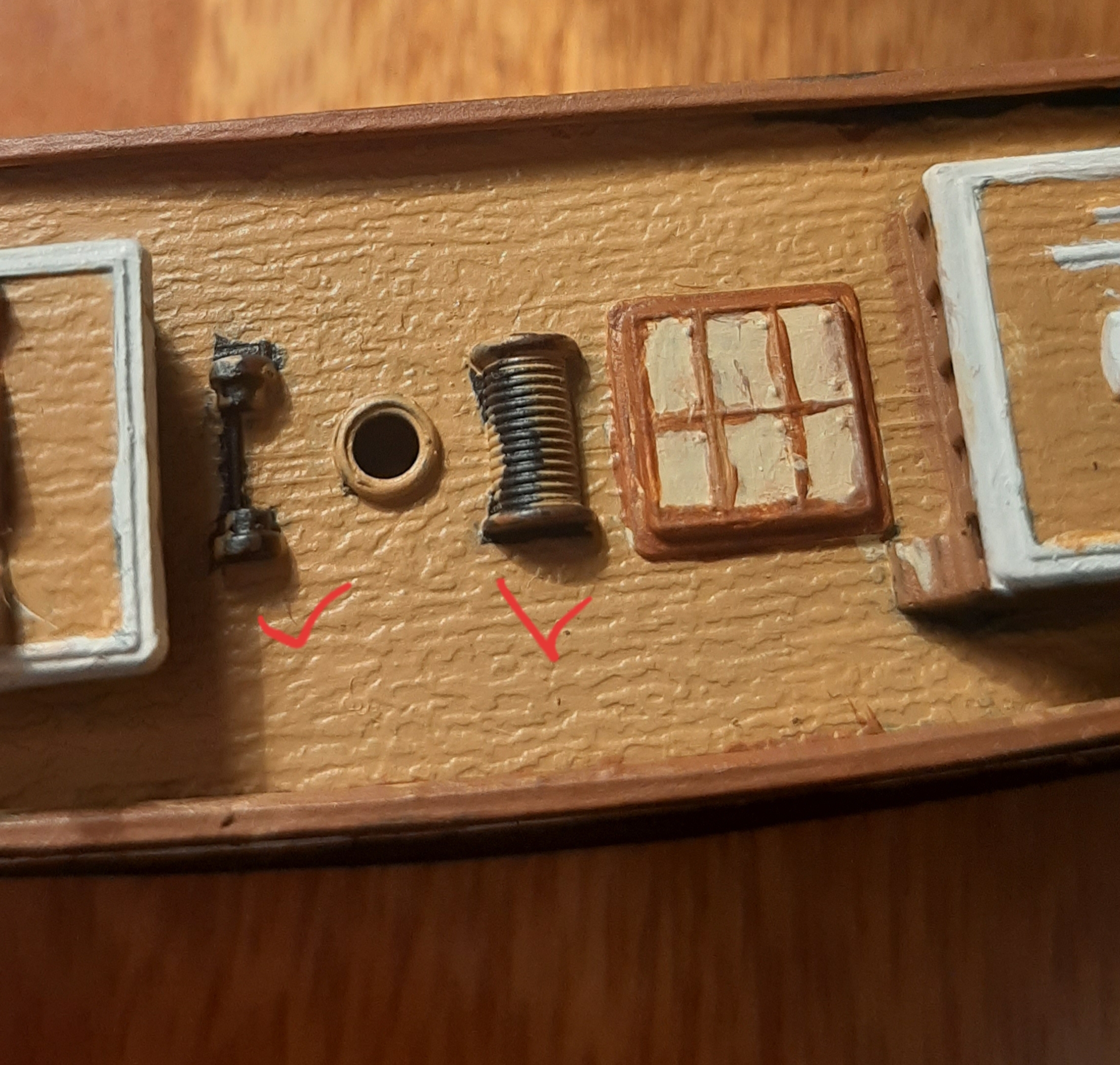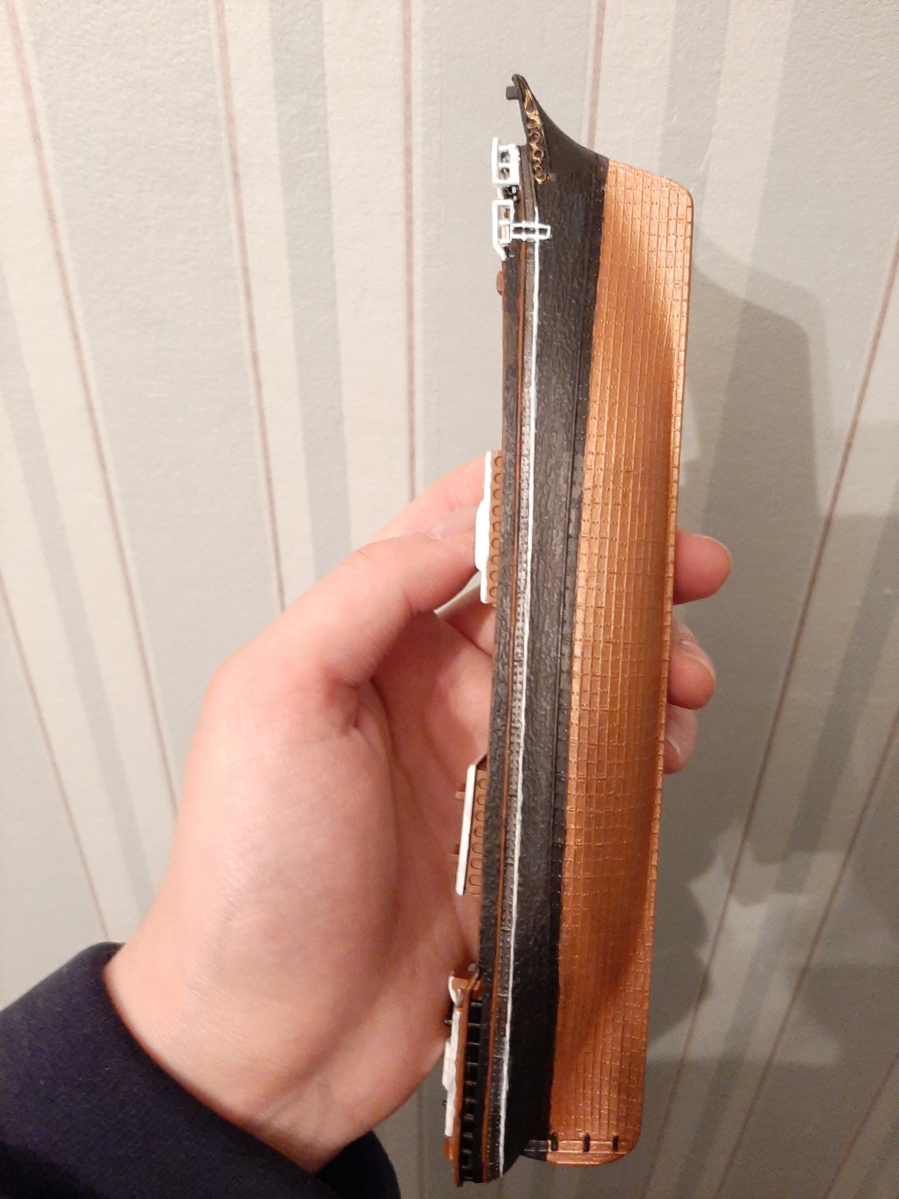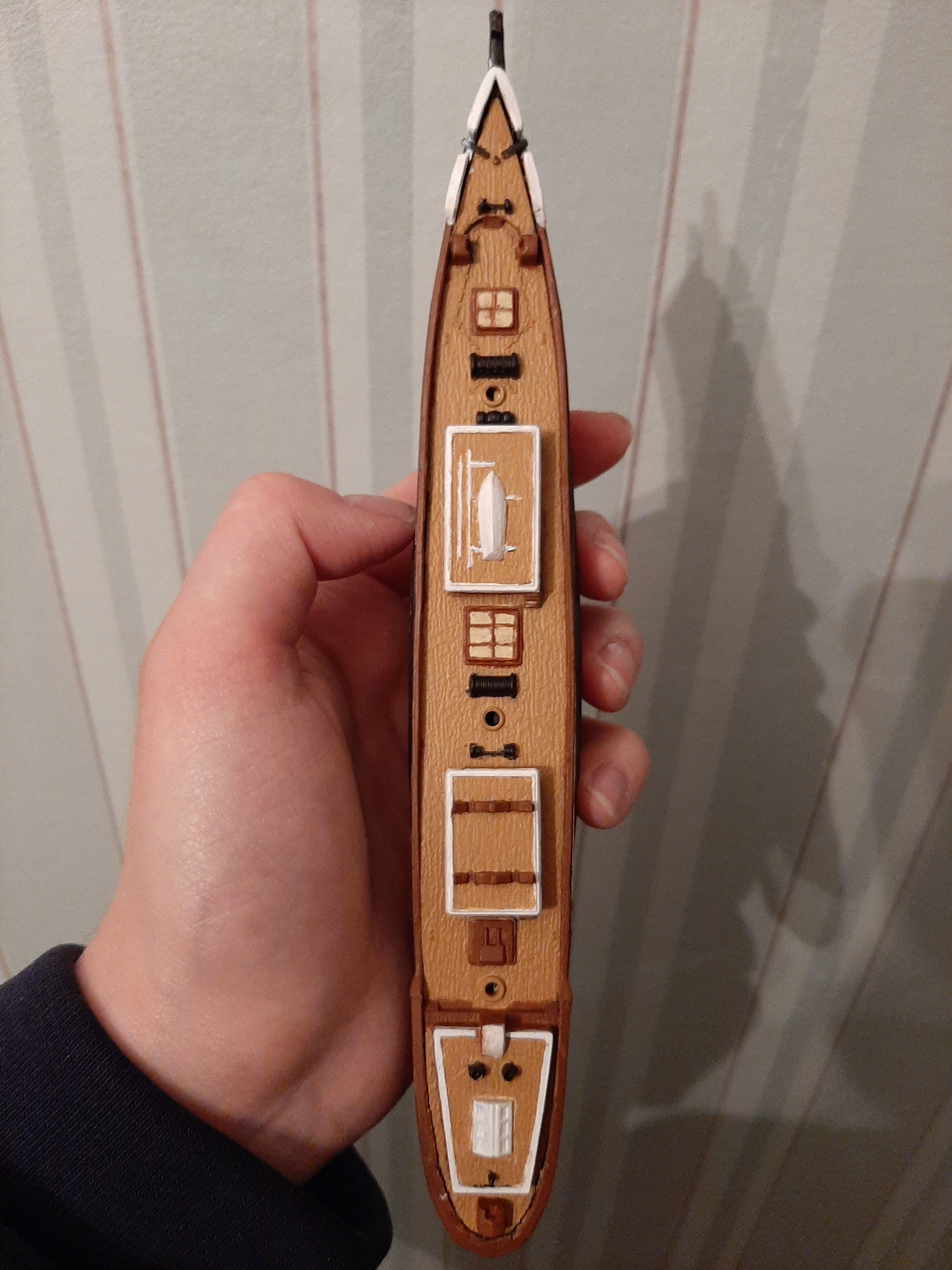 С такелажем.... конечно, я всегда считала себя более менее умным и образованным человеком, не "блондинкой", но... даже со схемой я ничего не понимаю, с чего начать, как крепить, куда завязывать! Думаю, когда уже все шлюпки приклею, начну с бушприта. С ним более менее разобралась. С носовой фигурой... дотянула я до китайской эпидемии и теперь уже фигурки не заказать. Буду тогда лепить из подручных средств. А с парусами тоже пока в раздумьях. Амбиций много, но смогу ли я это все выполнить? Вот и думаю, мб пока что сделать изкоробочные паруса? Планирую также нарисовать золотой узор. На задней стороне корпуса. Хотя бы наметить.