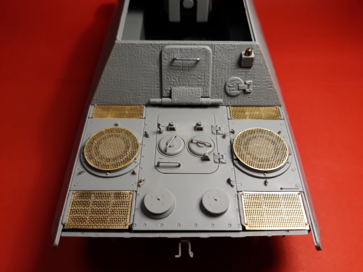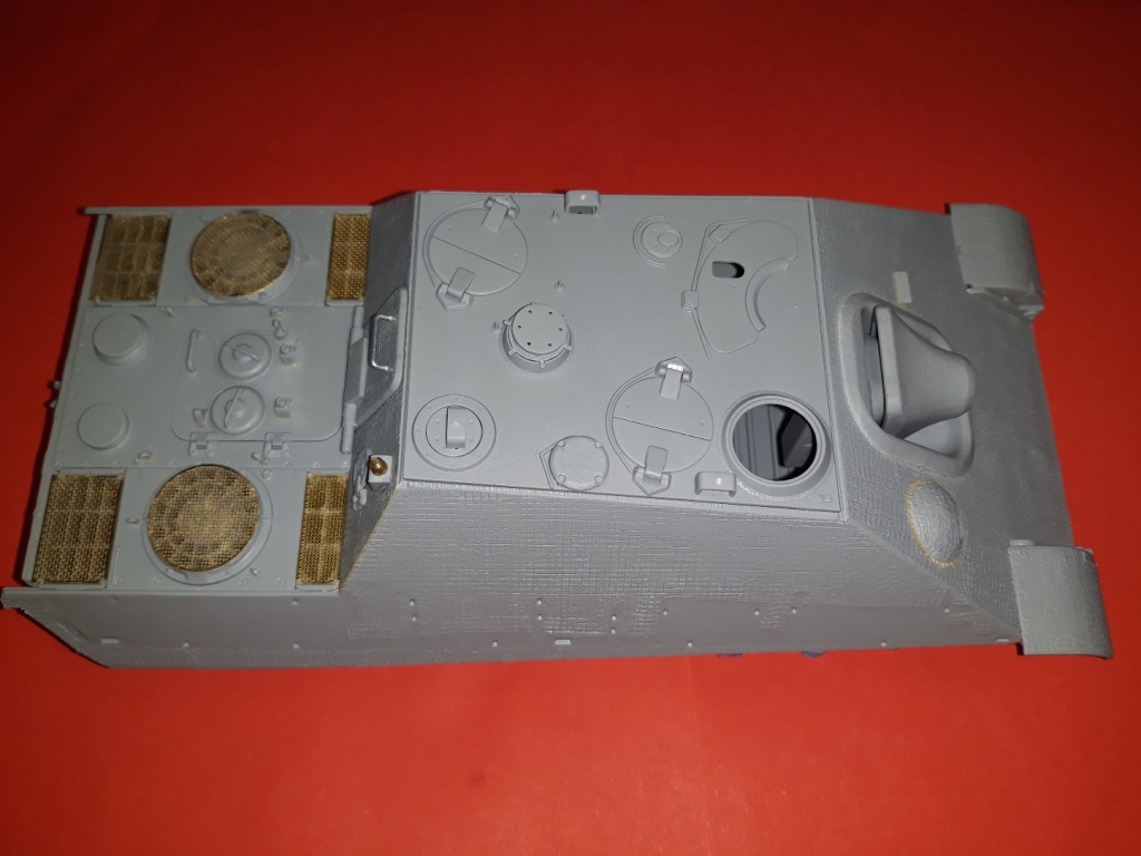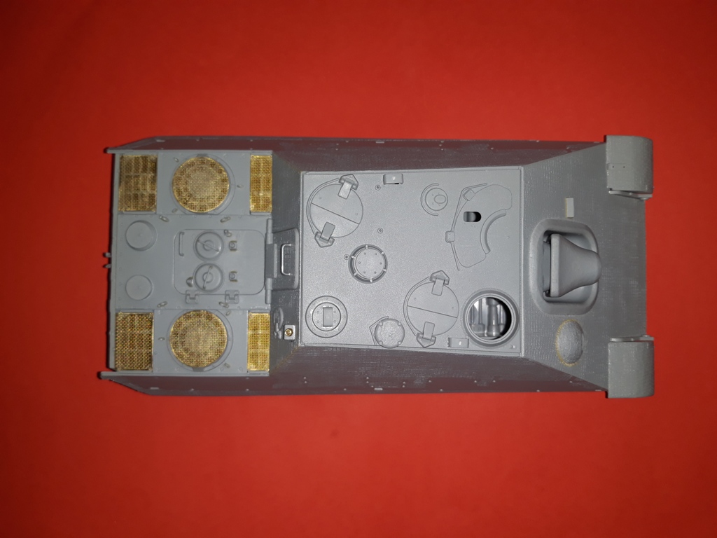 Неожиданно быстро почти собрал крышу рубки. Учитывая, что машина выходит явно осеннего выпуска поставил все ж лючек под мортирку, к осени то немцы все ж нарыли их наверное. Да и думаю, что на ранее выпущенные без оных в ходе ремонта устанавливались, не сложная задача, тем более, что отверстие под нее есть.