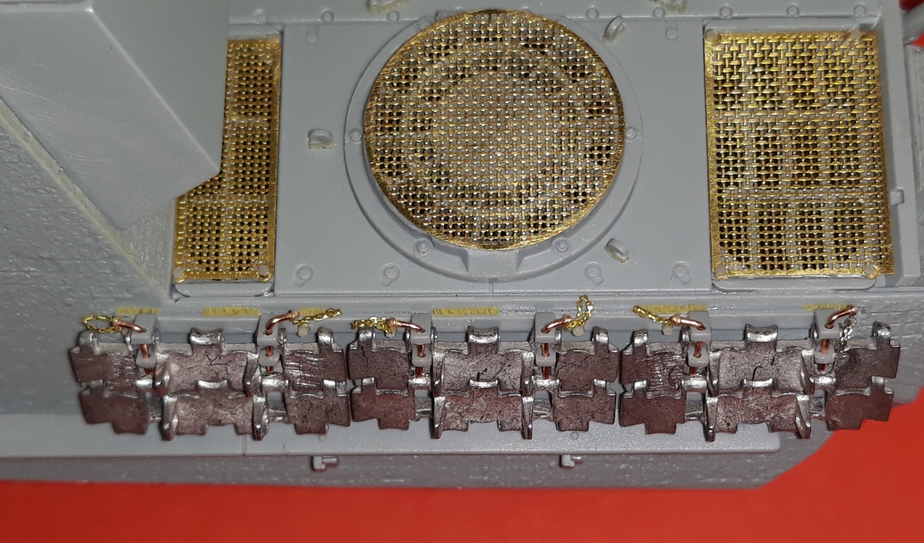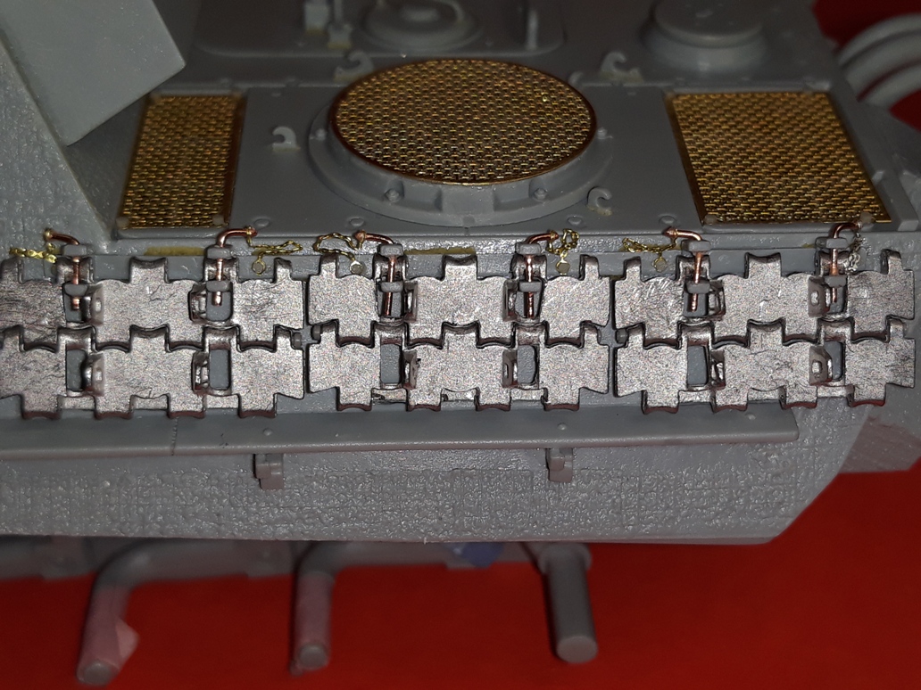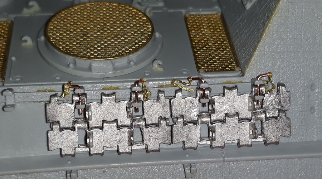 Сегодня приладил на место запасные траки и эти пресловутые цепочки, найденные в закромах от Пантеры.