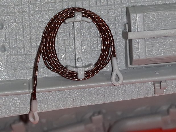 Почему заметно, что он короче: штатный трос укладывается от крепежа на борту до U-образного держателя на корме с противоположного борта. Это если мы "по-классике" делаем. Стало быть, тут - короче на ширину корпуса машины почти.