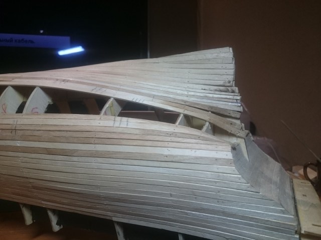 Фанерка у Artesania Latina поганенькая пока положил 5 рядов обшивки сломал 4 топтимберса, чуть задел сразу ХРЮК. Планки обшивки тоже то еще г ,от Альбатроса осталось немного липовых ,с ними куда как приятнее работать.