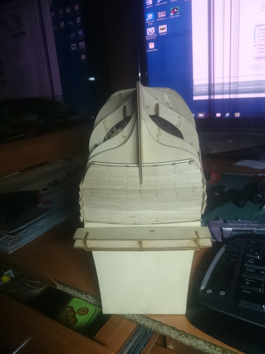 Сейчас каркас готов к малкованию ,но так как фанера на шпангоутах жидкая возникает вопрос будут ли будут ли держаться в ней гвозди при обшивке. Шпации заполнять неохота. Также вызывает вопрос палуба бака она не прилегает ко 2 и 3 шпангоуту, а висит на первом и детали 66В стенке передней надстройки как ее ДА обозвал.