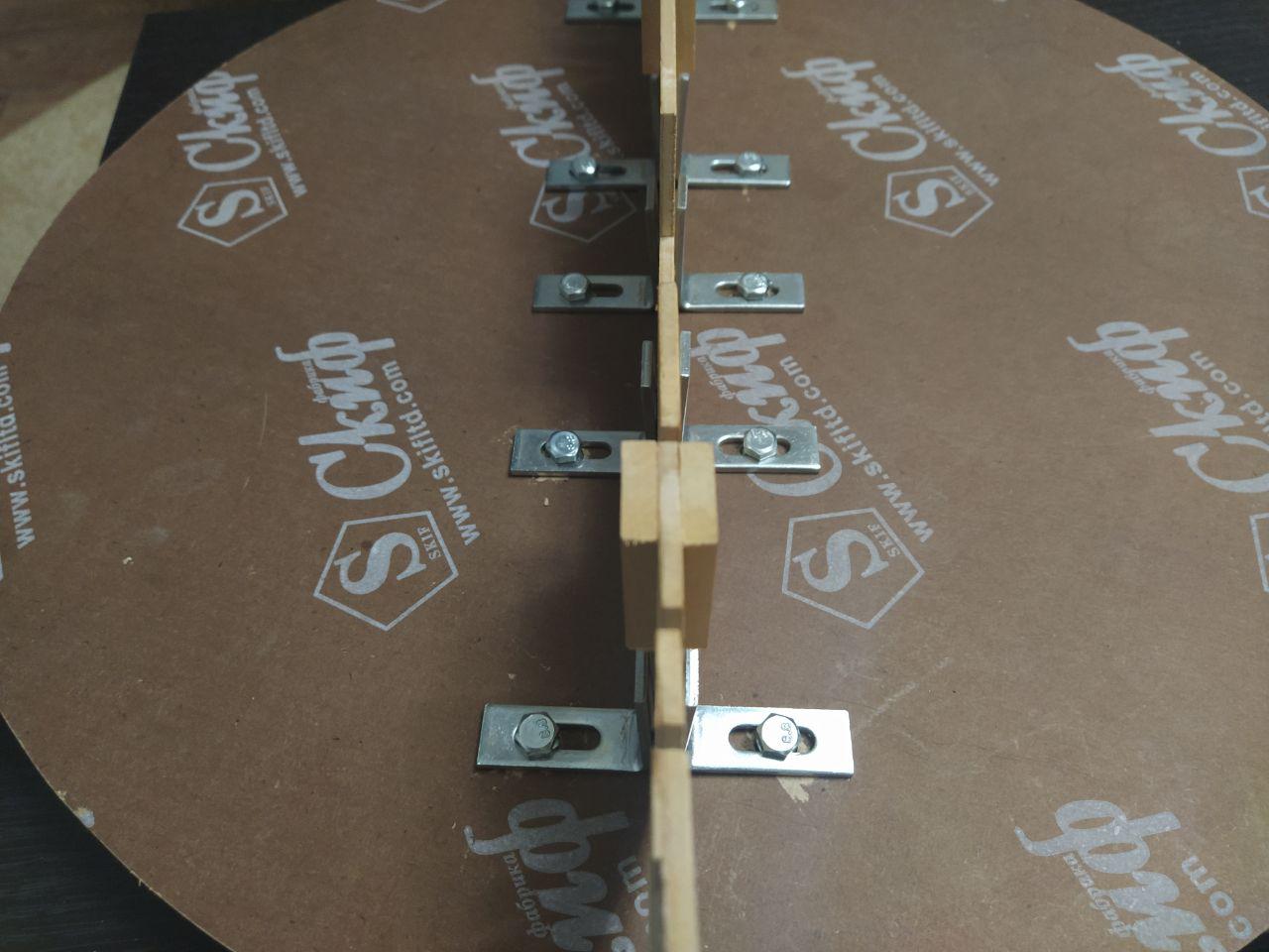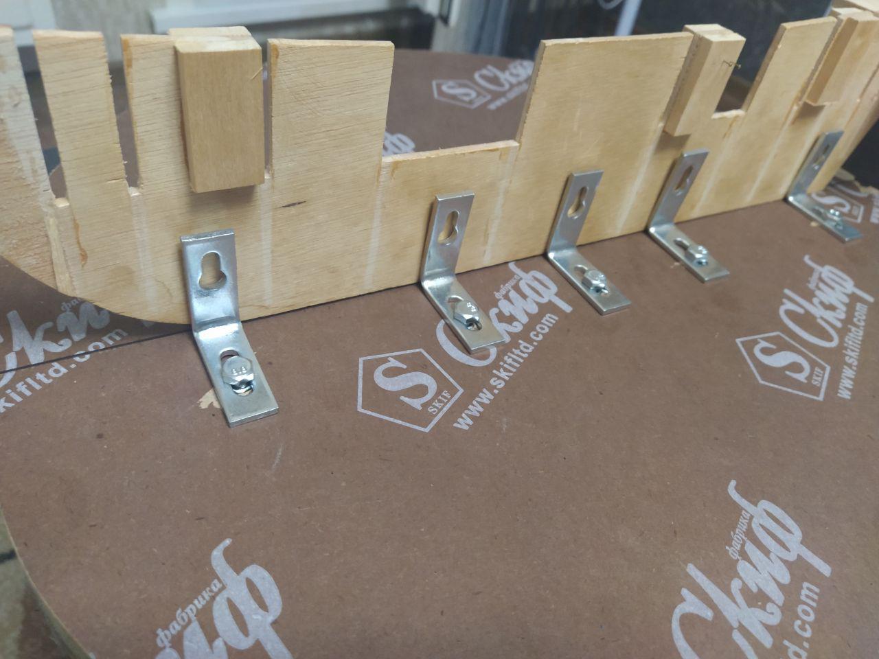 Отчертил линию по центру деревяшки, просверлил отверстия на расстоянии 3 см. от нее, чтобы они между шпангоутами были, вбил молотком гайки, зафиксировал ровно по длинному уровню с одной стороны уголки, ну и все.