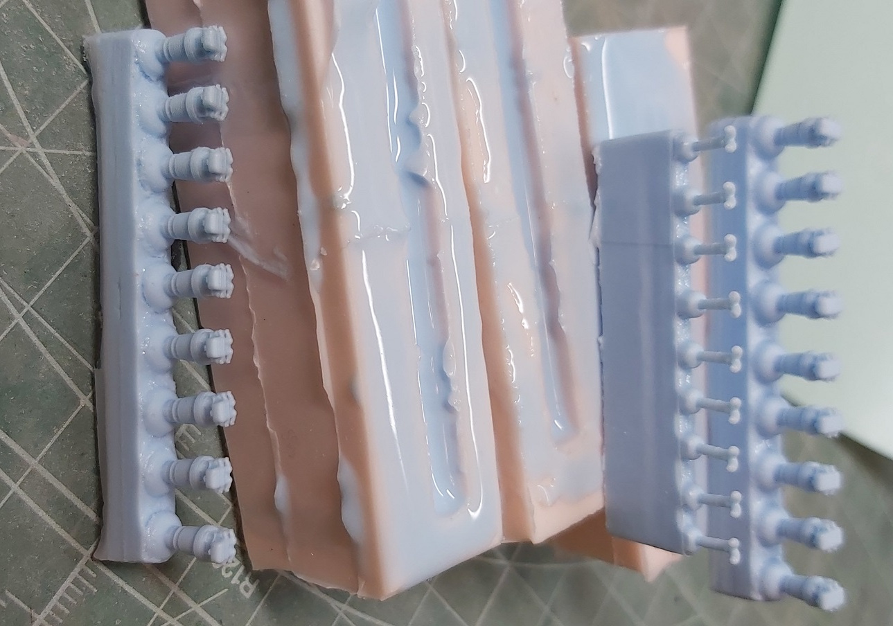Получены путем копирования в силиконе и отливки из полиуретановой смолы, сперва промежуточной детали, на которой имитировано провисание полотна. После эту деталь отформовал в силикон и отлил детали для модели из смолы.