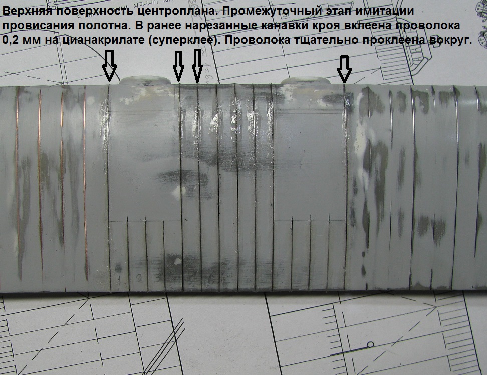 Промежуточный этап имитации провисания полотна, изображенный на фото, заключается во вклейке в ранее нарезанные канавки кроя проволоки 0,2 мм на "супер клей". Проволока тщательно проклеена (пролита) "супер клеем" вокруг. Учитывая размах крыла в 55 см. работать с крылом не особо удобно.