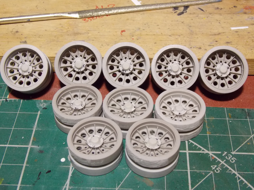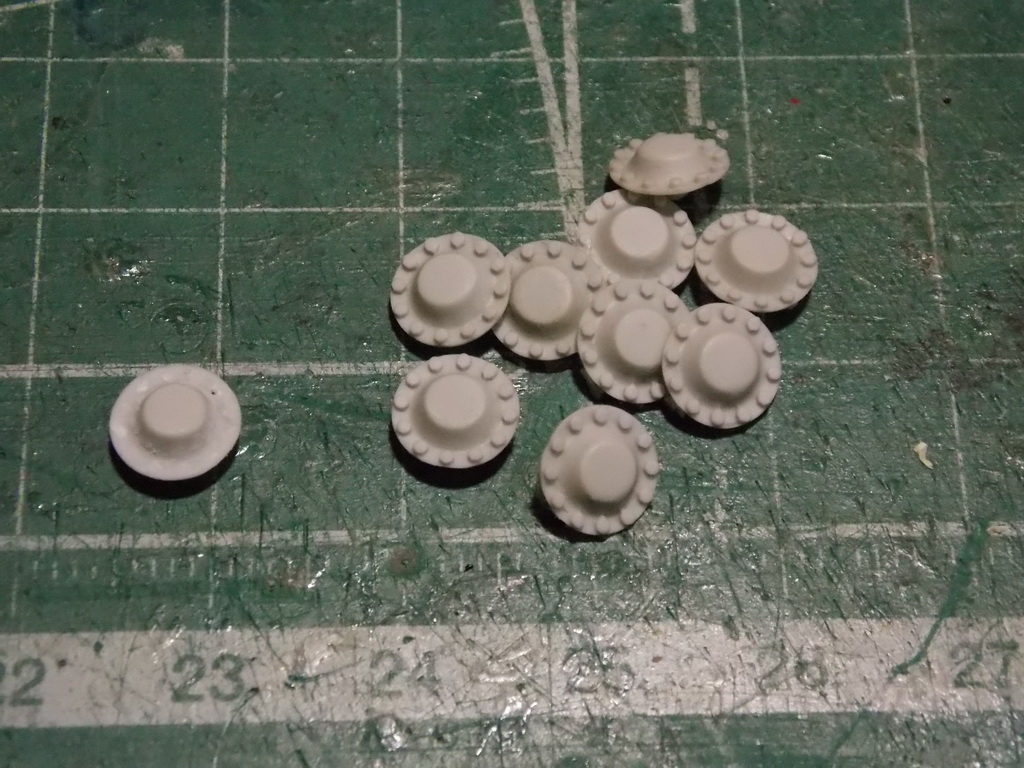 Спасибо товарищи! Итак,тягач решил поставить на ранние катки,мне они больше нравятся. Но было одно НО, у миниарма крышки ступиц о 12ти болтах,а надо о 5ти. Пришлось брить,и очень осторожно,смола в этом месте тонкая,да ещё нужно не потерять то,что срезал