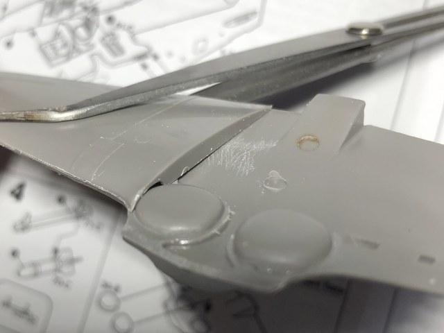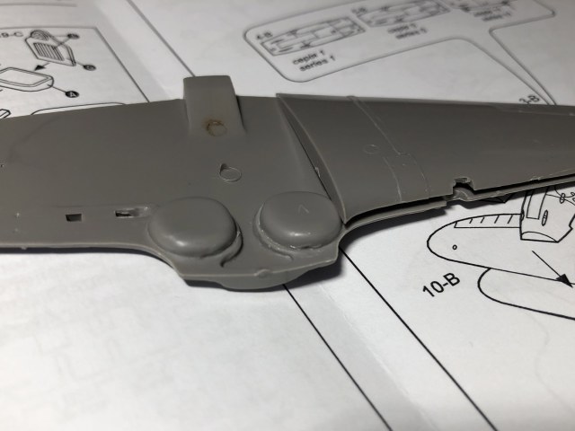 Однако, узнал я об этом только когда приклеил ниши к крылу. Пришлось срезать ниши и несколько уменьшить их глубину (на фото видно в сравнении). А также вынул немного пластика из перегородки крыла.