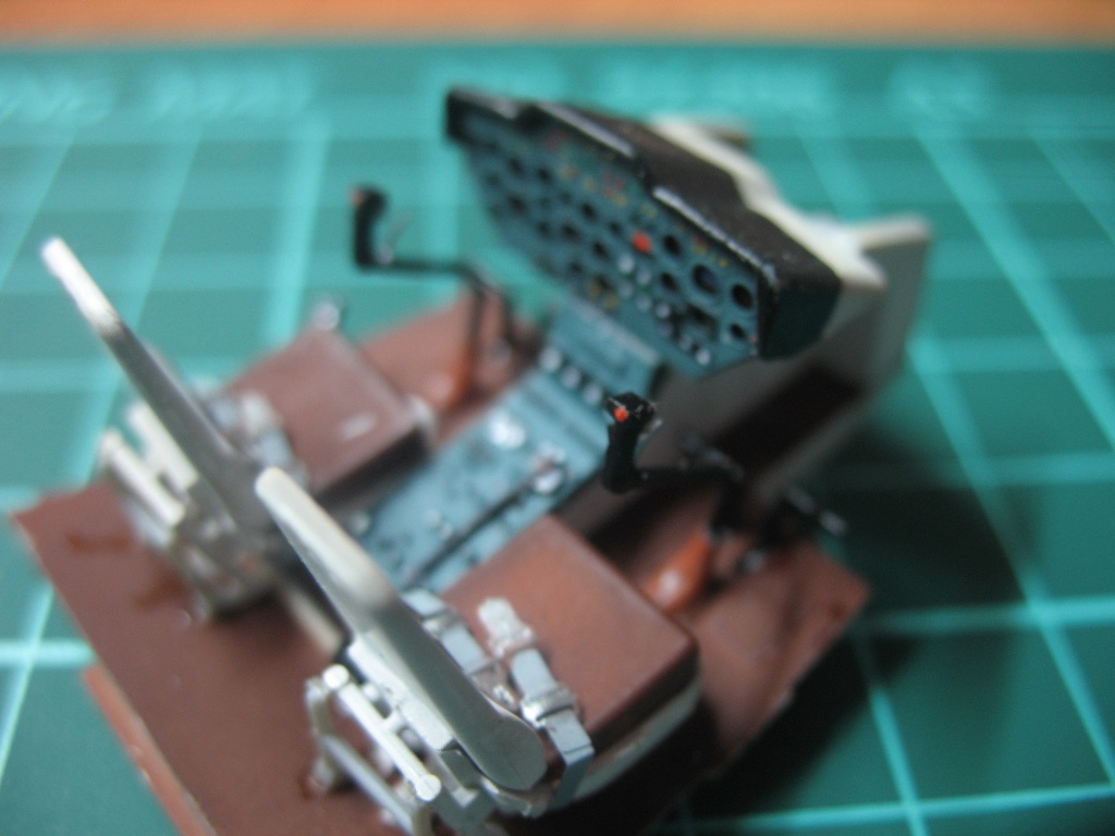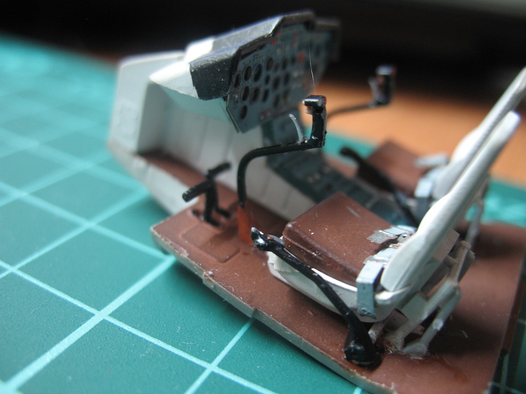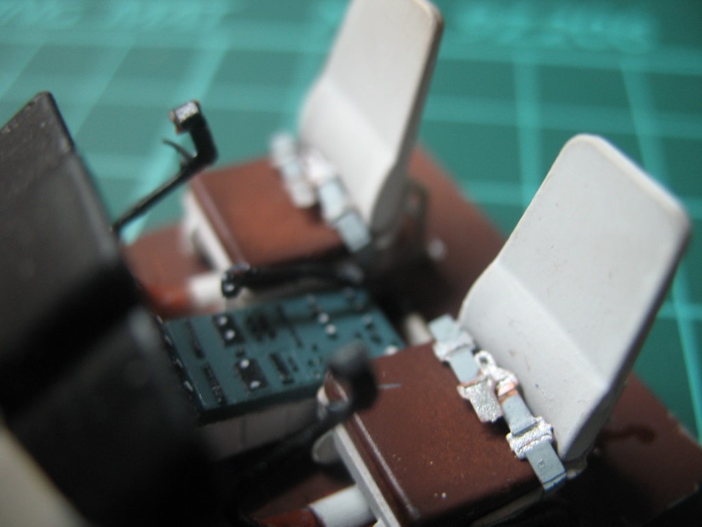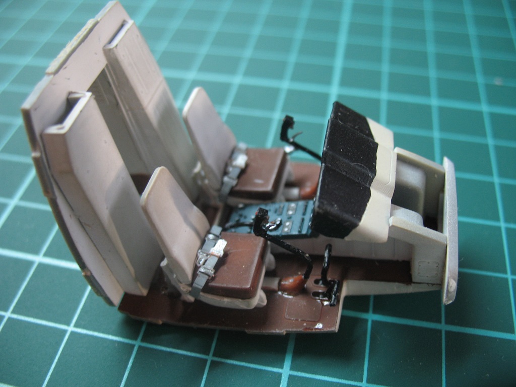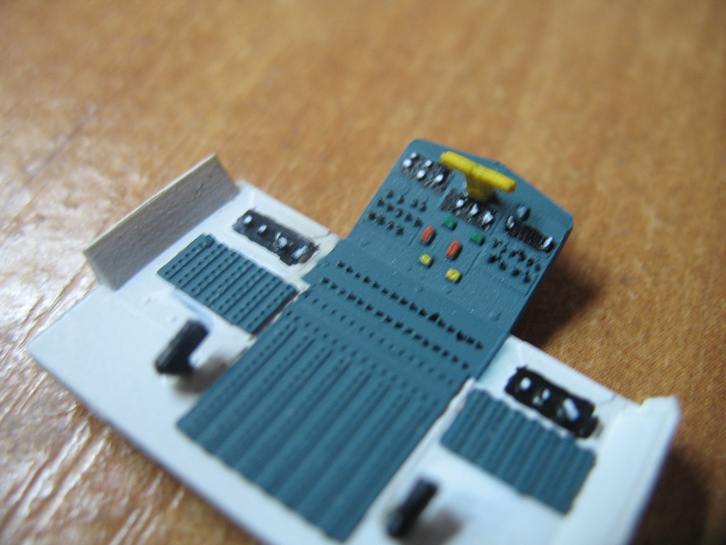 Вклеена приборная доска с центральным пультом.Нанесена арматура на пультах.На верхней панели вклеены АЗС-автоматы защиты систем.,РРР желтого цвета-рычаги рода работ.,лампы УФО.На полу вклеены педали-правая вперед,кто знает тот поймет.