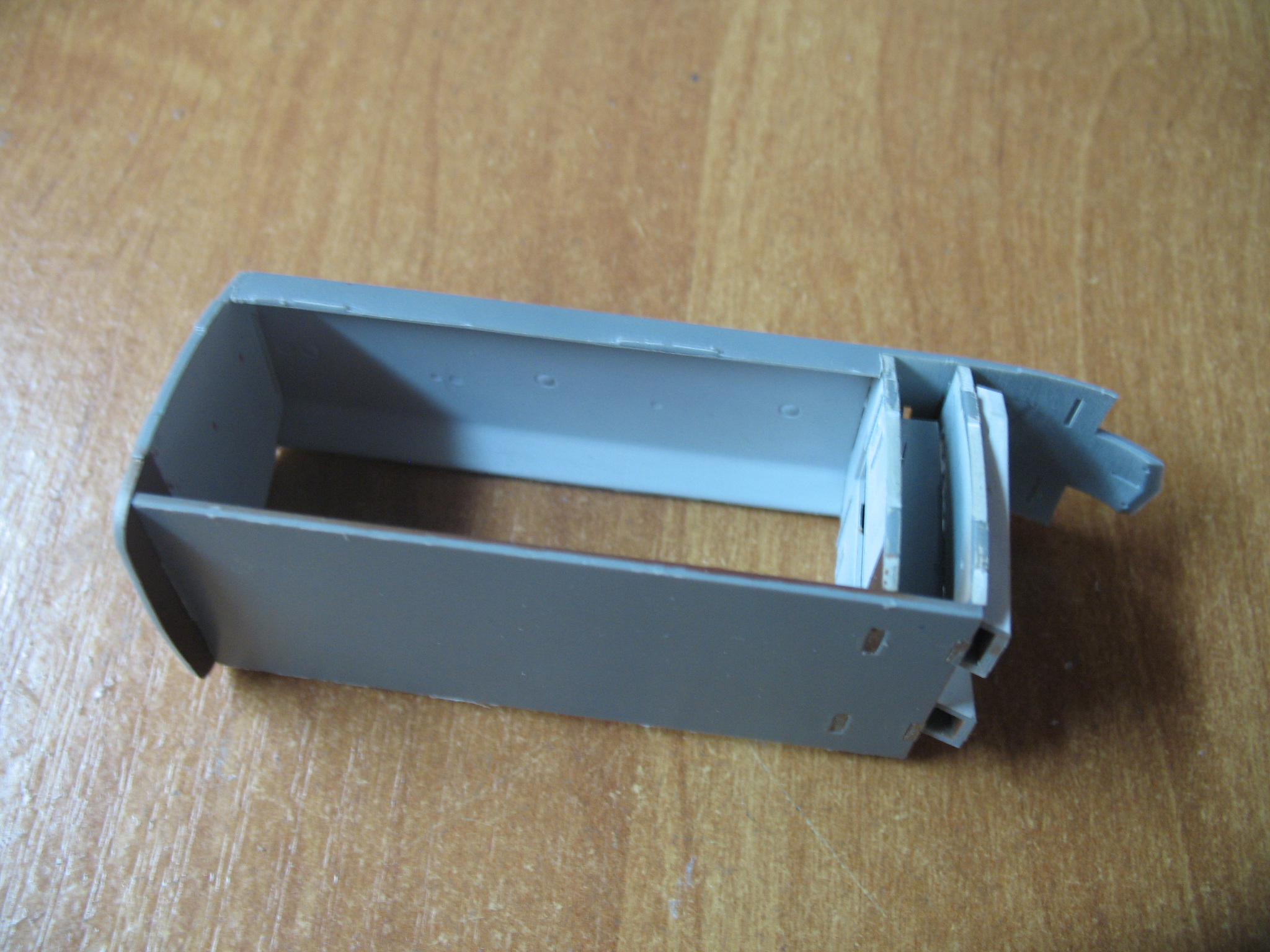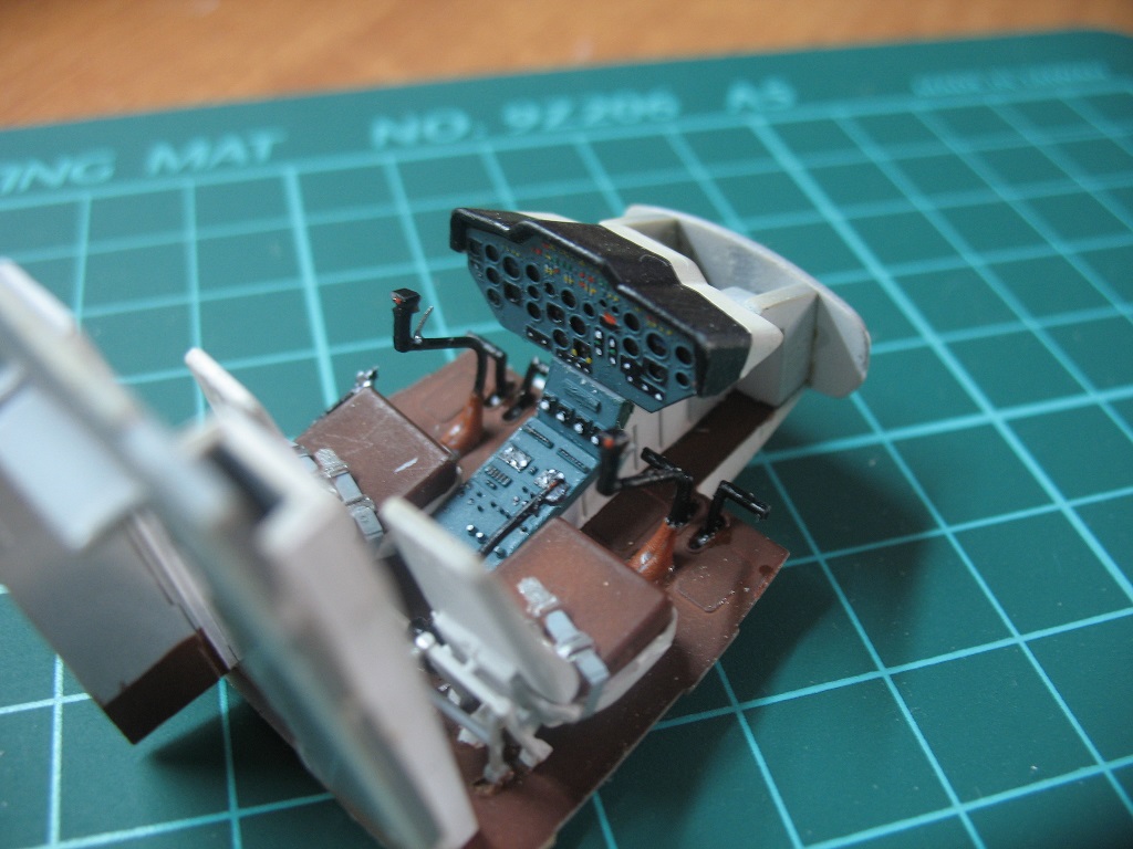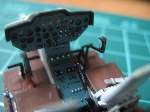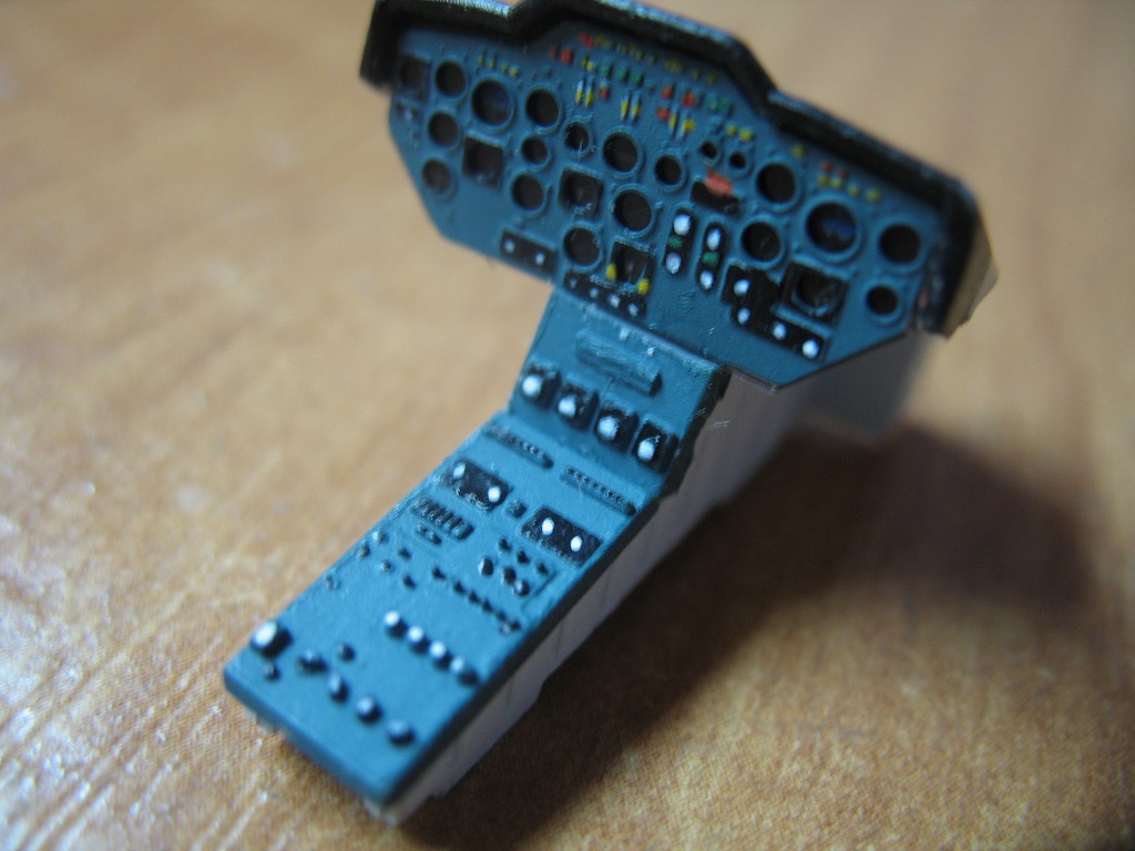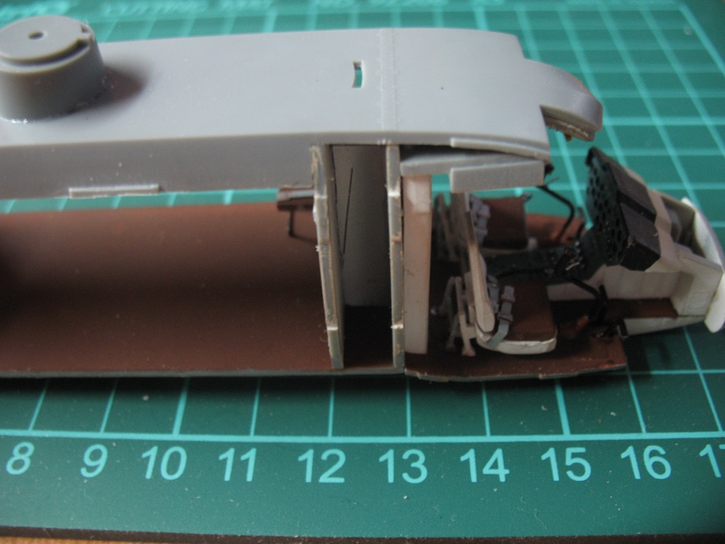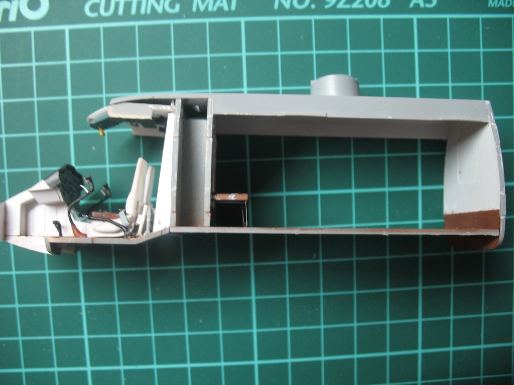 Вклеена приборная доска с центральным пультом.Нанесена арматура на пультах.На верхней панели вклеены АЗС-автоматы защиты систем.,РРР желтого цвета-рычаги рода работ.,лампы УФО.На полу вклеены педали-правая вперед,кто знает тот поймет.