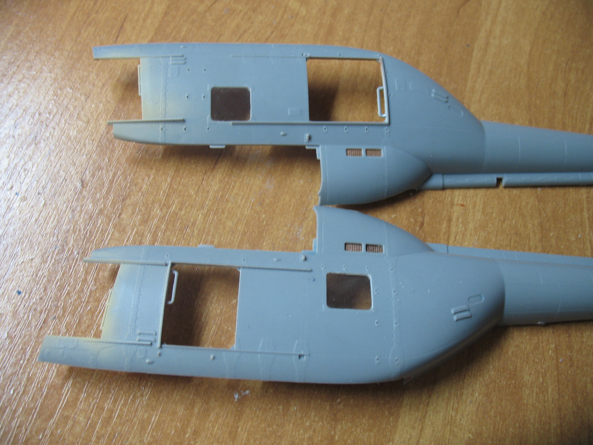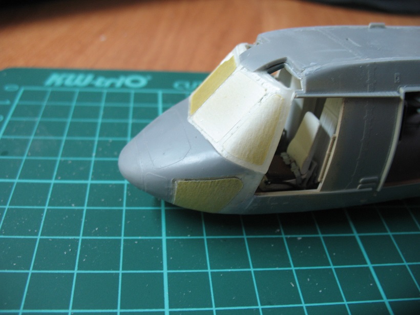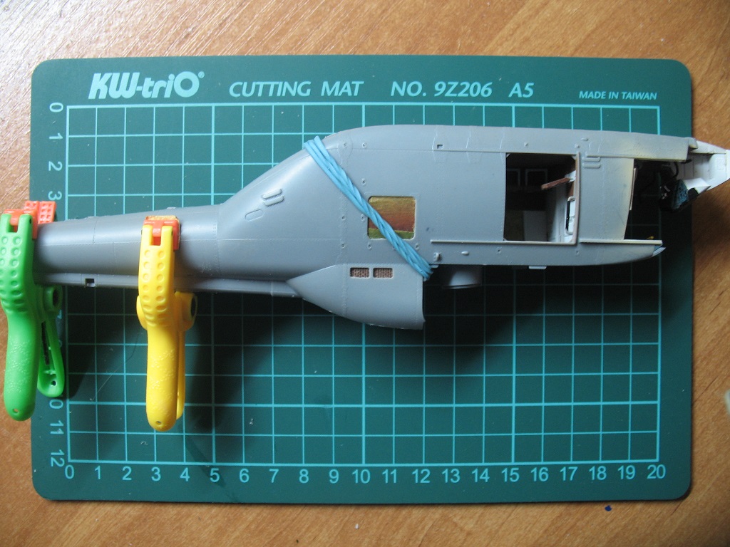 Собрана носовая часть вертолета.Сложилась довольно хорошо.При сравнении с первой серией оказалось различие носового обтекателя локатора,т.е.поздние модификации уже пошли более заостренные.Пришлось малость затупить обтекатель.Собрана вместе пилотская и пассажирская кабина.