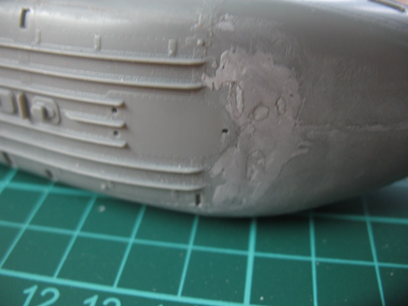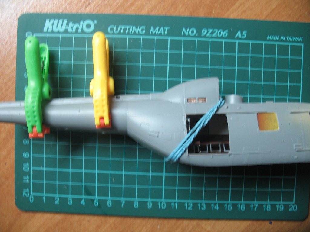 Установлен редуктор и полностью закрыт заредукторный отсек. Но большая засада меня ждала при присоединении носовой части к фюзеляжу-ну никак не хотела становиться на место.Давно я так не матюгался.Что то все ей мешает,во что то все упирается.подтачивал,подтачивал-кое как установил.Мне кажется ,что нужно изменить порядок сборки.Не собирать полностью носовую часть,а только носовую без фонаря,тогда видно будет где что мешает установке.А затем по месту приклеить и фонарь.Сопряжение задней части фюзеляжа с днищем тоже потребовало шпаклевки-буду выводить.Перед тоже подшпаклевал -убрал щели.