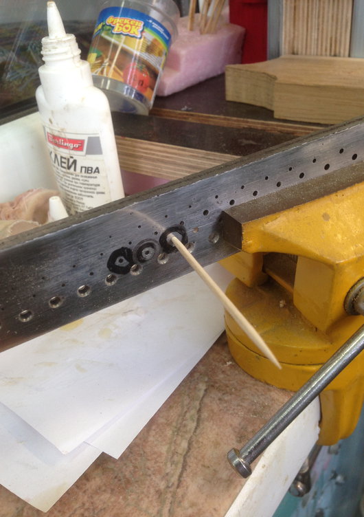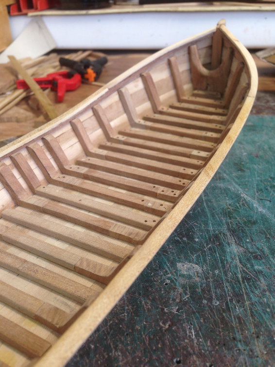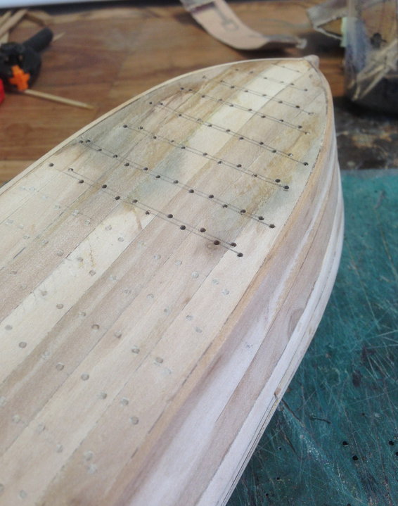 Всем привет ! Сделал планширь и начал гвоздевать днище...... На натуральном сверлится отверстие насквозь и деревянными круглыми чепами с расклинкой с двух сторон скрепляются доски к балкам шпангоута - у меня тут проще..... Сверлю по краям насквозь, что бы разметить снаружи и оттуда на пол глубины для чепиков. Внутри будет палубная доска поэтому все закроется , а снаружи все как надо получается....... Чепики делал бормашинкой через калибровочную планку, потом воткнул на место обрезал и дальше зачистка. Думаю понятно расписал...... Фотки будут наверное не по порядку но по номерам можно понять что за чем...............