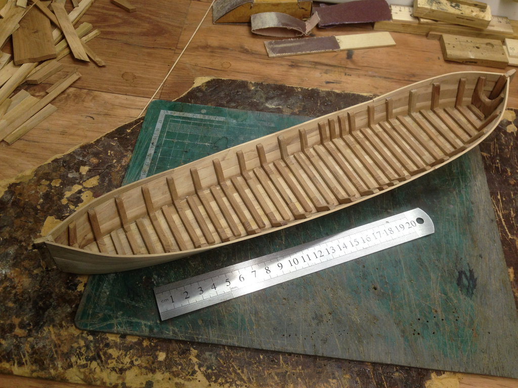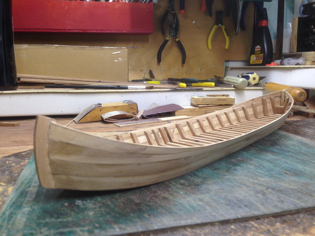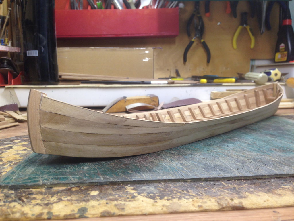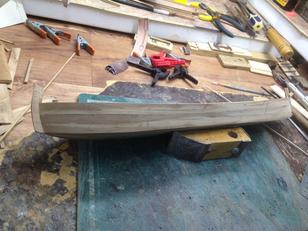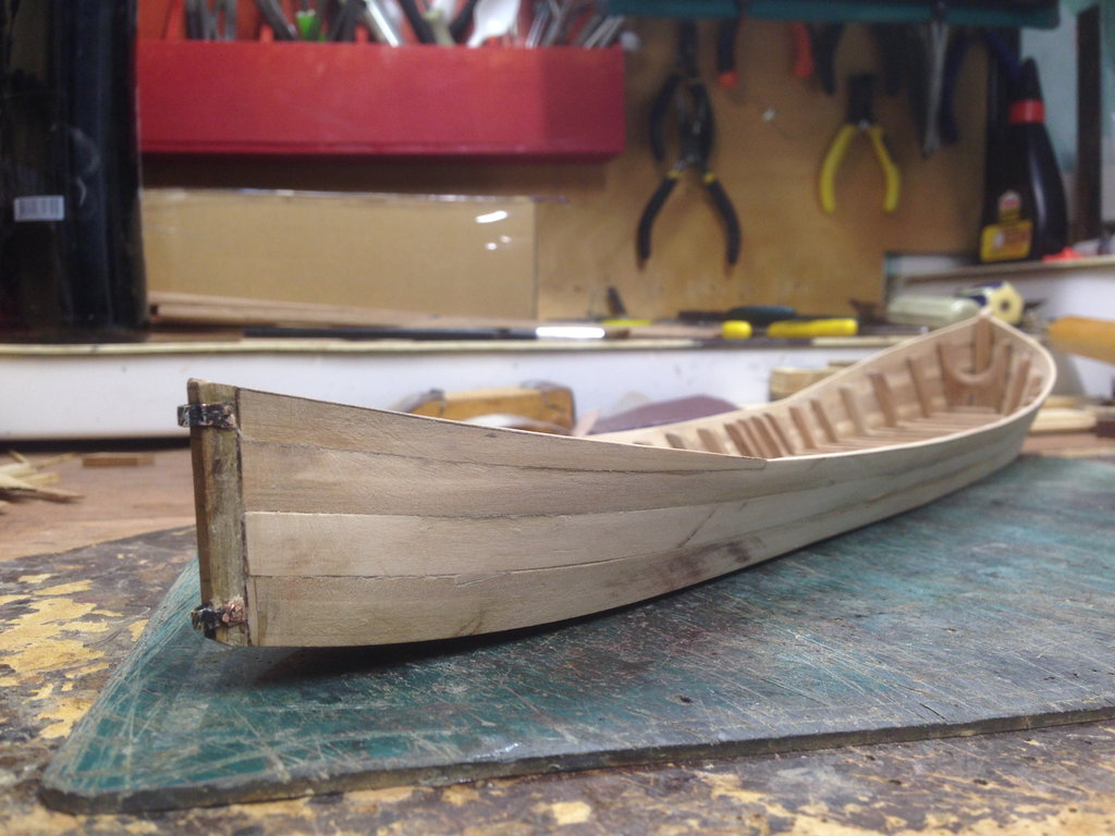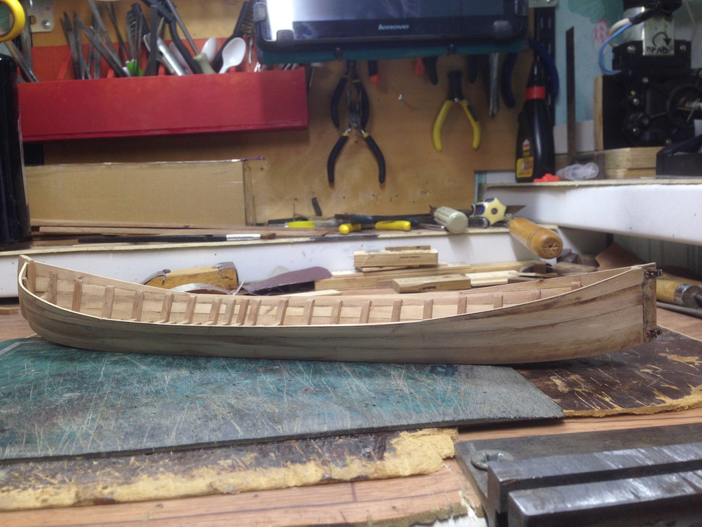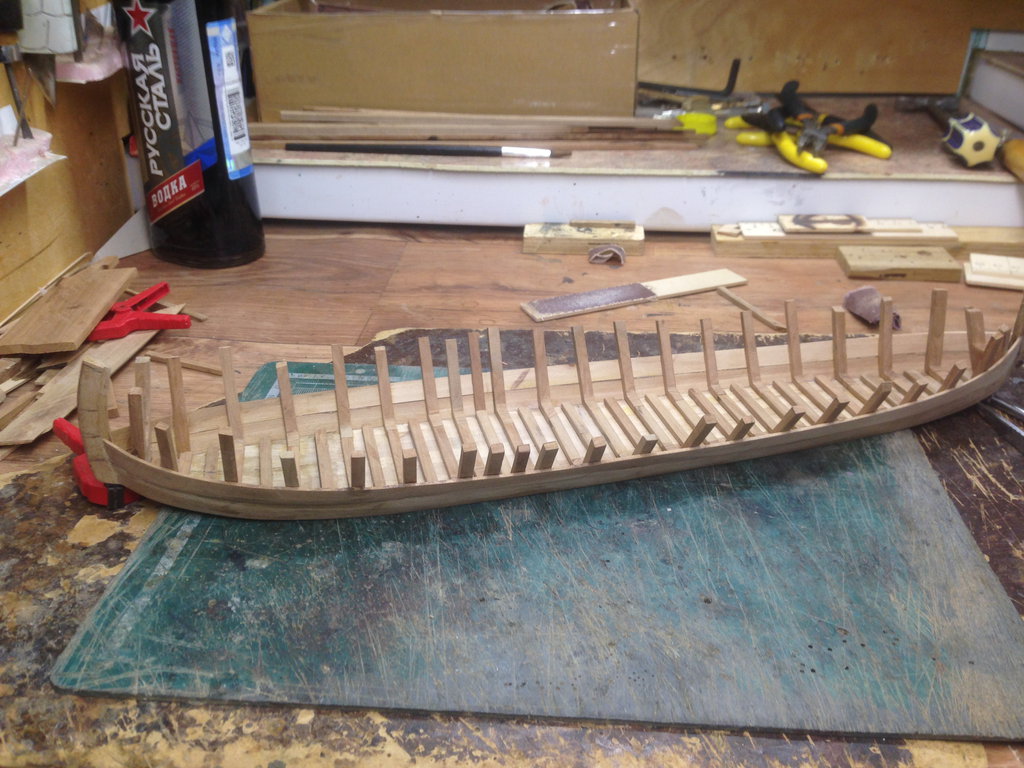 Первый ряд обшивки поставил, вроде все по плану идет. Далее еще один пояс, потом буду ставить шпангоуты и после последние 1.5 ряда основного борта..... ну все по порядку , пока вот что на сей момент...................
