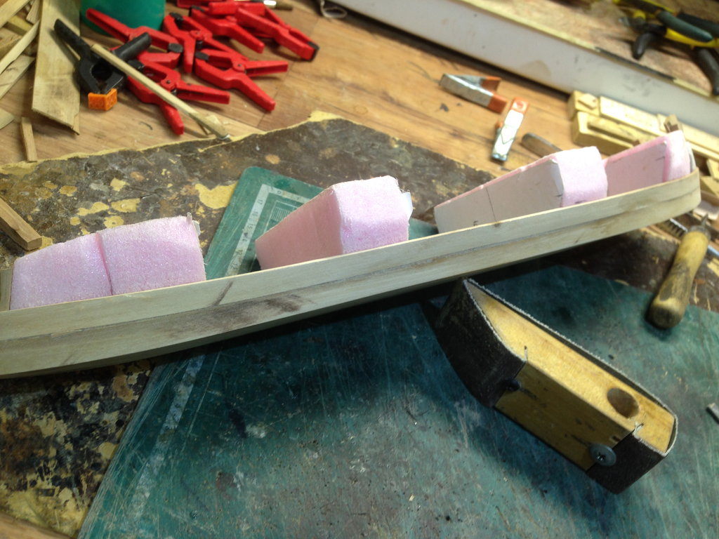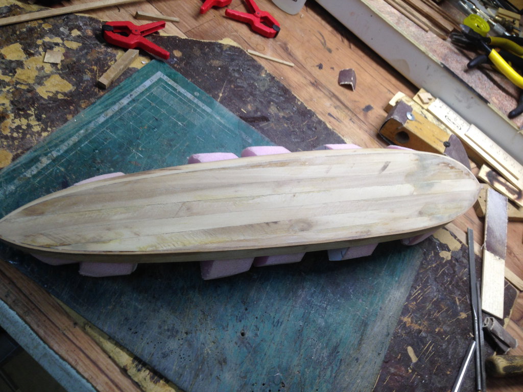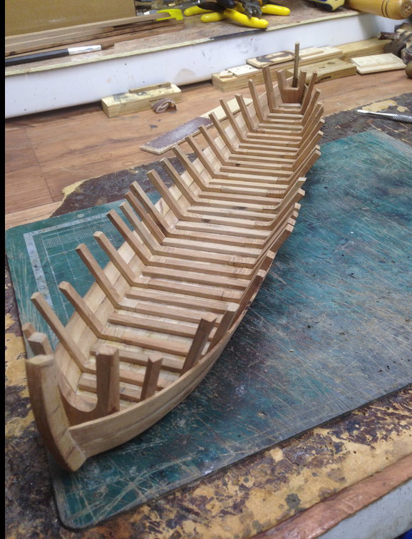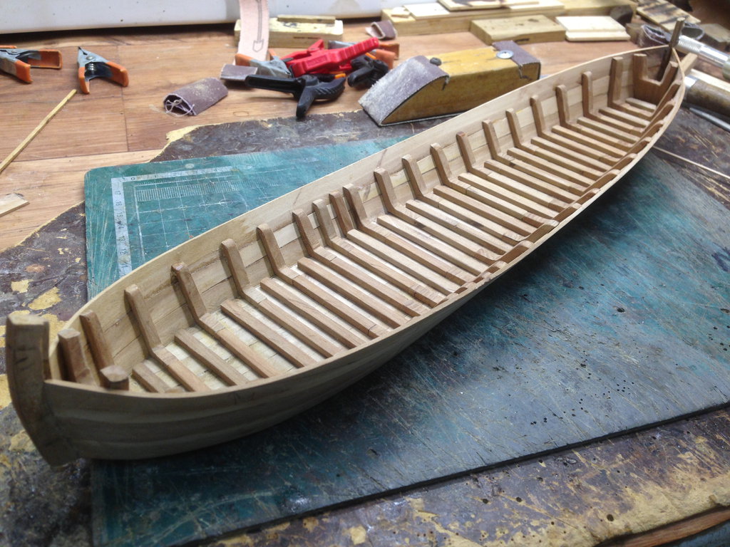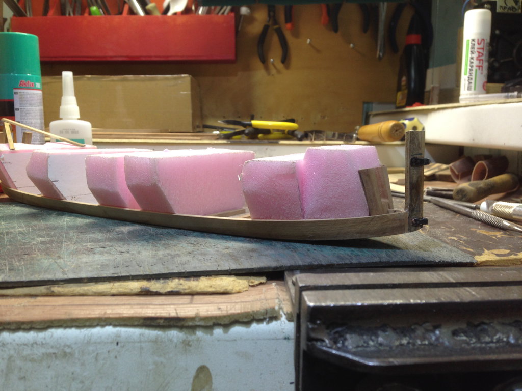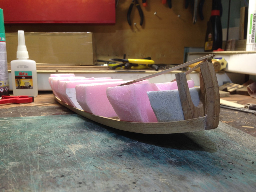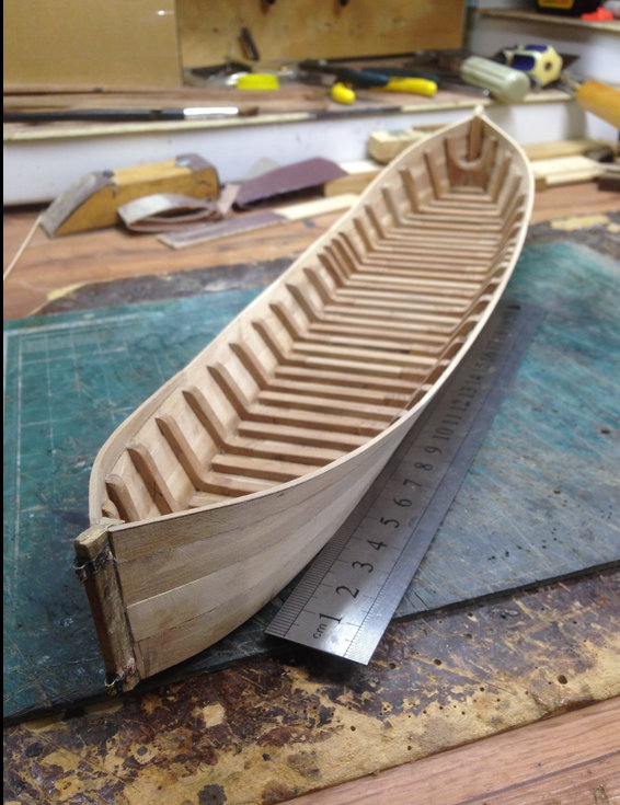 Первый ряд обшивки поставил, вроде все по плану идет. Далее еще один пояс, потом буду ставить шпангоуты и после последние 1.5 ряда основного борта..... ну все по порядку , пока вот что на сей момент...................