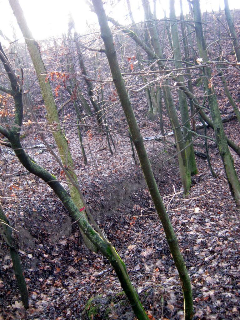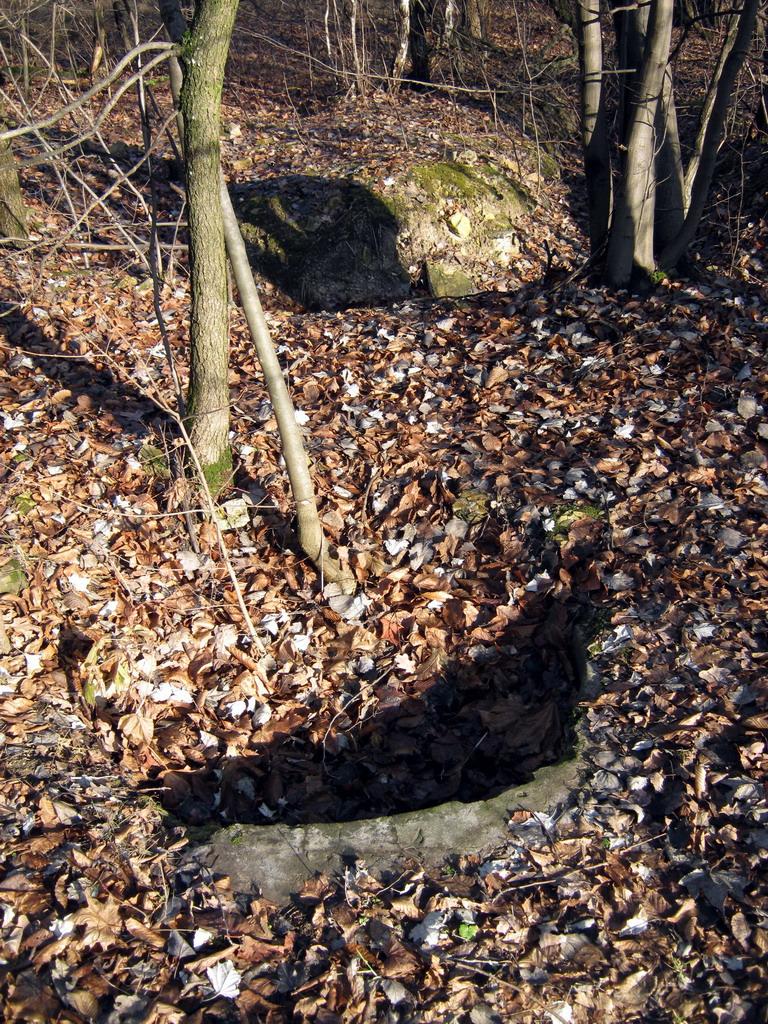 Потерна №7. Здесь вышеупомянутых боковых проемов два. Выход из потерны обрушен, очевидно, в результате взрыва. Характер разрушения на фото 21, предполагаемое место выхода – на фото 22, в этом месте правильность земляной насыпи сильно нарушена и оно как раз напротив входа.