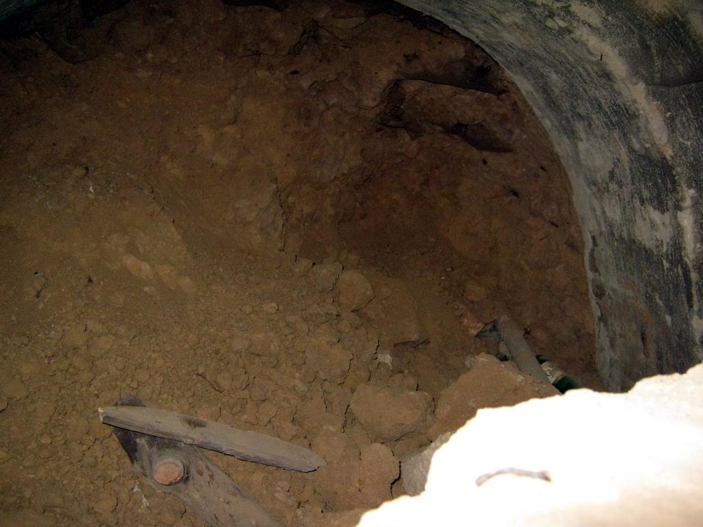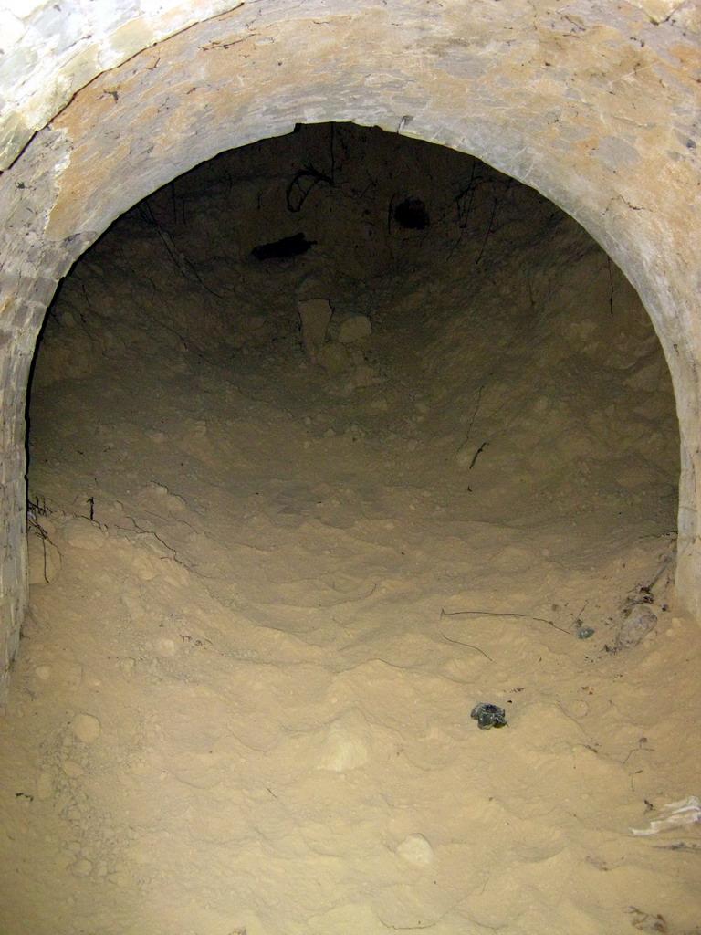 На фото – потерна №8. Выход в настоящее время заложен кирпичом. Интересная особенность – слева от входа некий проем, также заложенный кирпичом, но гораздо раньше. За ним – земля. Что это? Может, потерны собирались соединить между собой, но потом раздумали? Дело в том, что такие проемы имеются далеко не во всех потернах.