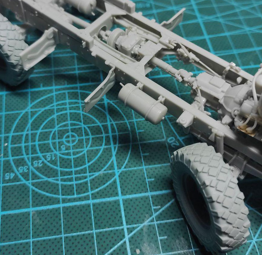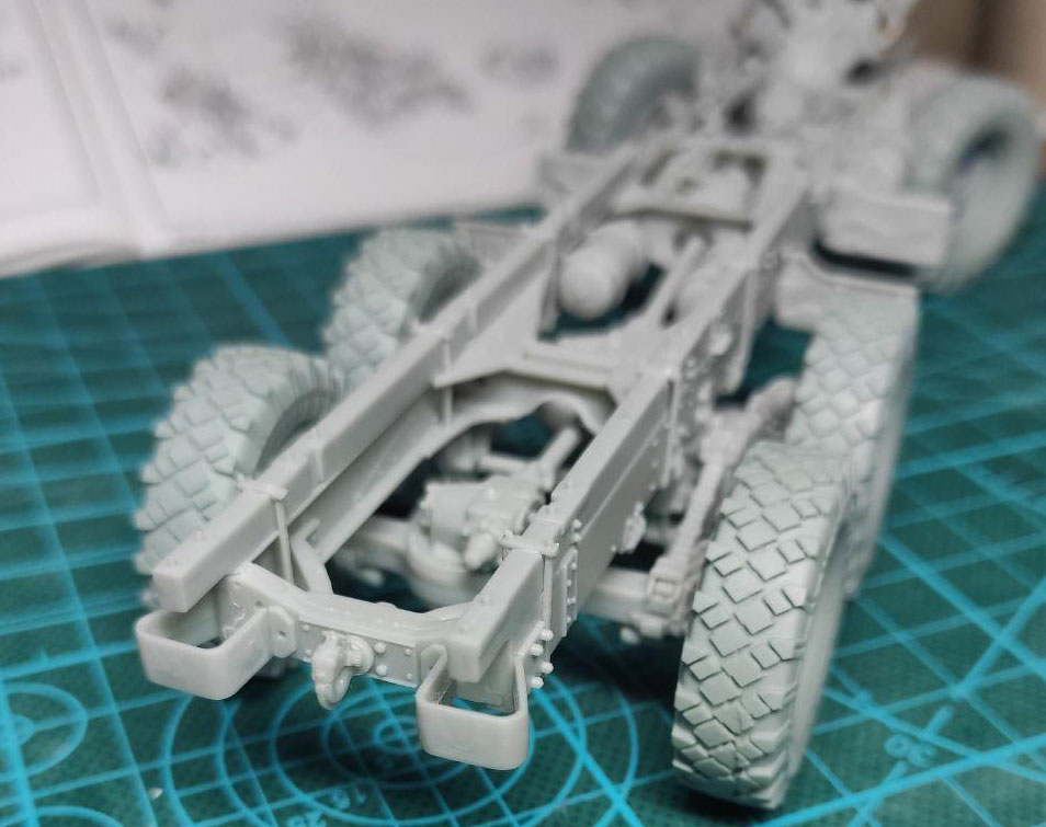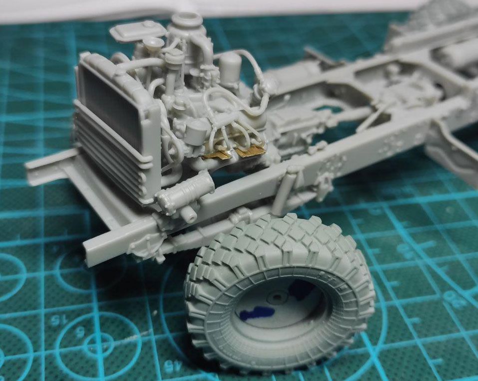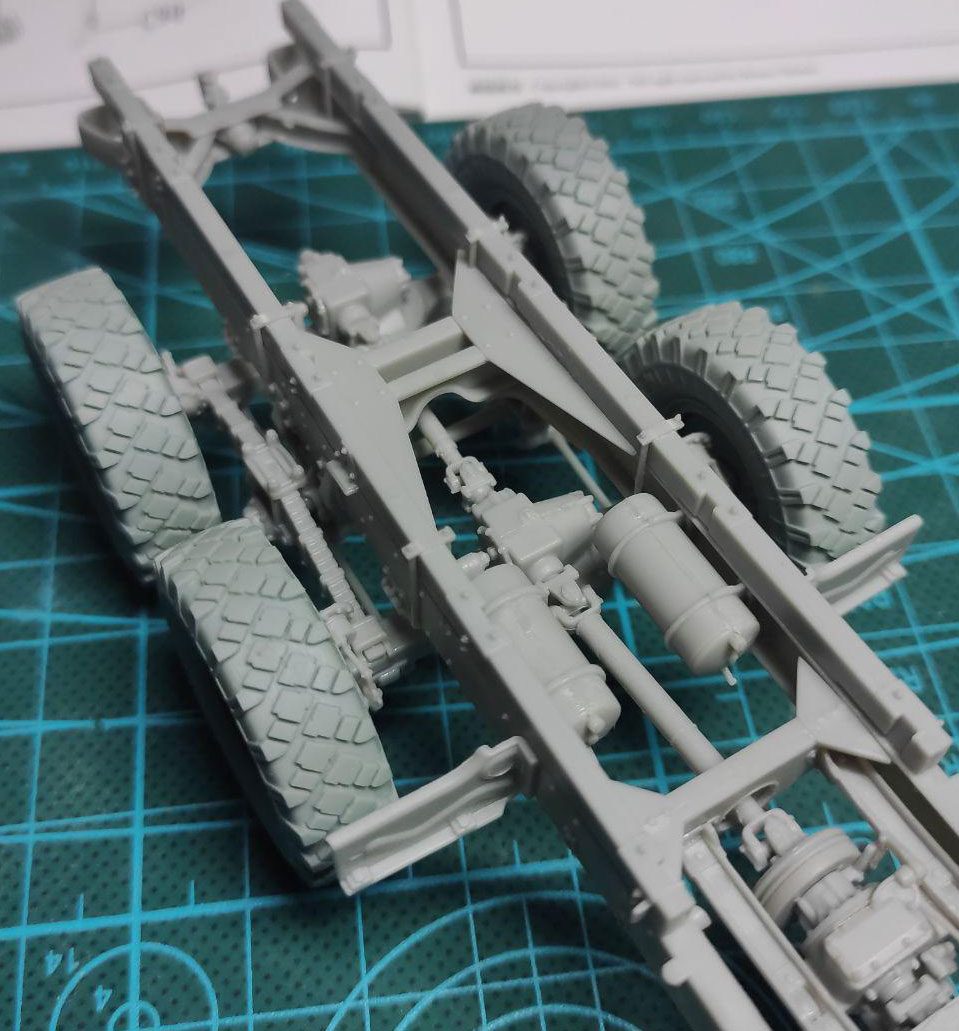 Рама собрана. Наборные колеса мне совсем не понравились. Один шов по середине протектора чего стоит. Заменил на смоляные от MiniArm. Небо и земля! Правда 2 диска были деформированы. Но гипяток и терпение помогли исправить ситуацию. Кстати, по инструкции колеса должны стоять строго прямо. Но у меня получилось сделать их в повернутом виде. По моему личному мнению, так модель будет смотреться значительно интереснее.