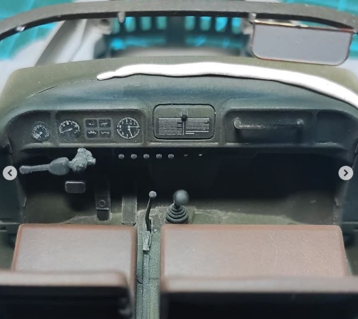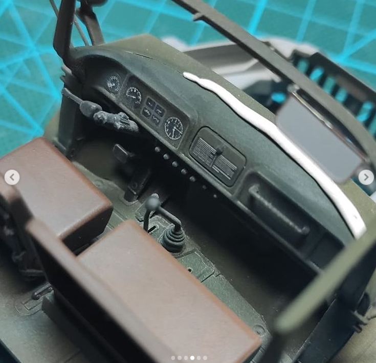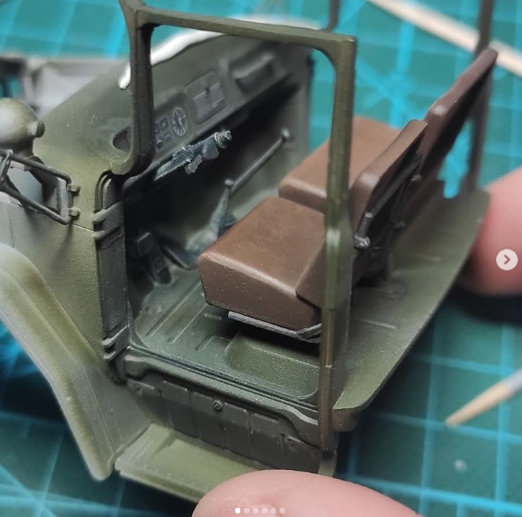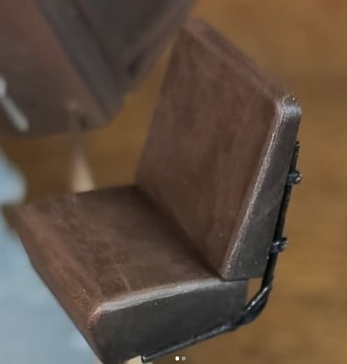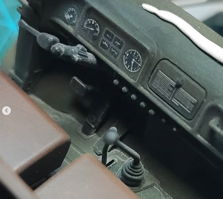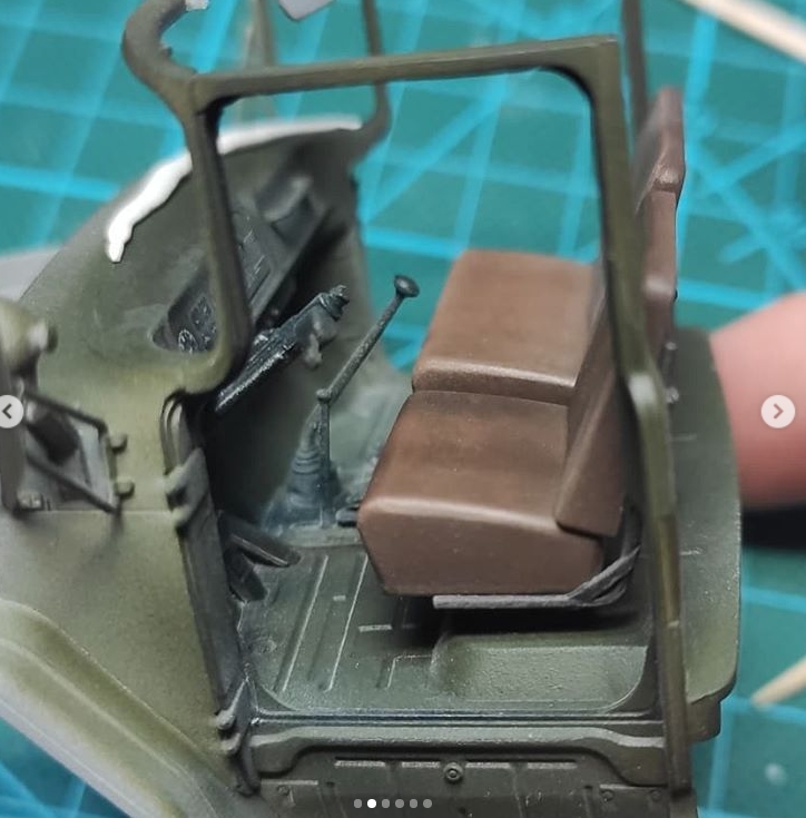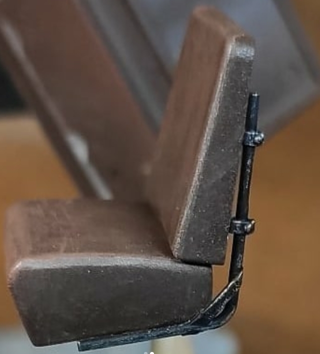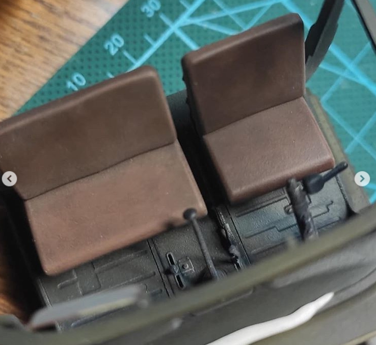 По поводу сидений. На пластике не было ни имитации складок, ни имитации текстуры. Просто ровные поверхности. Смотрится скучно, поэтому решил попытаться симитировать потертости. Базу седушек покрасил аэром, краска Tamiya XF-79 (Linoleum Deck Brown). Может цвет и не до конца уместный, но у меня в наличии был только такой. Посчитал, что приемлемо. Далее прошелся сухой кистью, смесью из XF-79 и Mr.Hobby off white. Не скажу, что вышло ужасно, но и не фонтан. Главное, что однозначно интереснее, чем тупо в одноцвет. Первый опыт подобной работы, импровизировал. Раму сидений красил черной Valejo, а потертости металла делал сухой кистью и Citadel chainmail.