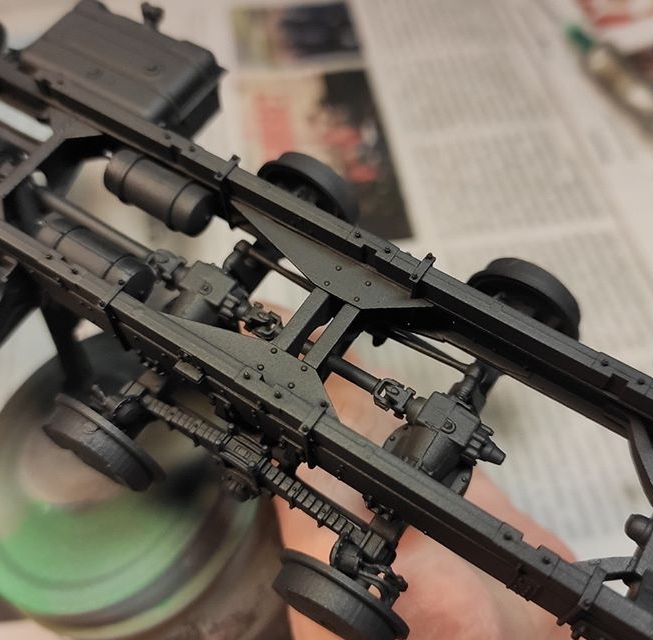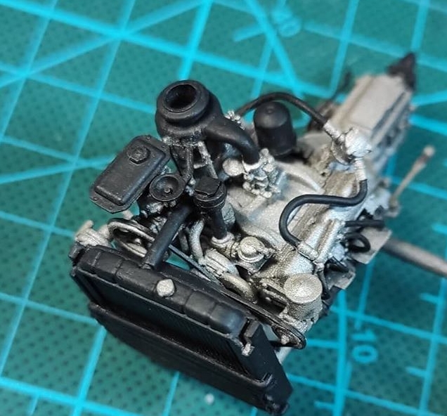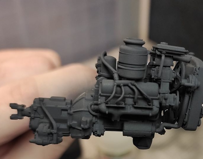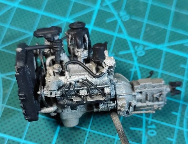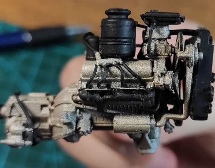 Двигатель. Сначала базу нанес аэром черную краску, поверх положил металлик, потом мелочевку покрасил кистью. Сильно углубляться в эффекты не планирую. Будет еще коричневый фильтр, пигменты, пыль и следы от подтеков.