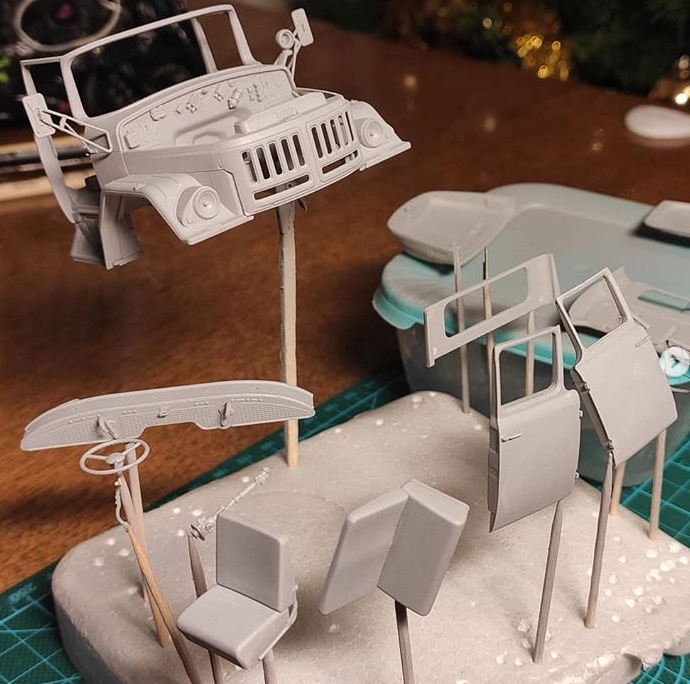 А после того, как прикрепил колеса, то не удержался и прикинул как будет сидеть кунг. В целом, мне очень нравится как смотрится. Несмотря на все косяки, которые я допустил, думаю, что это будет не позорная конверсия. Особенно если учитывать, что это будет моя первая в жизни конверсия и в целом третья модель в моей модельной карьере.